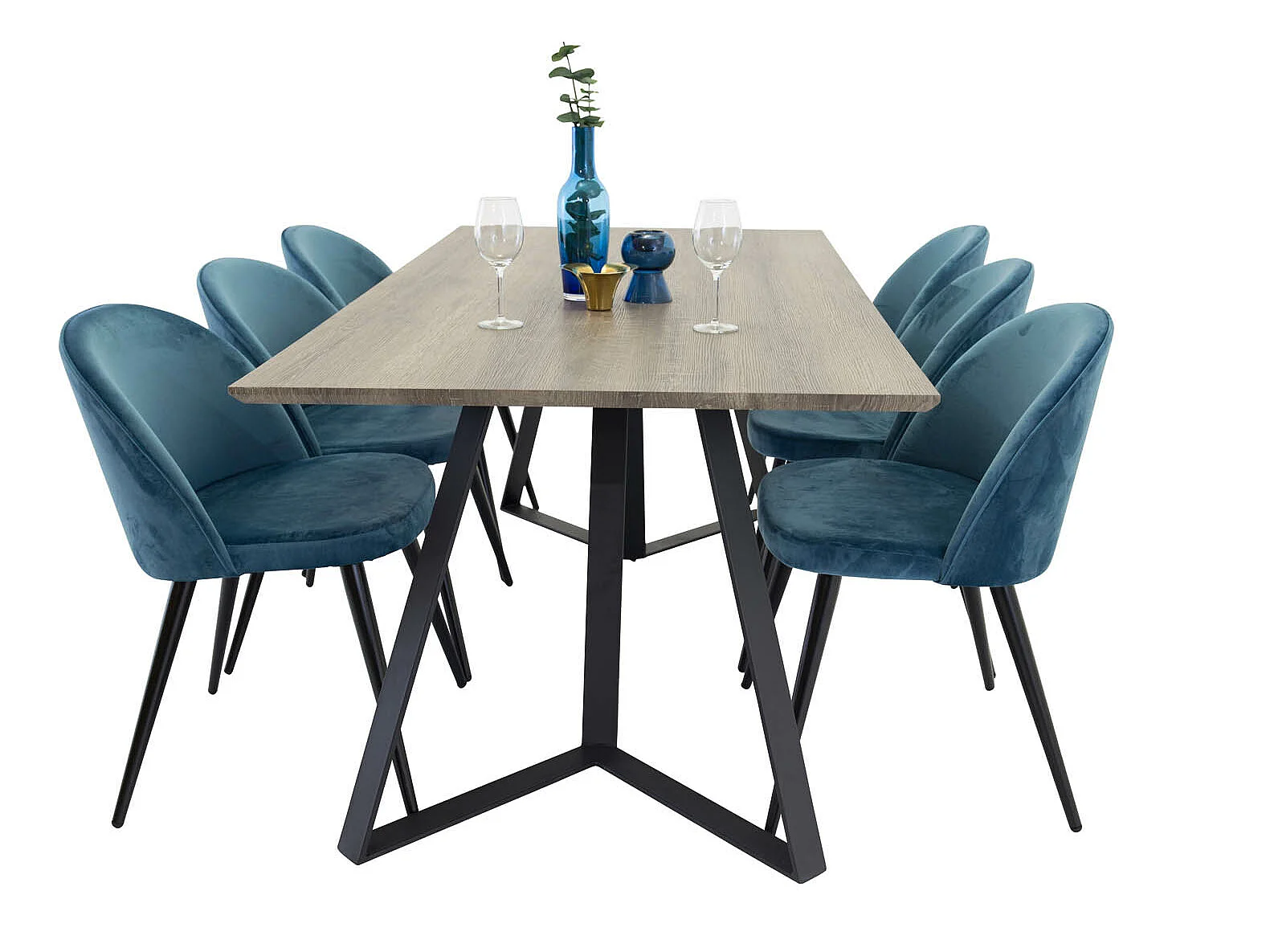 MarinaGRBL ensemble table, table El bois décor gris et 6 Velvet chaises Velours bleu, noir.