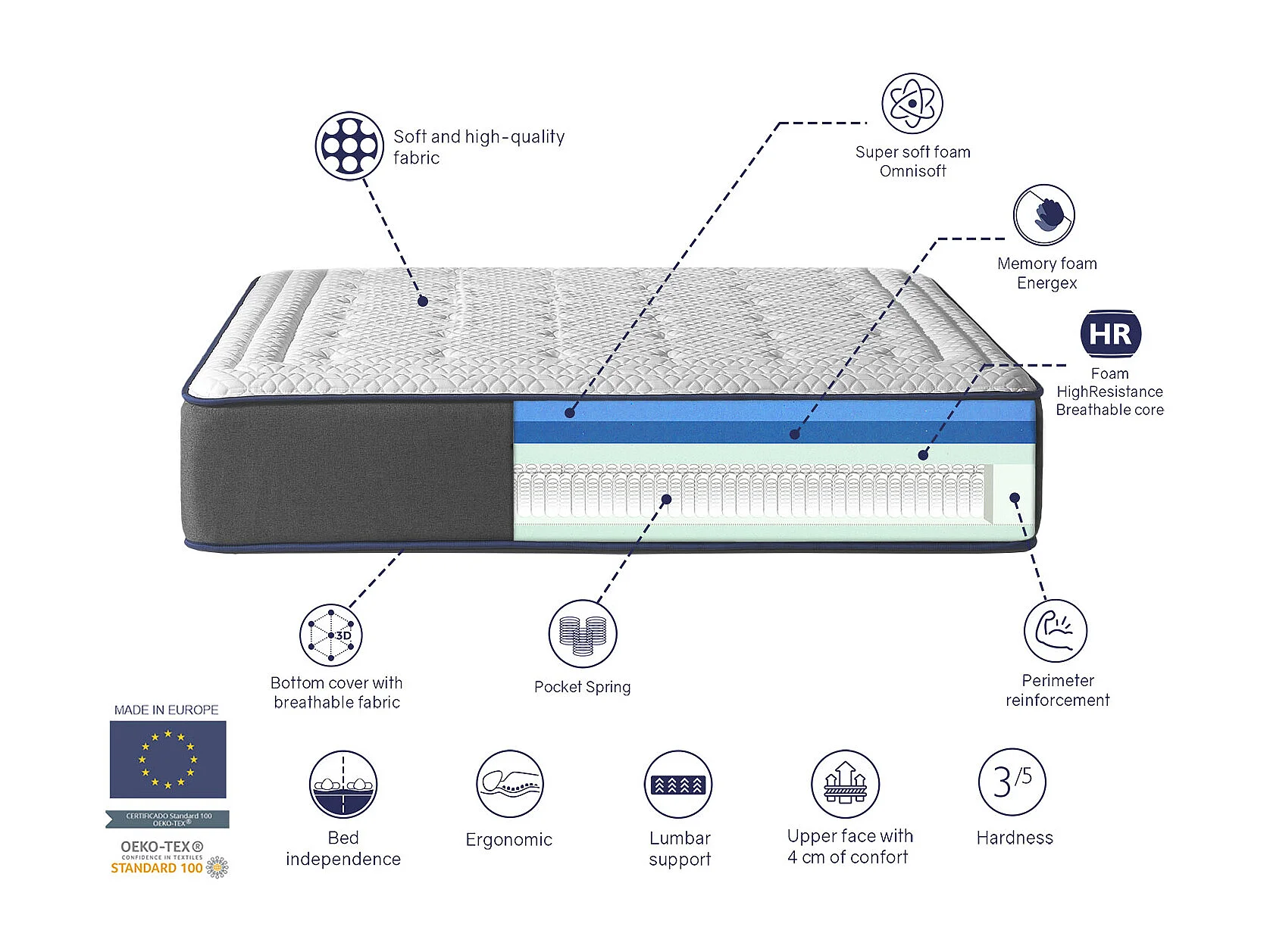 Matelas à ressorts ensachés SHAULA OLYMPO SPRING 160x200 cm Hauteur 30 cm avec 2 cm de mousse à mémoire de forme