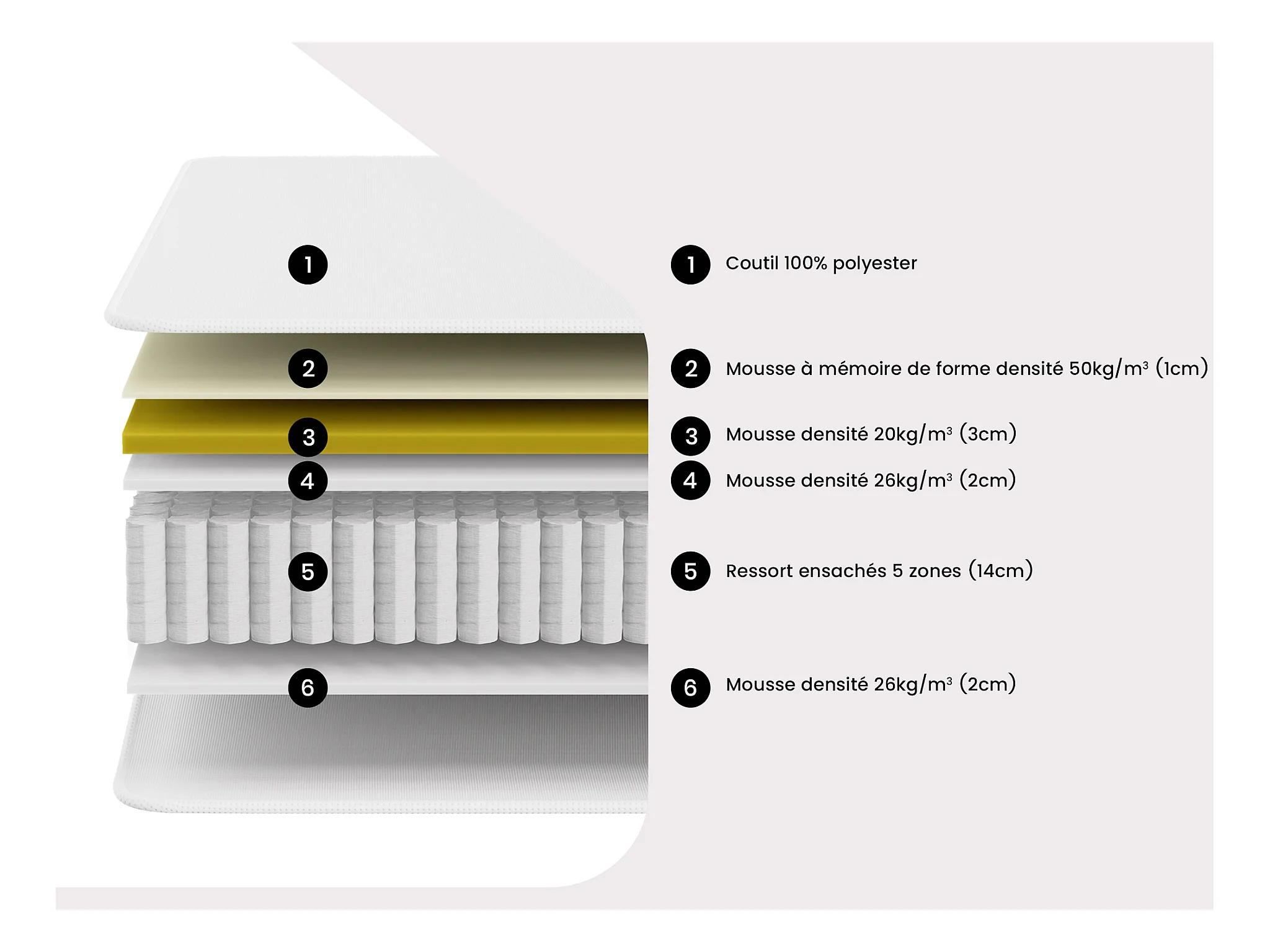 Matelas 180 x 200 cm ressorts ensachés 5 zones accueil mémoire de forme ép.23cm - BABYLONE de YSMÉE