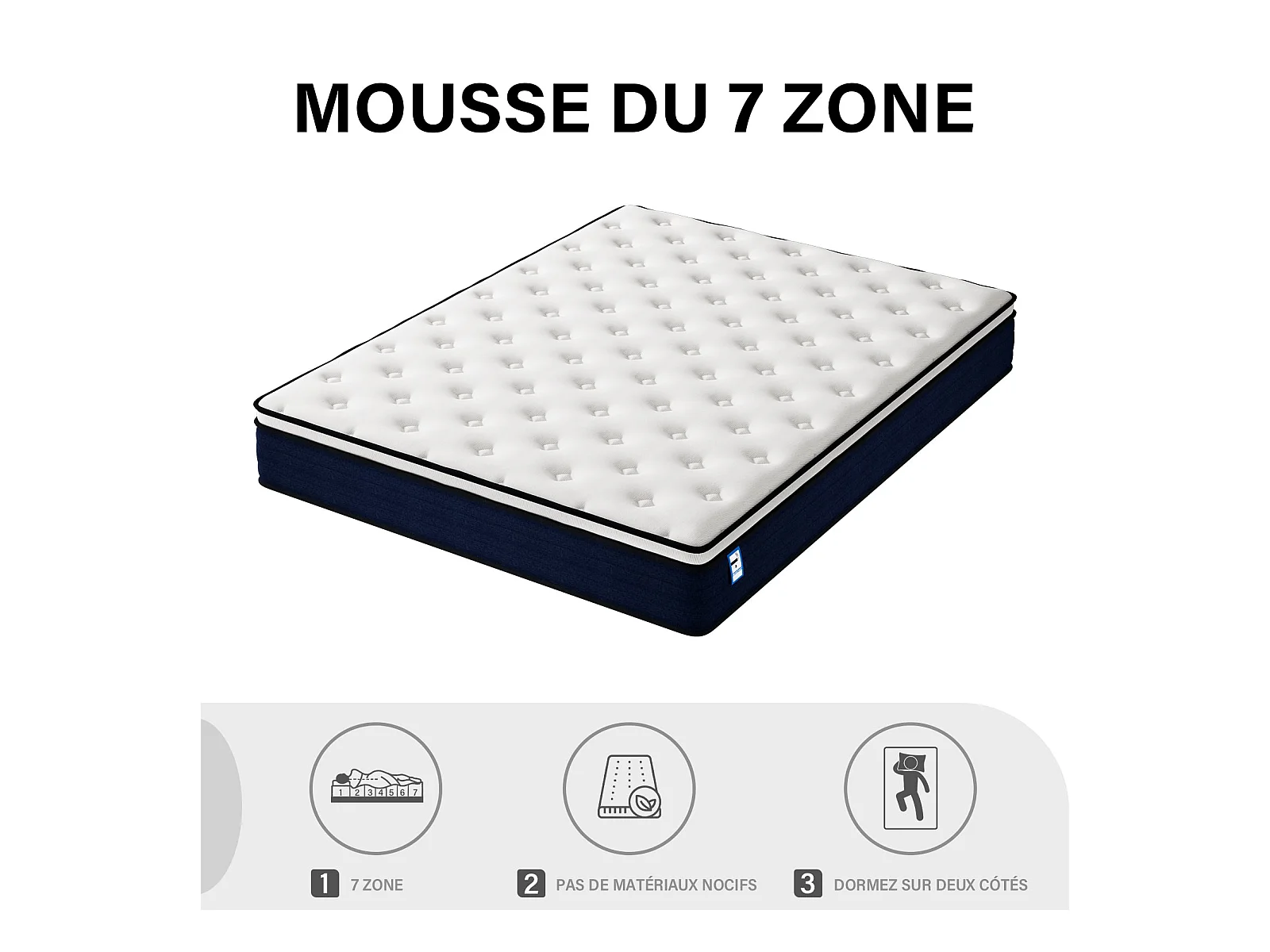 Matelas à ressorts 140x200 cm, mousse froide 7 zones, ressorts ensachés, certifié Oeko-Tex, matelassé microfibre, fermeté H3, hauteur 25 cm