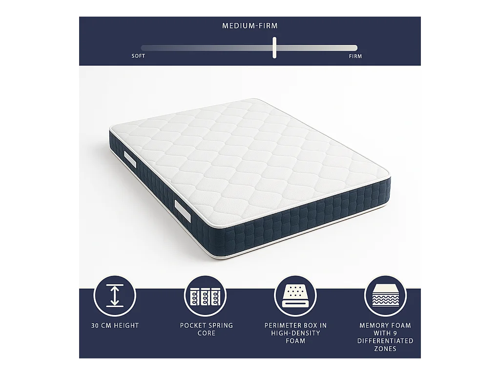 Matelas 140x200 ressorts ensachés + mémoire | H25 cm | Fabriqué en Italie