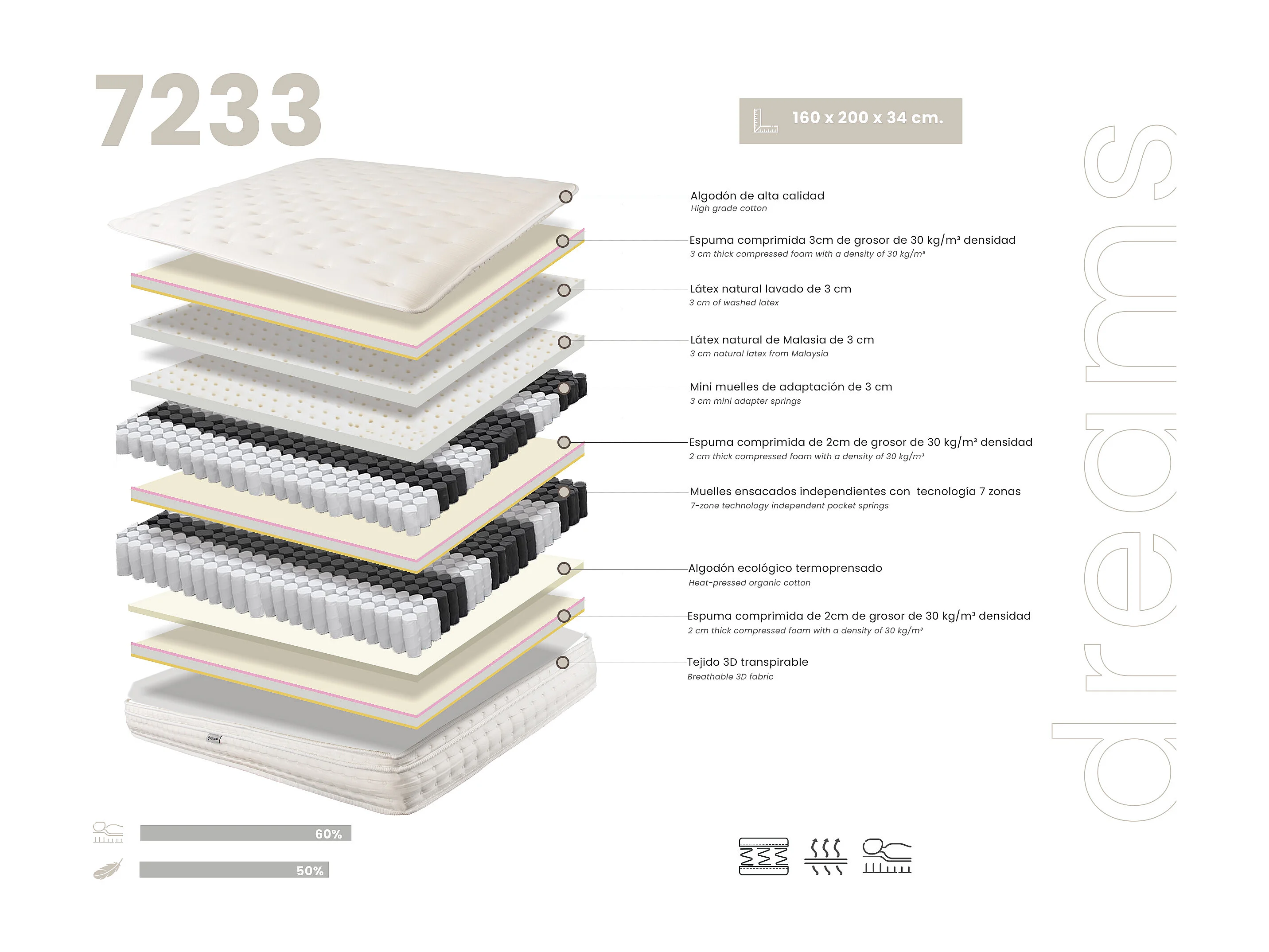 Matelas hybride en latex naturel avec mini ressorts et ressorts ensachés 7 zones 160x200 7233 ANGEL CERDA
