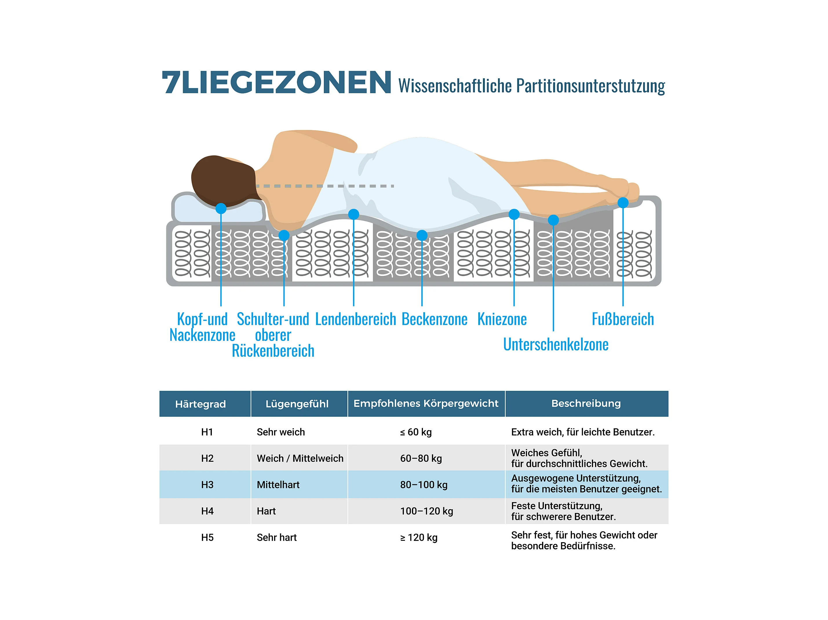 Matelas à ressorts ensachés, 7 zones en mousse froide, 140x200cm, certifié Oeko-Tex, housse en microfibre, 100 nuits d'essai, fermeté H3, 25cm