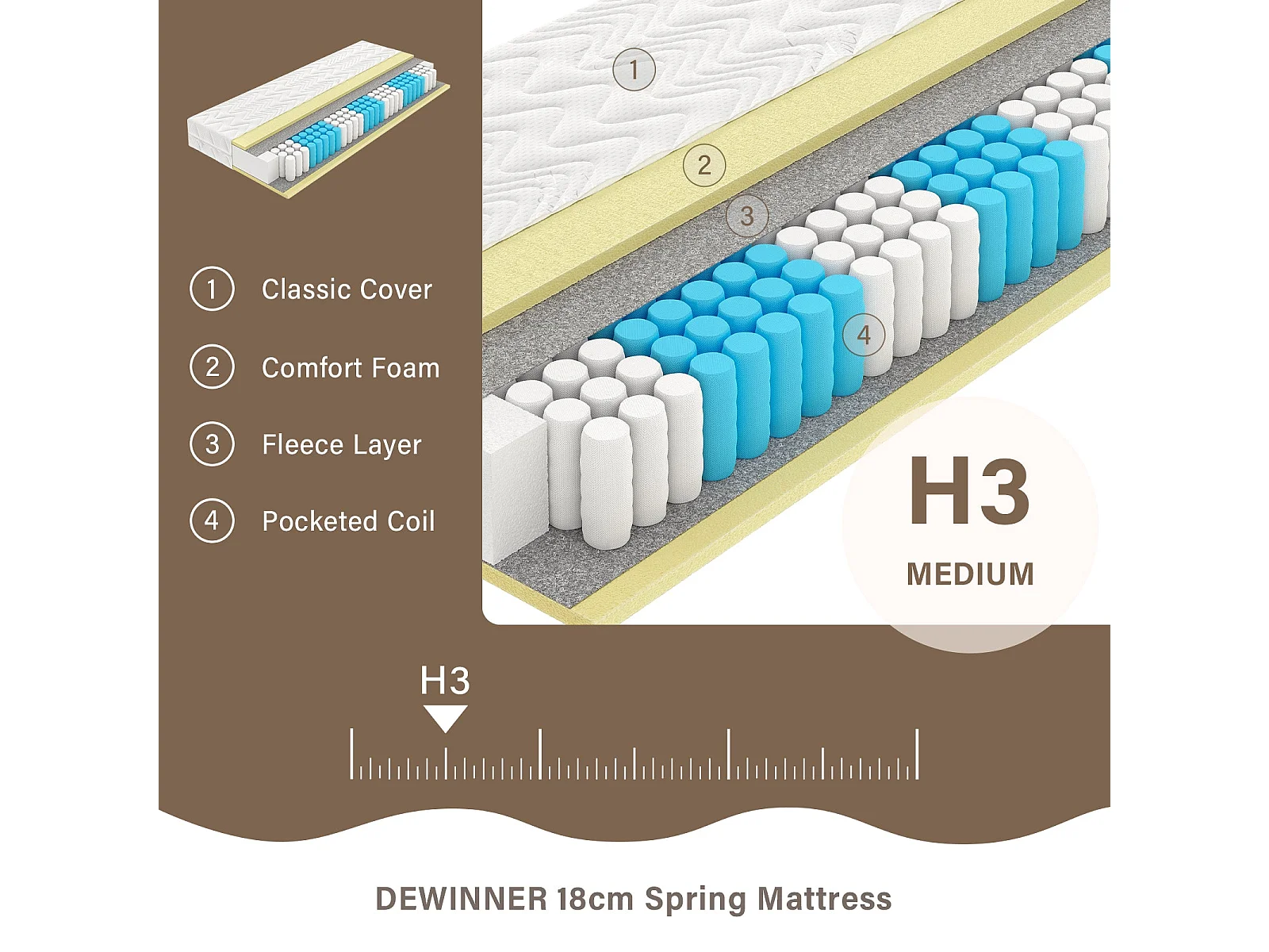 Matelas140 x 190cm Matelas à Ressorts ensachés dureté H3,Hauteur 18 cm