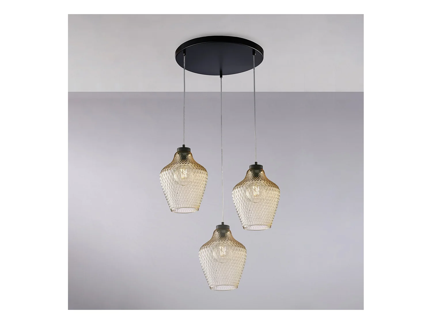 Suspension Maya fer noir, câbles orientables, verre soufflé ambré à décor en relief, 3 lumières d.47 cm, look chaleureux