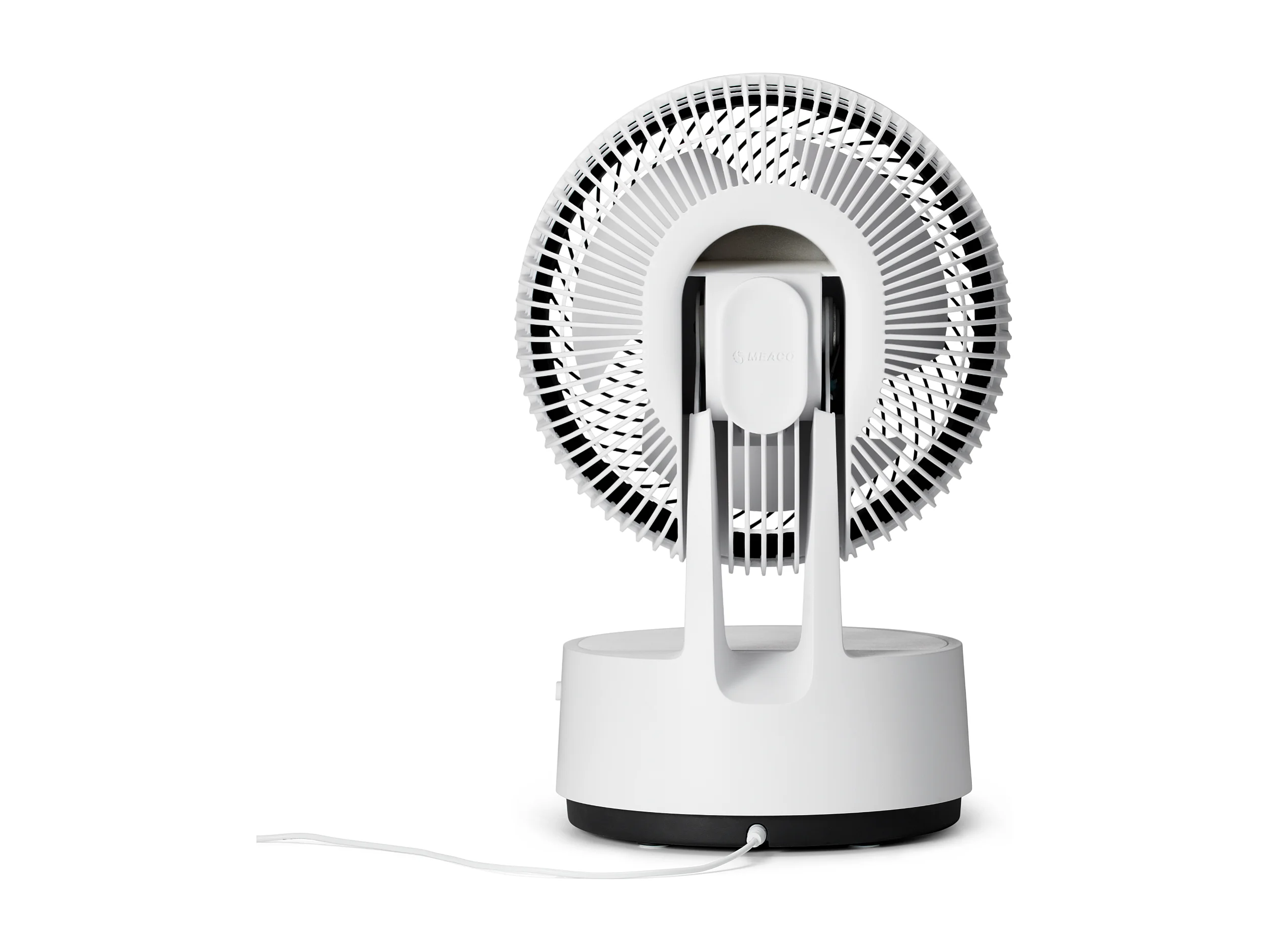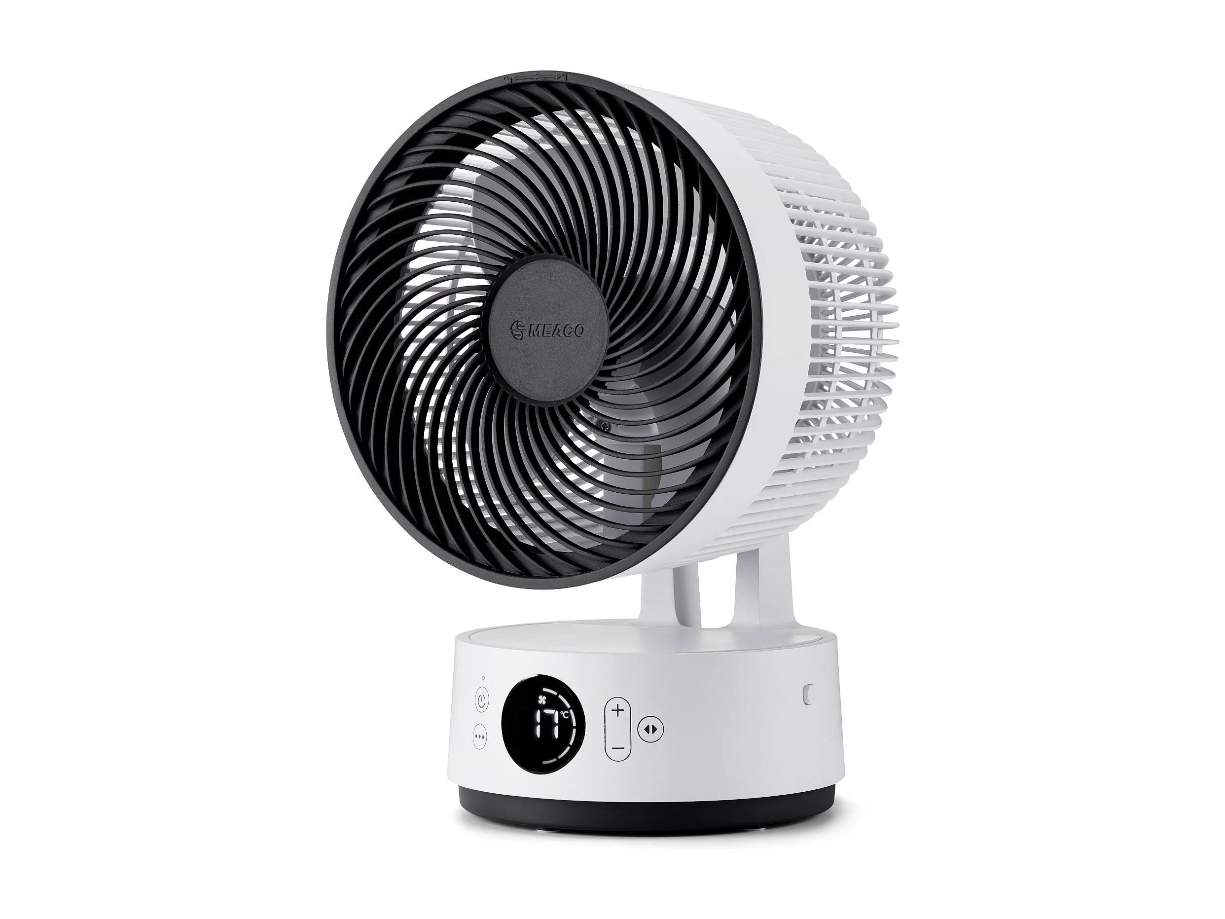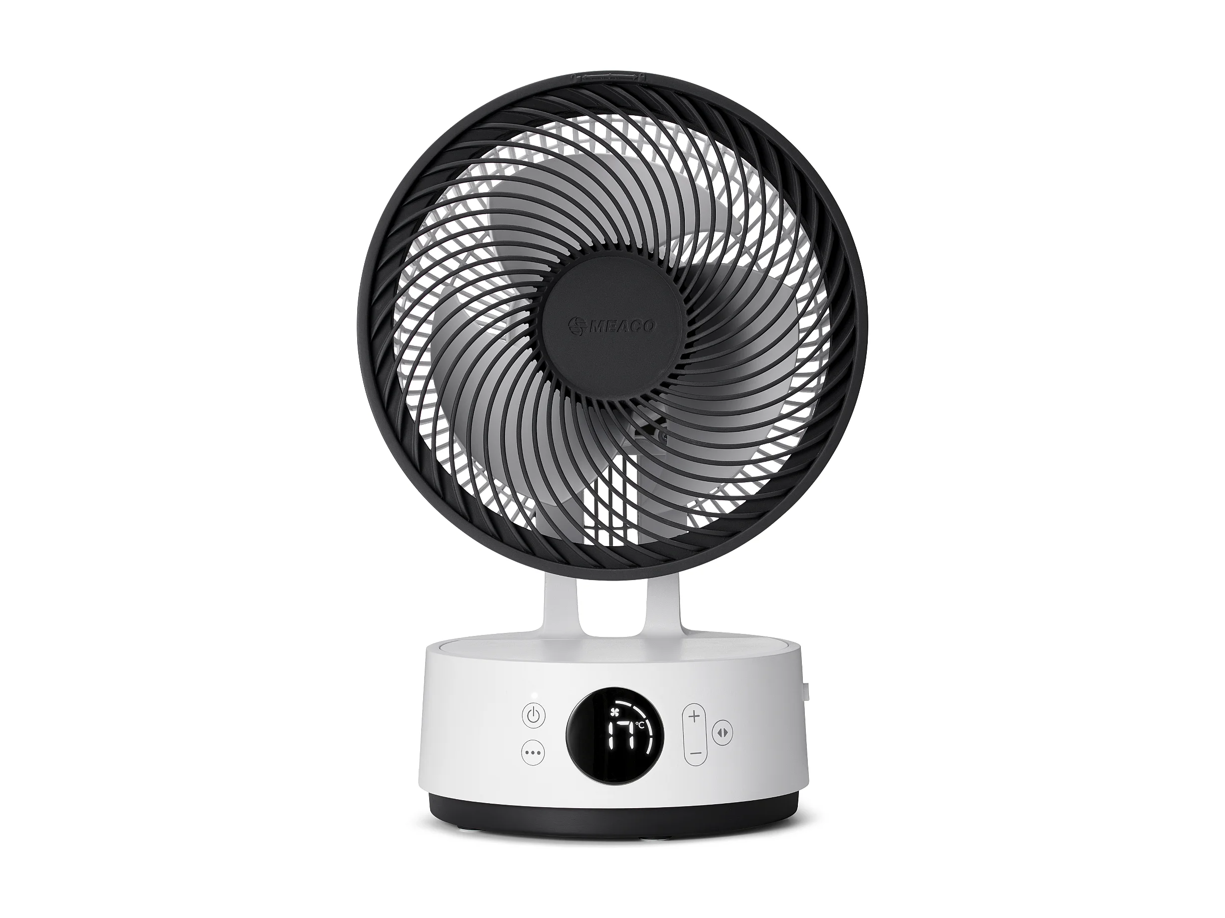 Ventilateur de table silencieux MEACO MeacoFan Sefte 10", moteur sans balais, oscillation H/V et télécommande lumineuse blanche.
