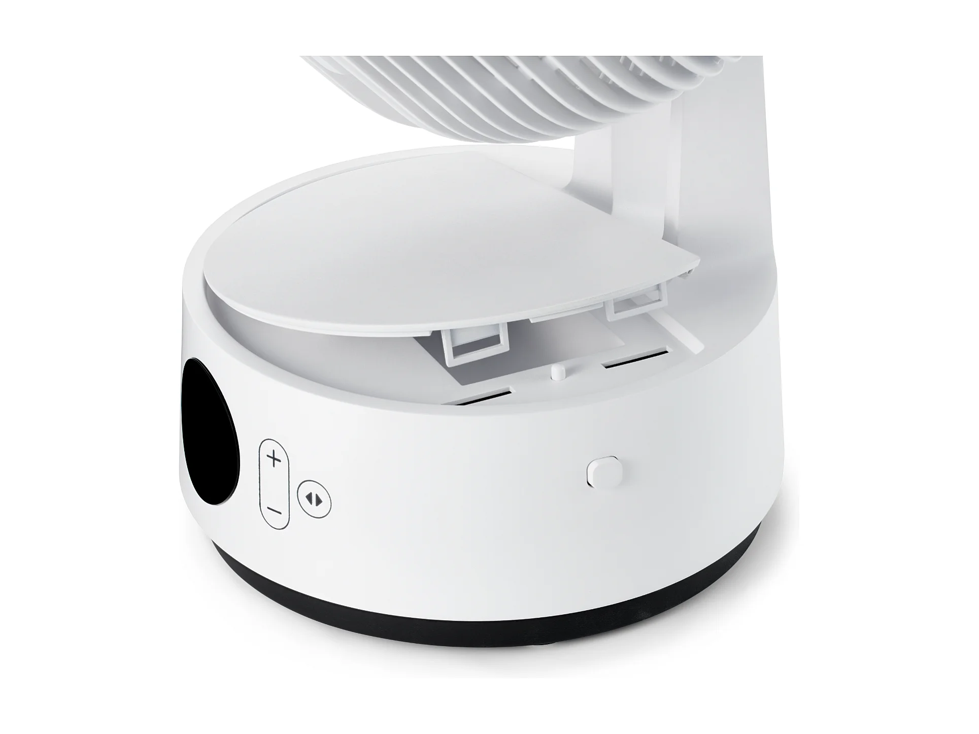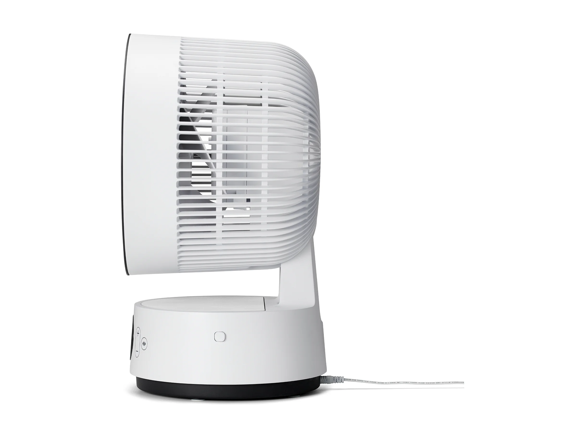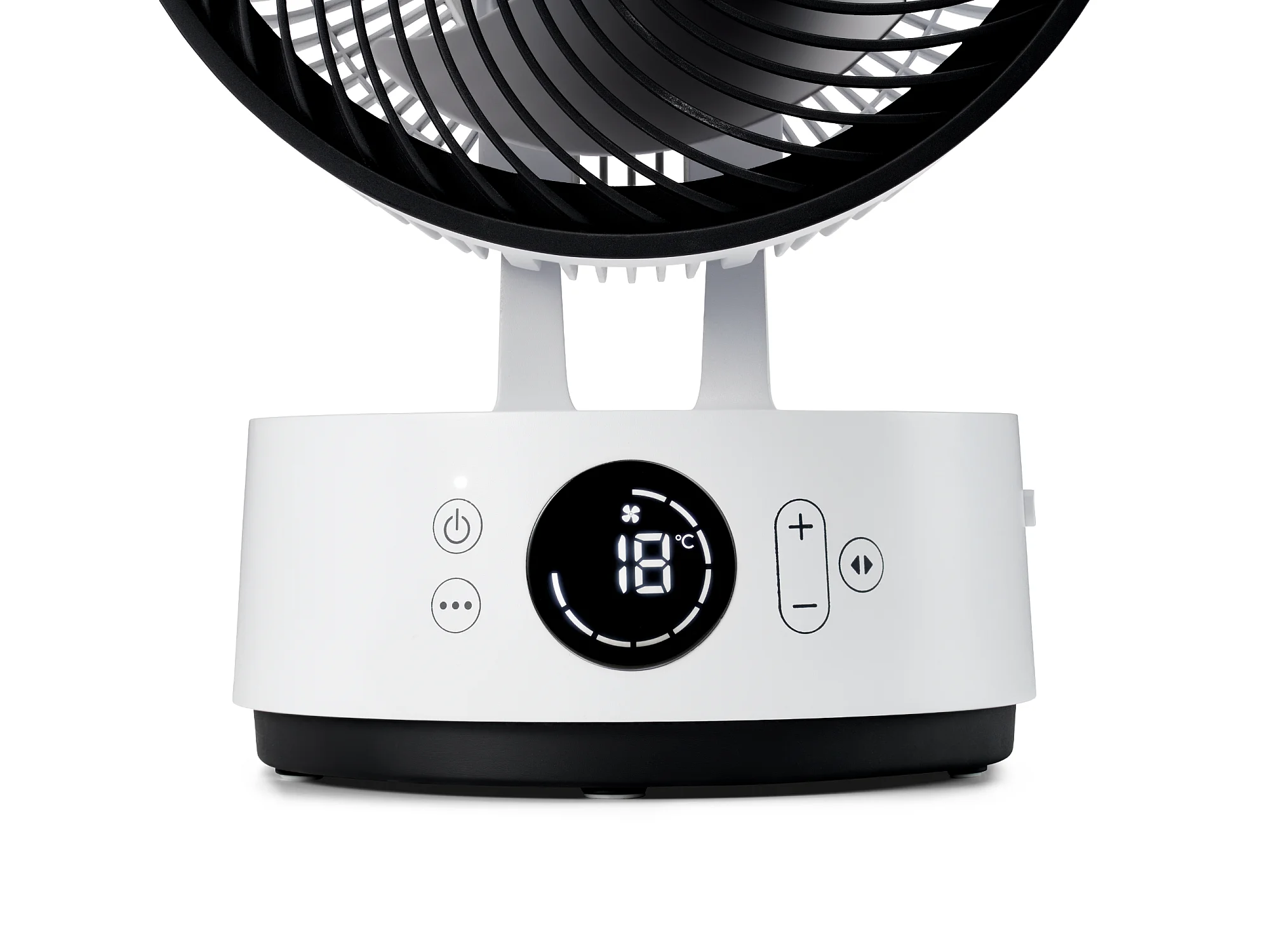Ventilateur de table silencieux MEACO MeacoFan Sefte 10", moteur sans balais, oscillation H/V et télécommande lumineuse blanche.