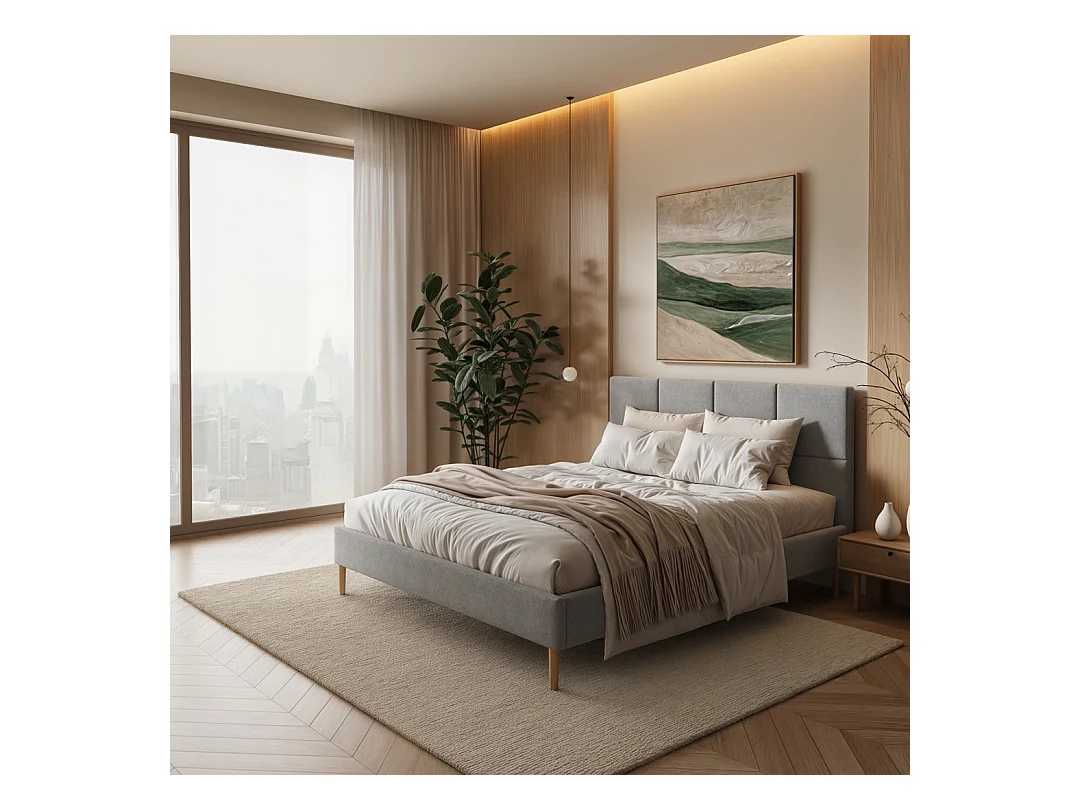 Lit gigogne 140 x 200 cm - avec bande lumineuse LED - avec sommier à lattes - MDF + lin - Gris