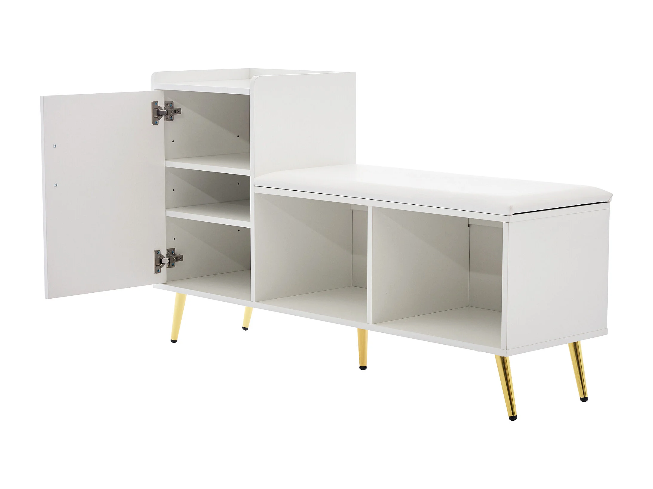 Meuble à chaussures 120x35x71.5 cm 1 porte siège rembourré et rangement ouvert en bois - pieds en métal - blanc haut brillant