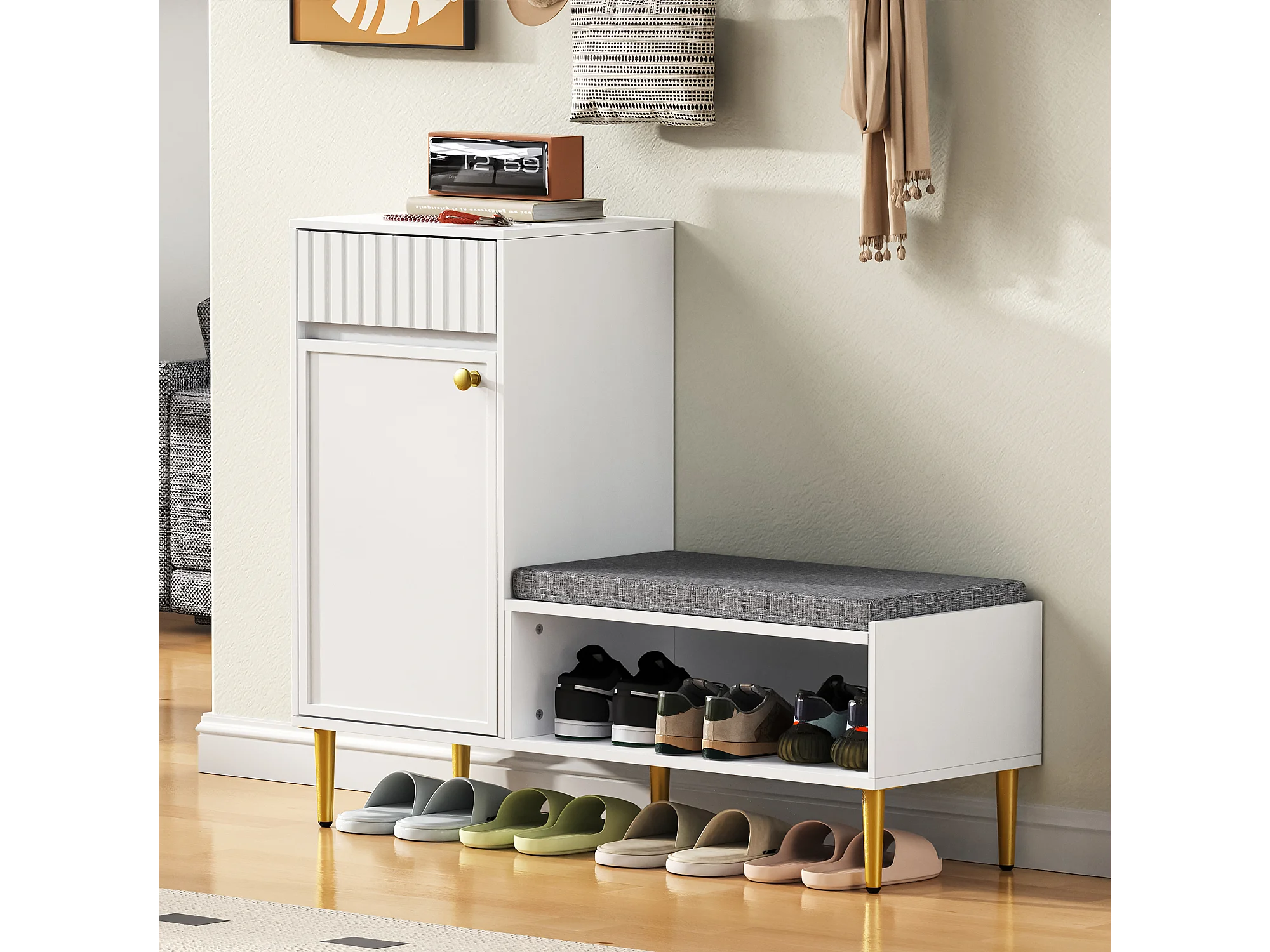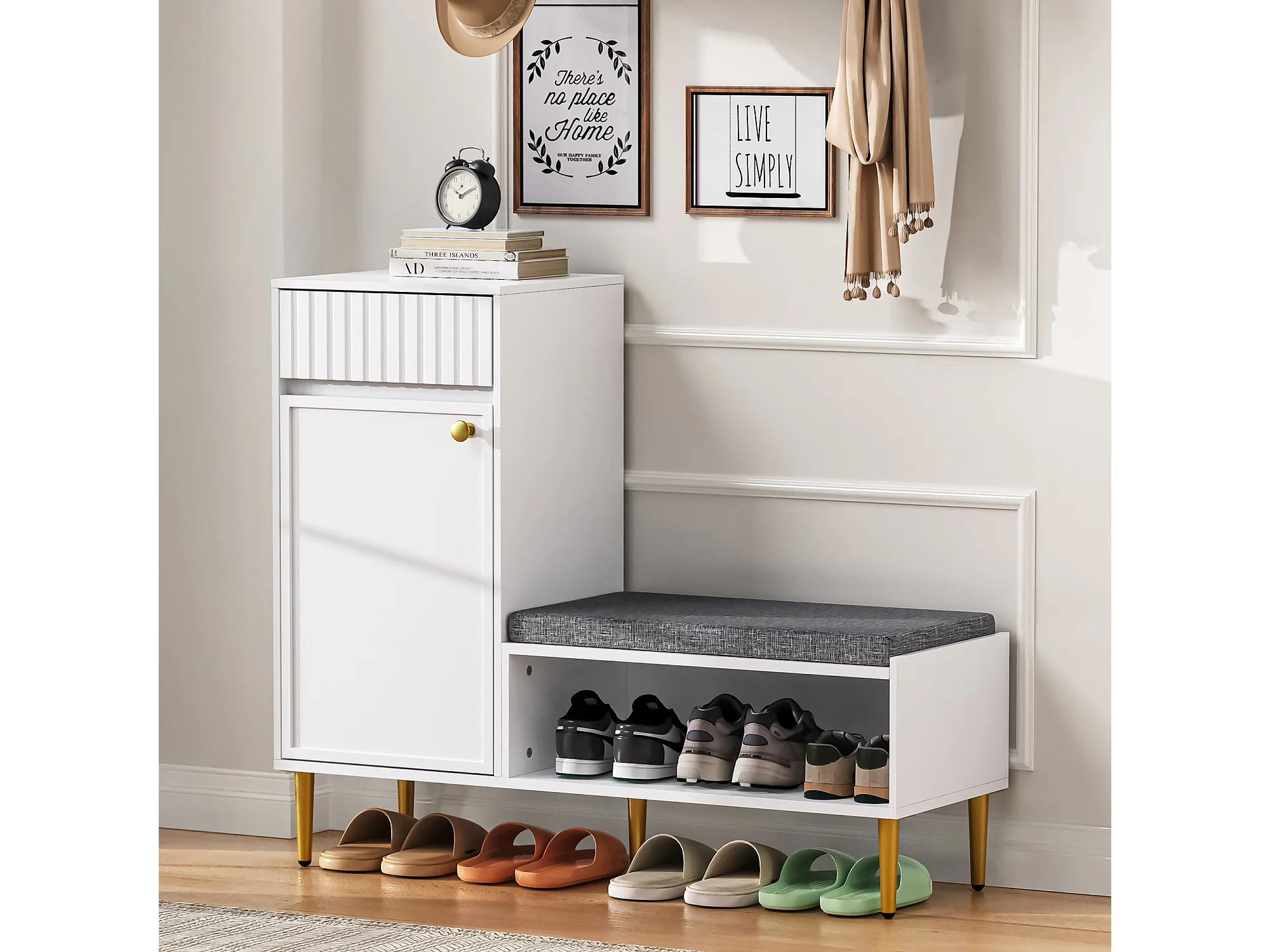 Banc à chaussures avec 1 porte, 2 niches et coussin - panneaux de particules et métal doré - Blanc - 120 x 35 x 68.5 cm