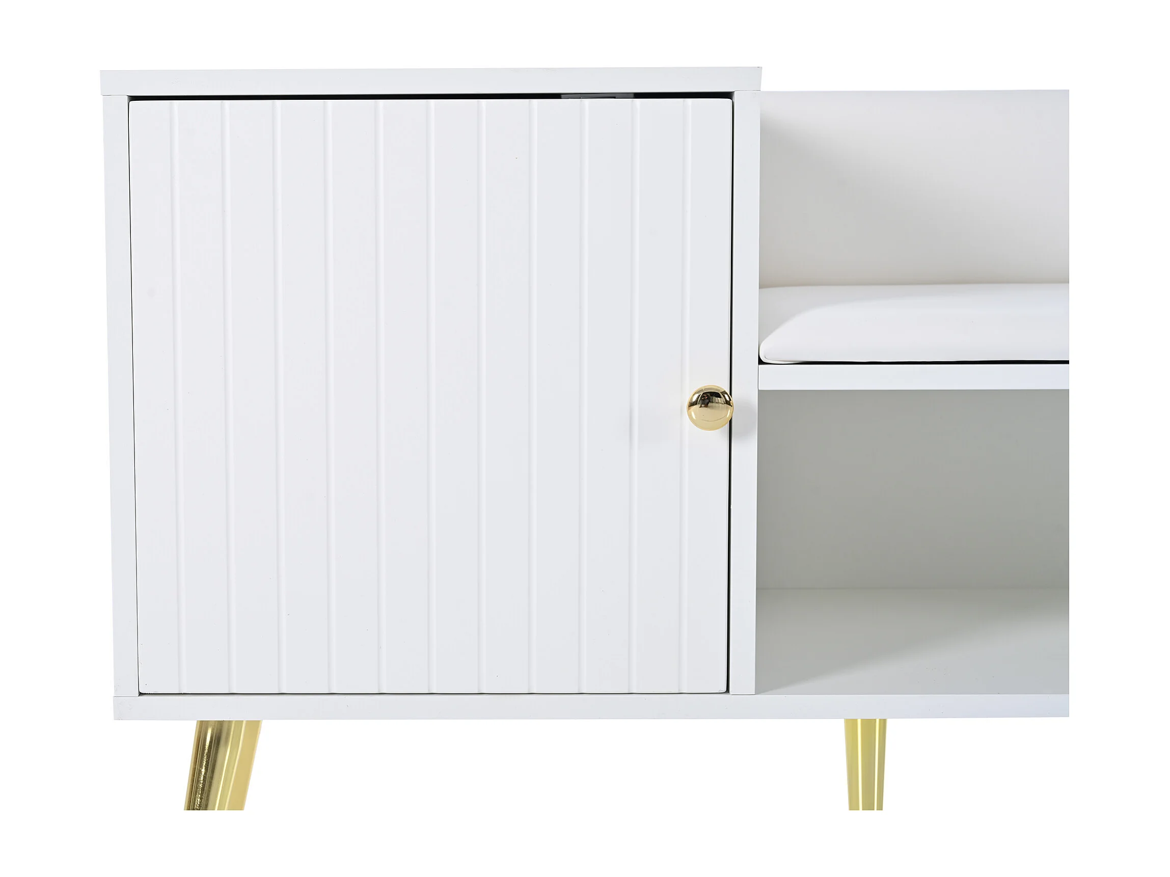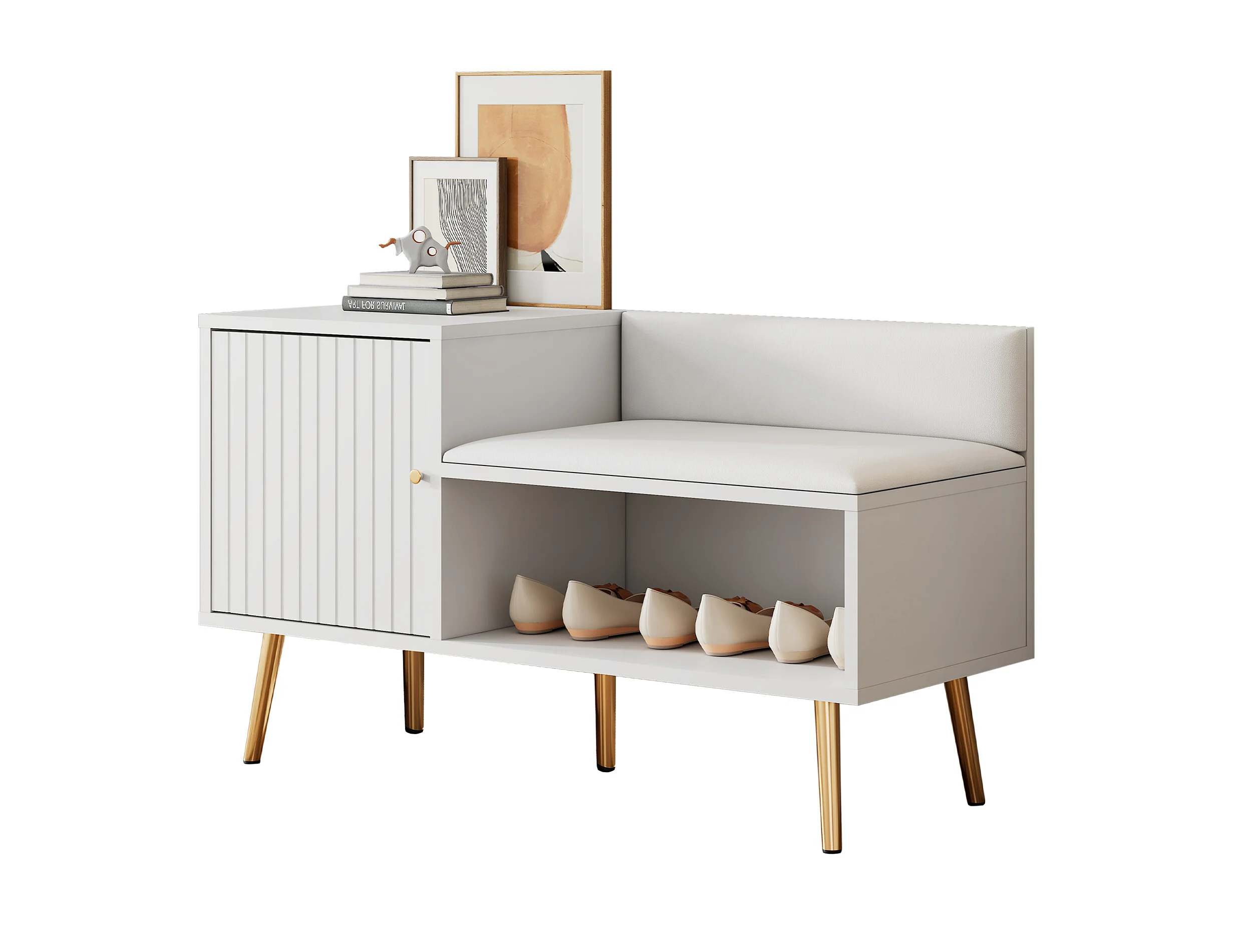 Banc à chaussures 100x38x58 cm, grand rangement, assise rembourrée et dossier, pieds métalliques, panneau de particules blanc