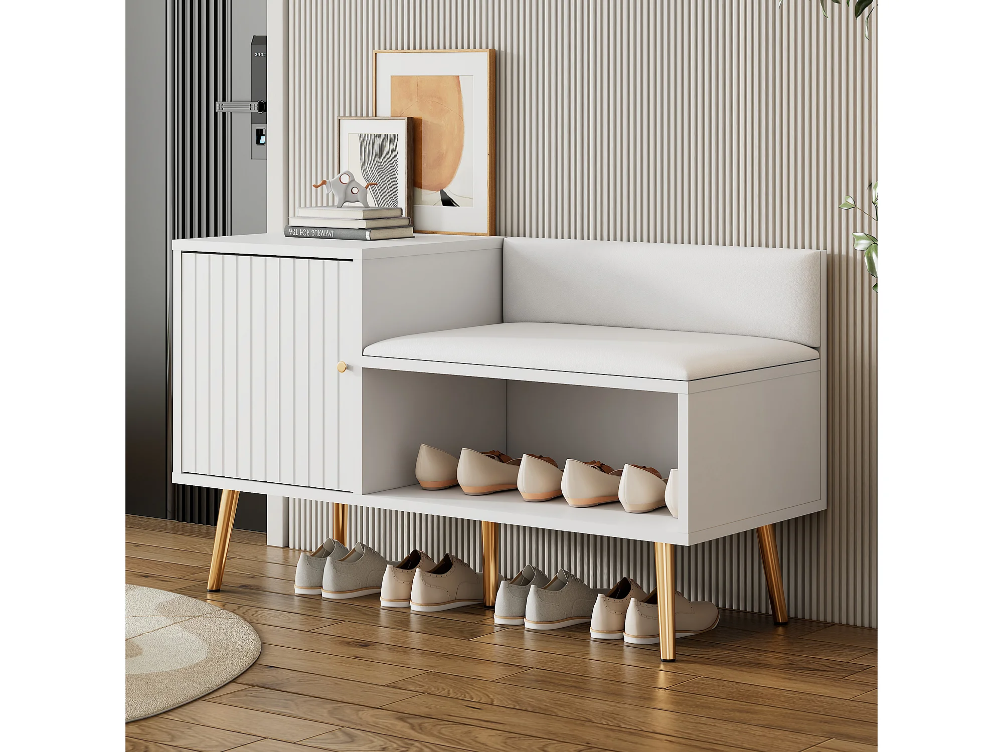Ensemble vestiaire d'entrée 120x23.5x191.5 cm, rangement multifonction, banquette, panneaux striés brillants, panneaux de particules blanc