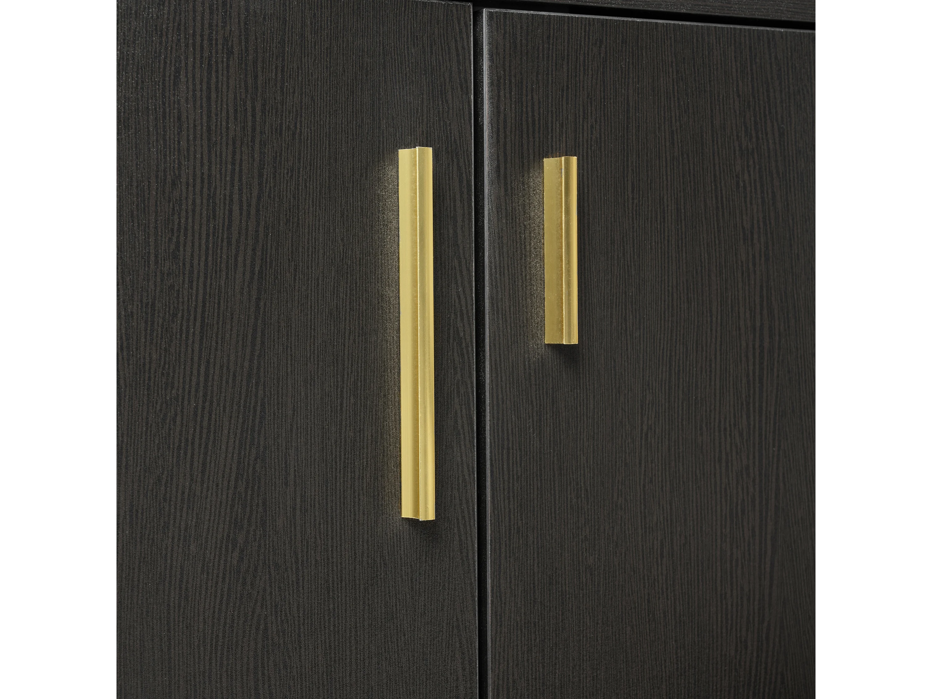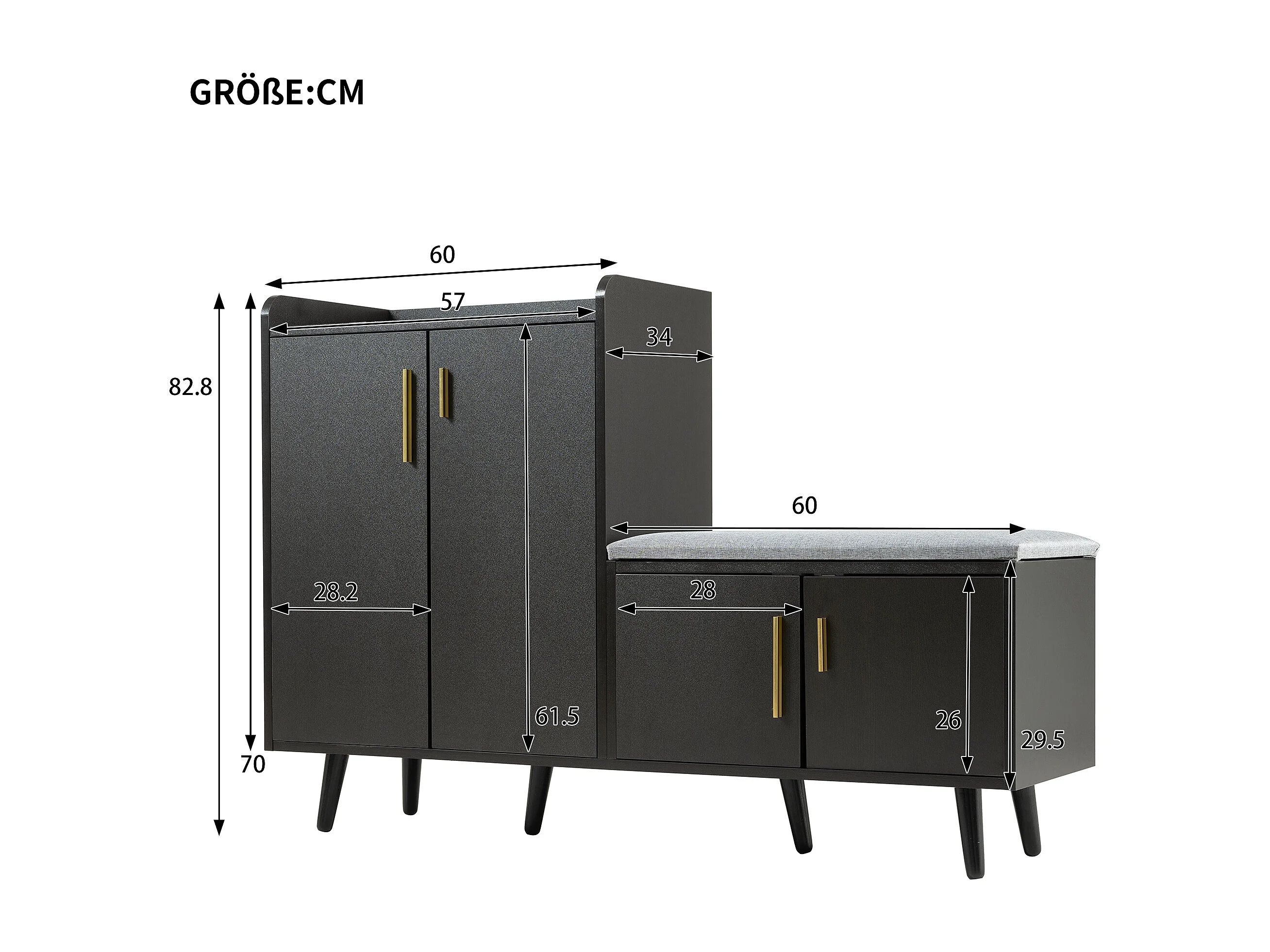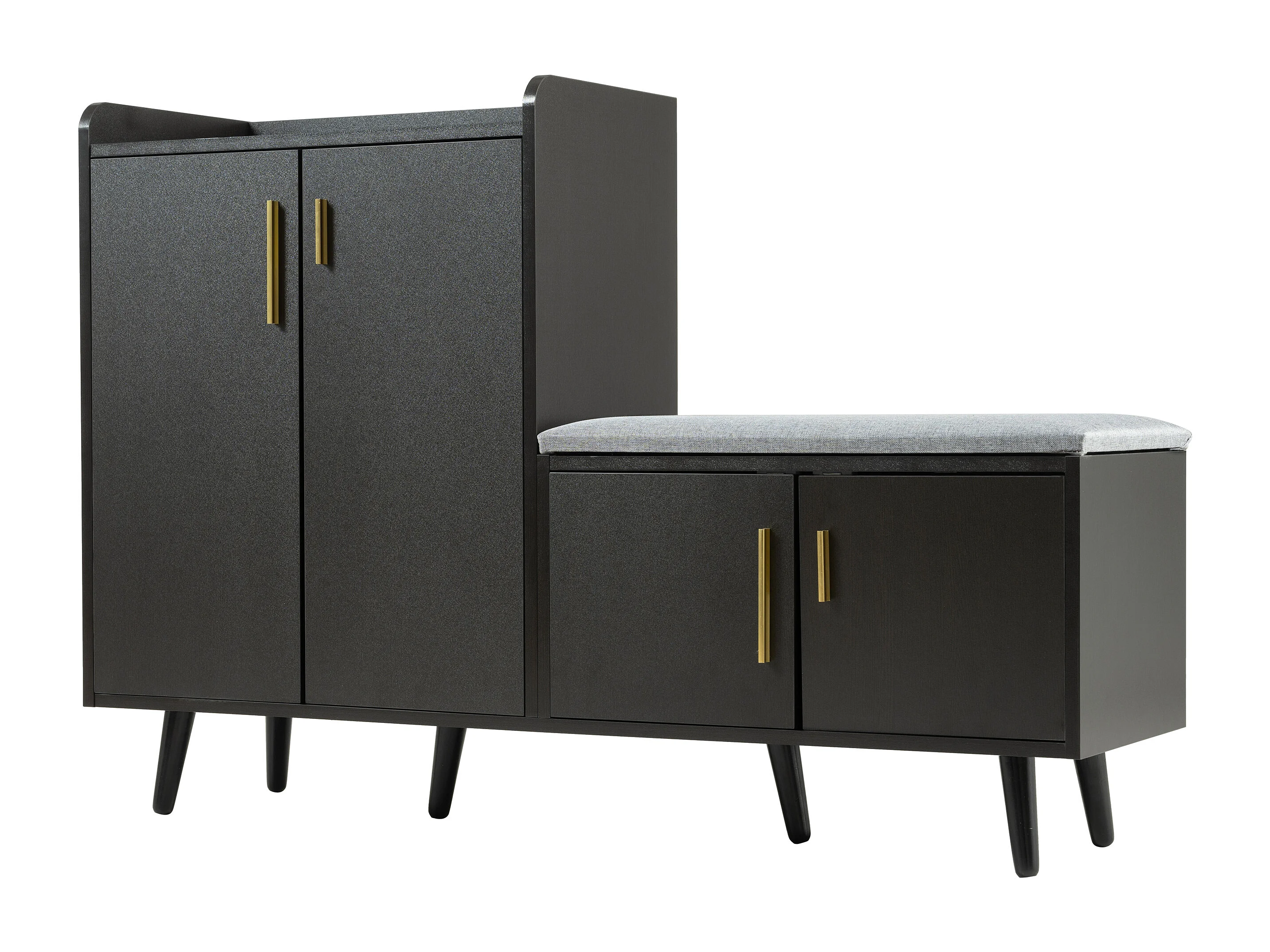 Meuble à chaussures 120x34x82 cm, assise rembourrée, 4 portes, poignées métalliques asymétriques, panneau de particules, noir et noyer foncé