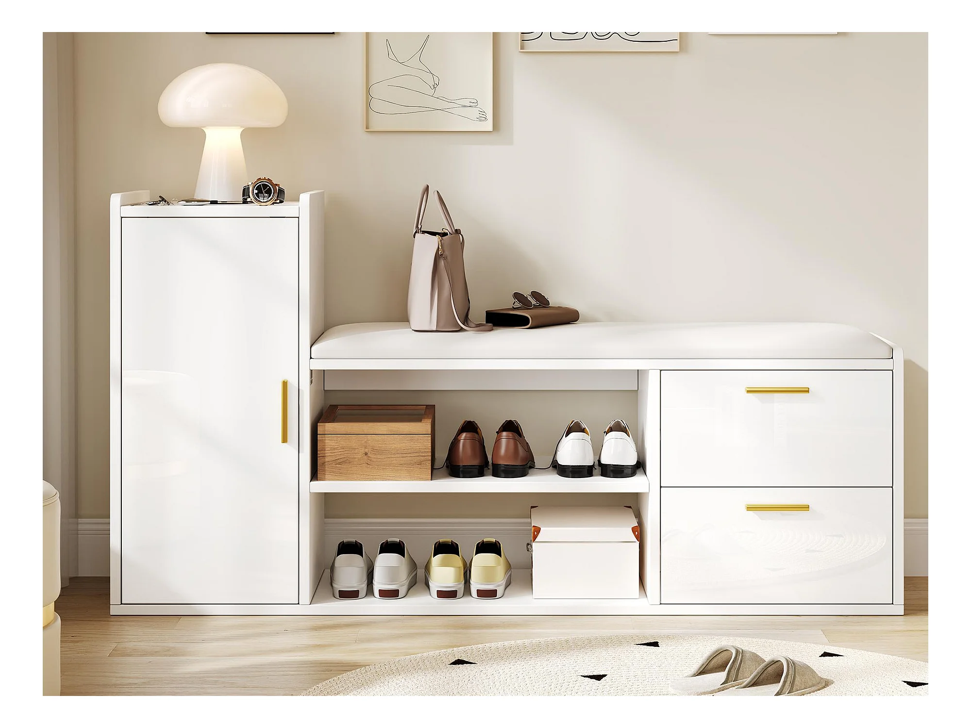 Meuble à chaussures 128x30x68cm - avec 2 tiroirs et 1 porte - avec banc à chaussures - Finition brillante - Blanc
