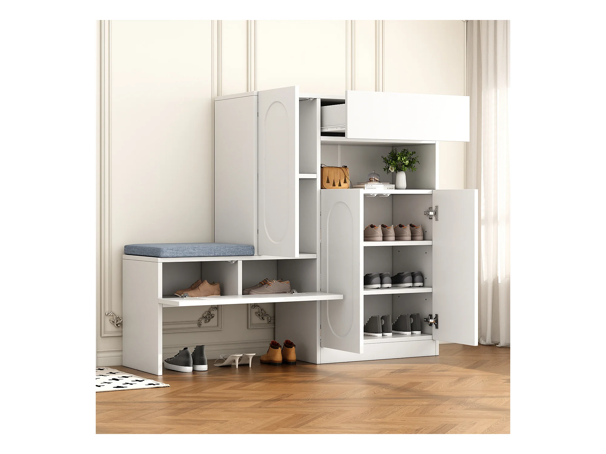 Meuble à chaussures 2-en-1 avec portes arquées, fonction Soft-Close, étagères réglables et banc rembourré, blanc (130x35x110 cm)