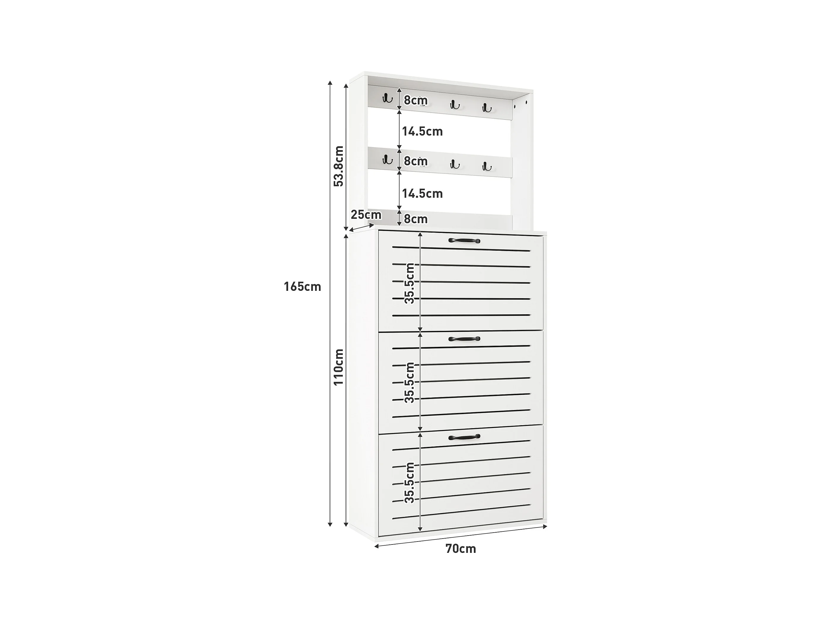 Meuble à chaussures 70x25x165cm - avec 8 crochets - avec 3 portes - panneaux de particules - blanc