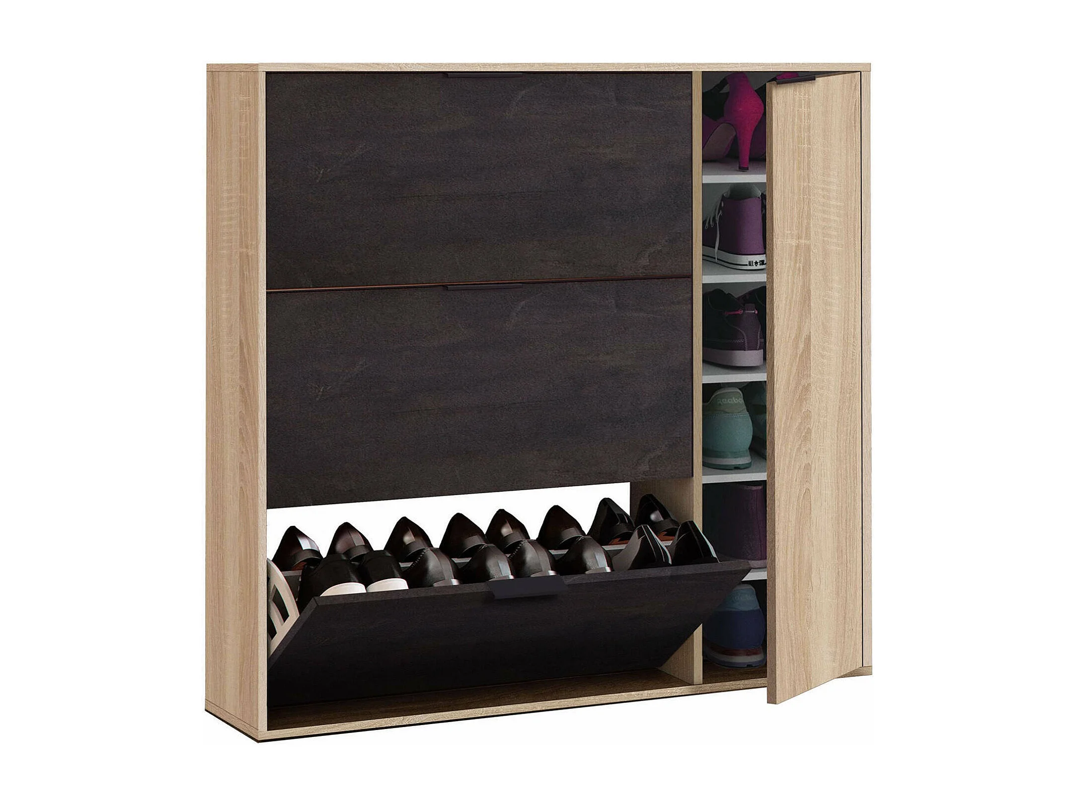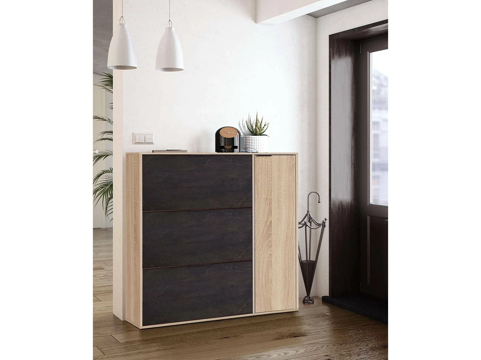 Étagère à chaussures Dmagnino, armoire à chaussures 4 portes, armoire basse polyvalente avec 5 étagères, étagère à chaussures moderne, 106x22h115 cm, chêne et noir