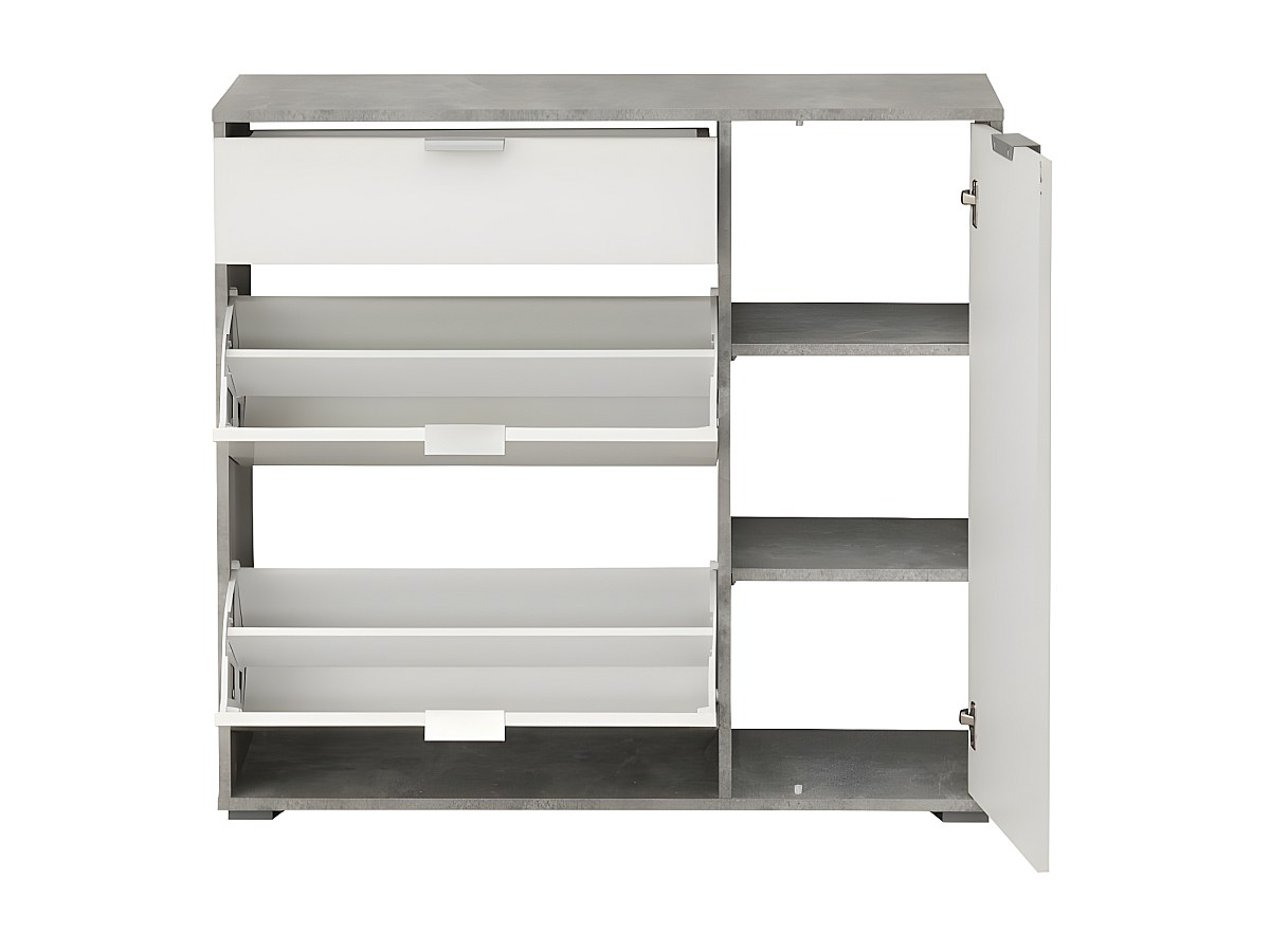 Meuble à chaussures ARIETTA - 2 compartiments, 1 porte & 1 tiroir - Coloris Blanc & béton