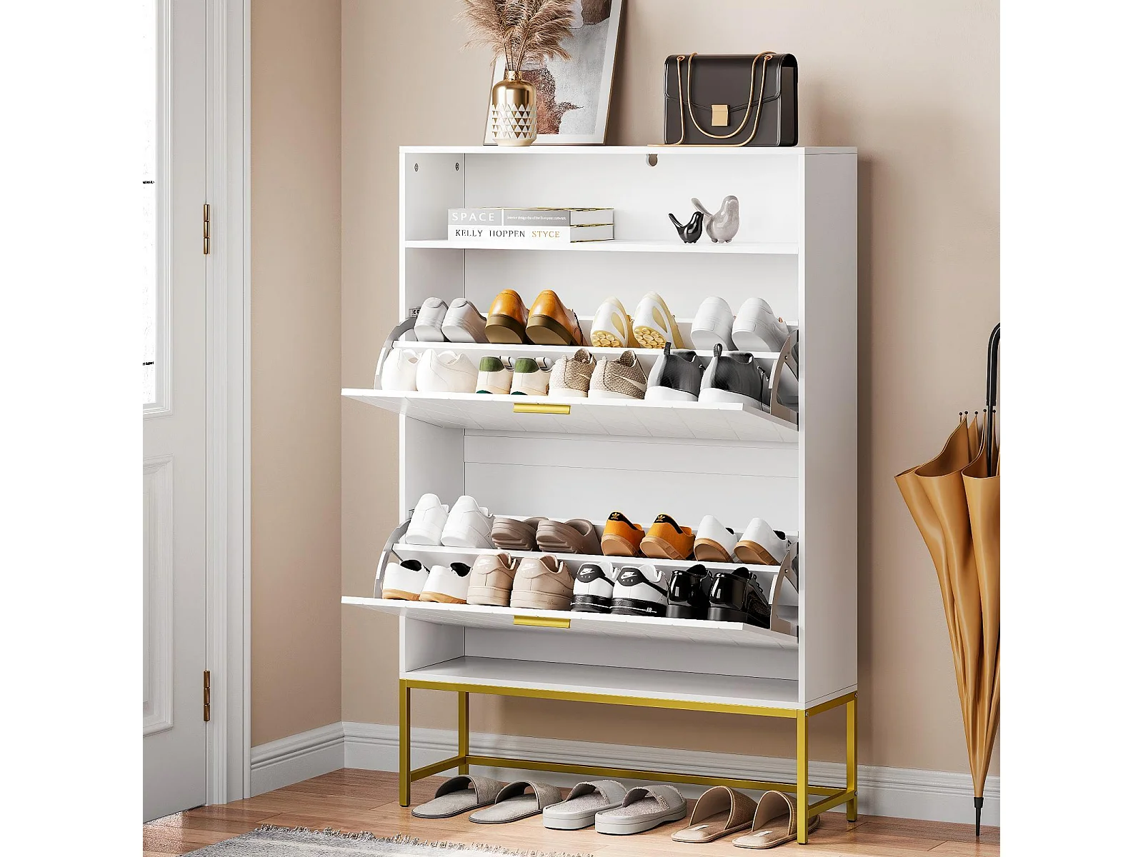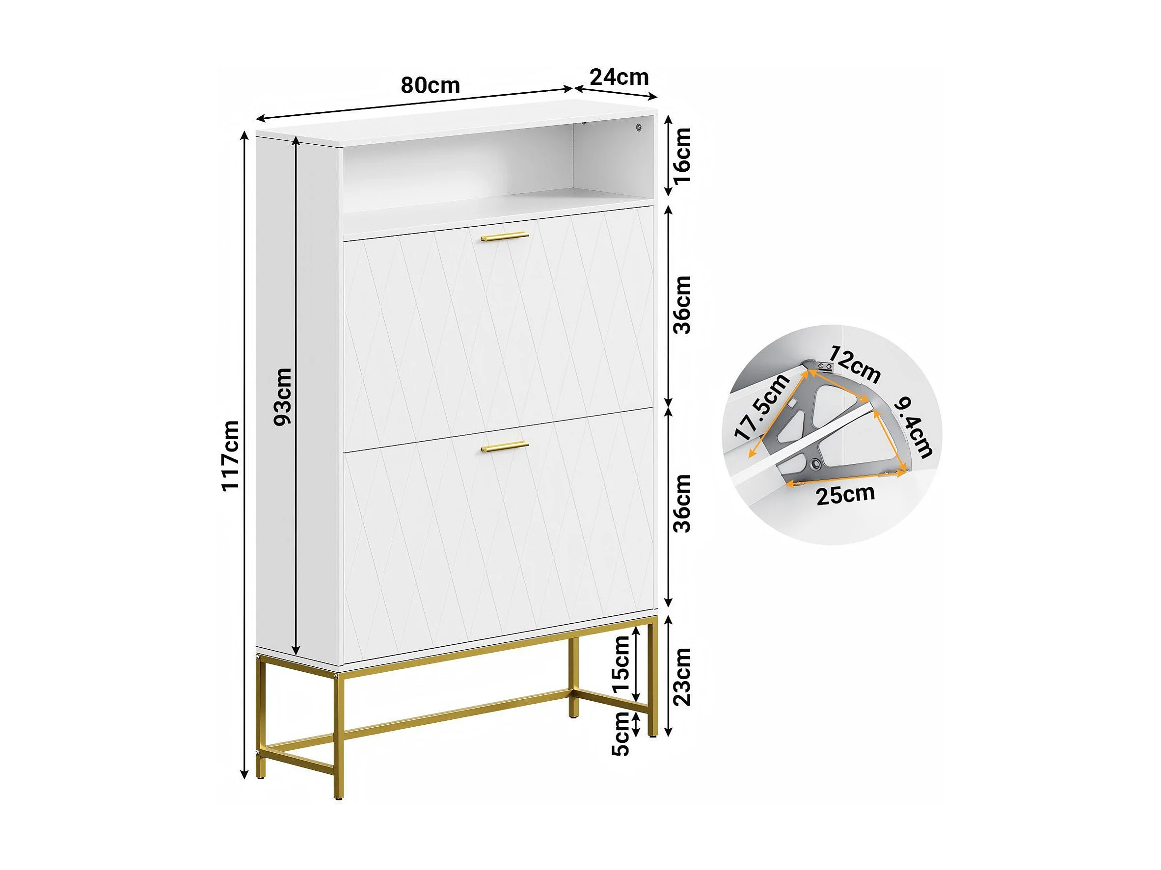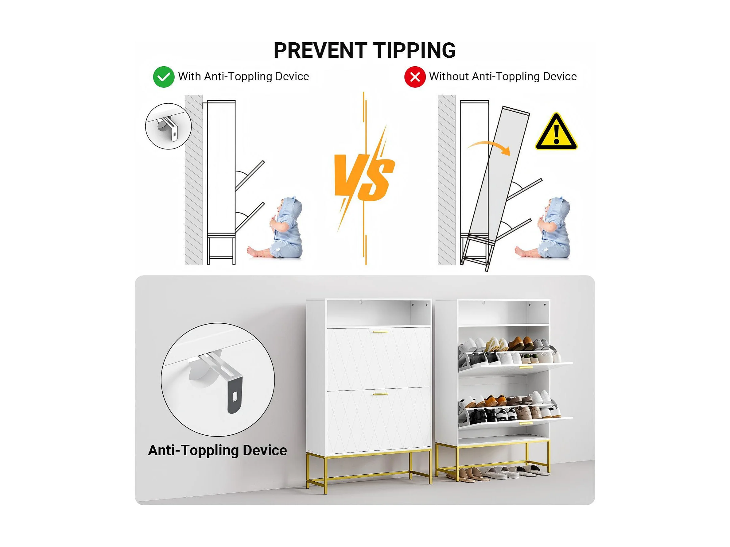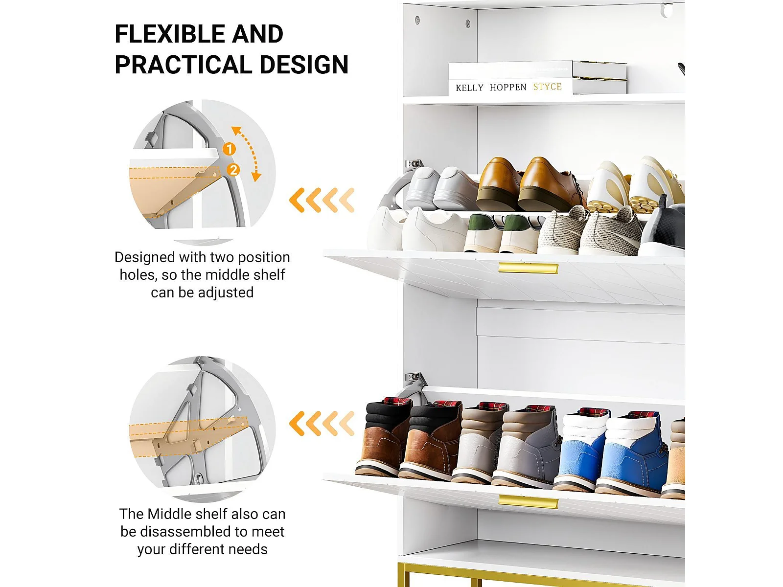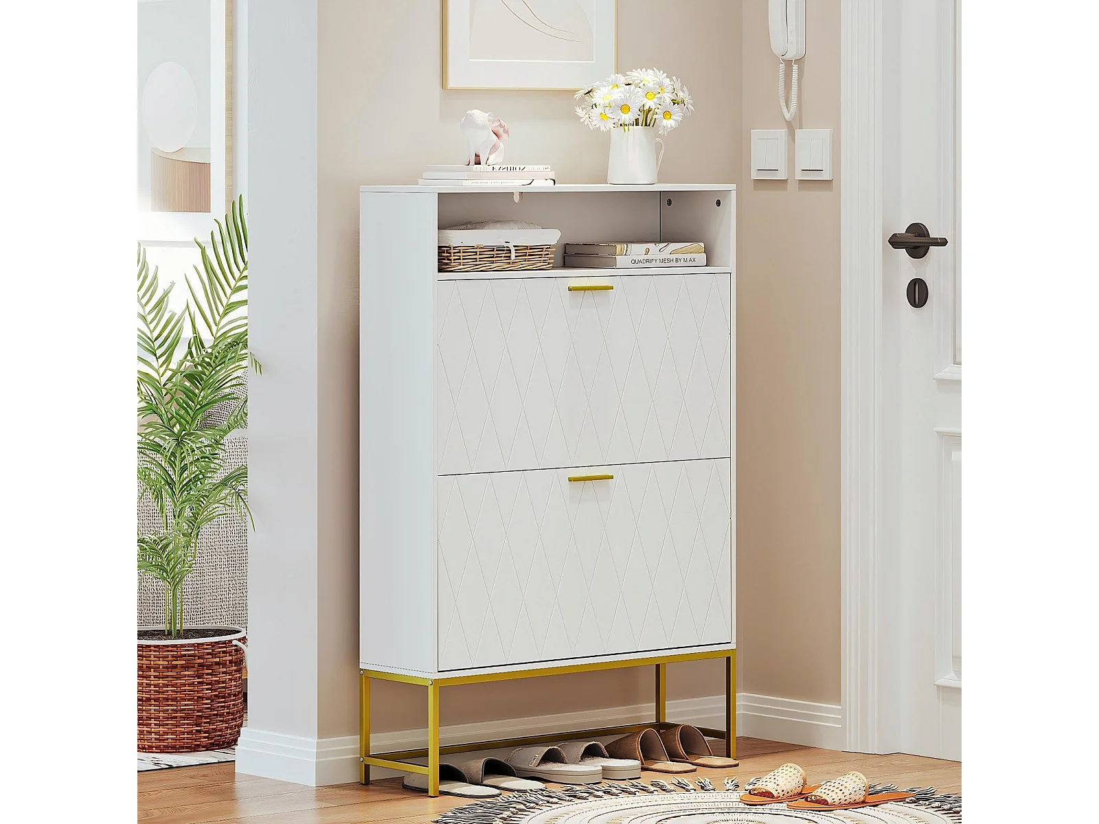 Meuble à chaussures, avec 2 portes abattants et 1 étagère ouverte, conception anti-inclinaison, Blanc, 80x24x117CM