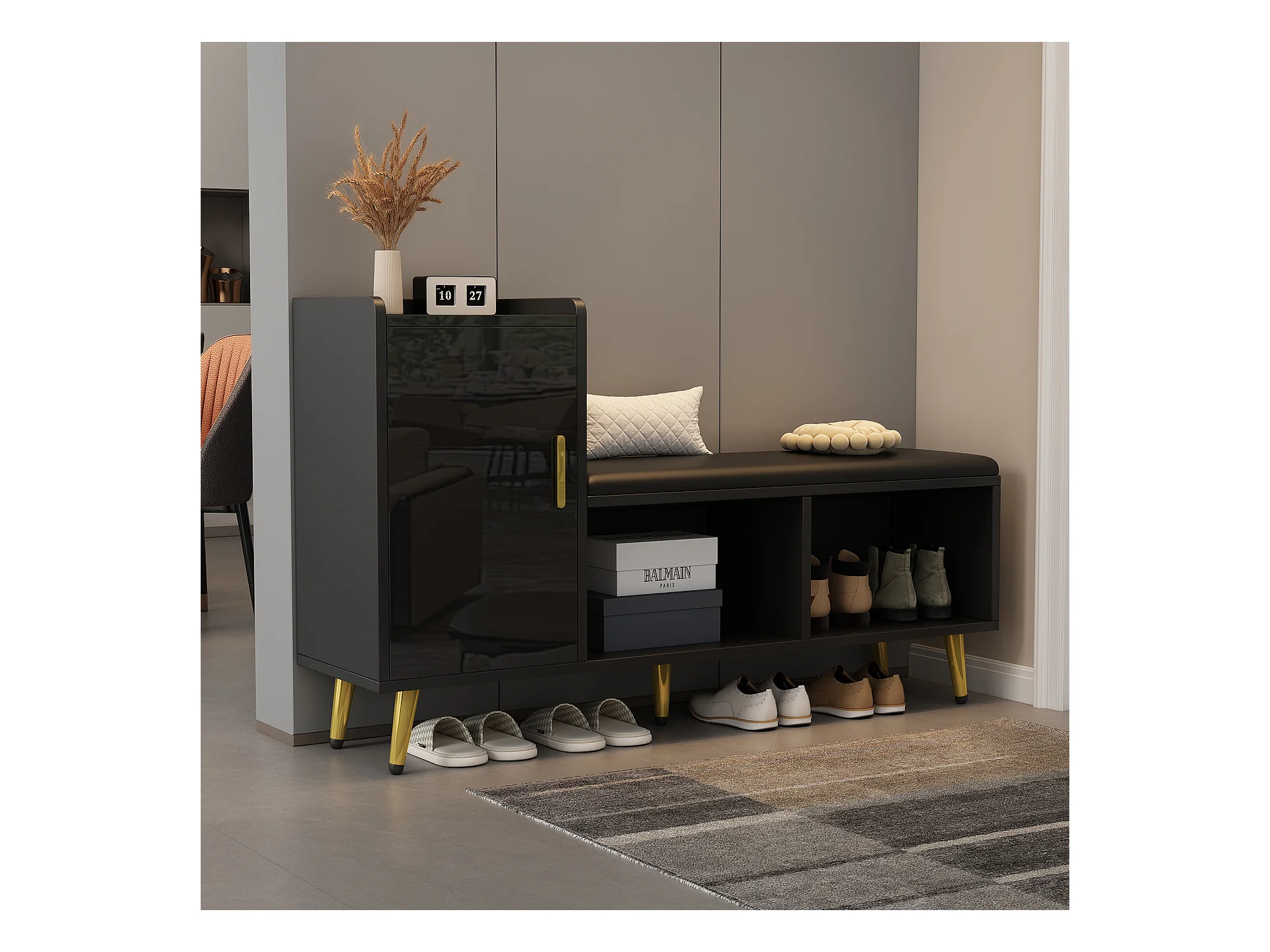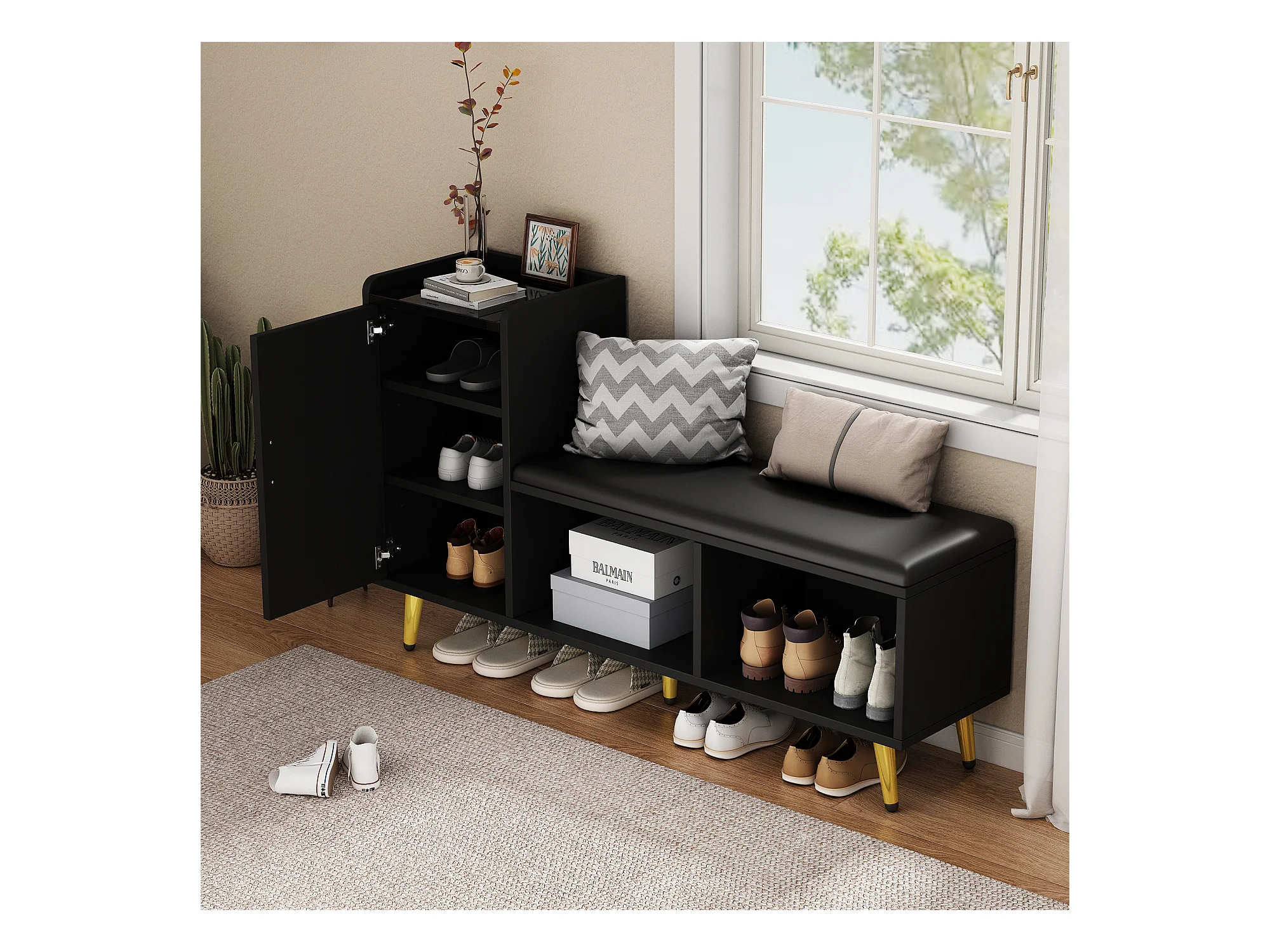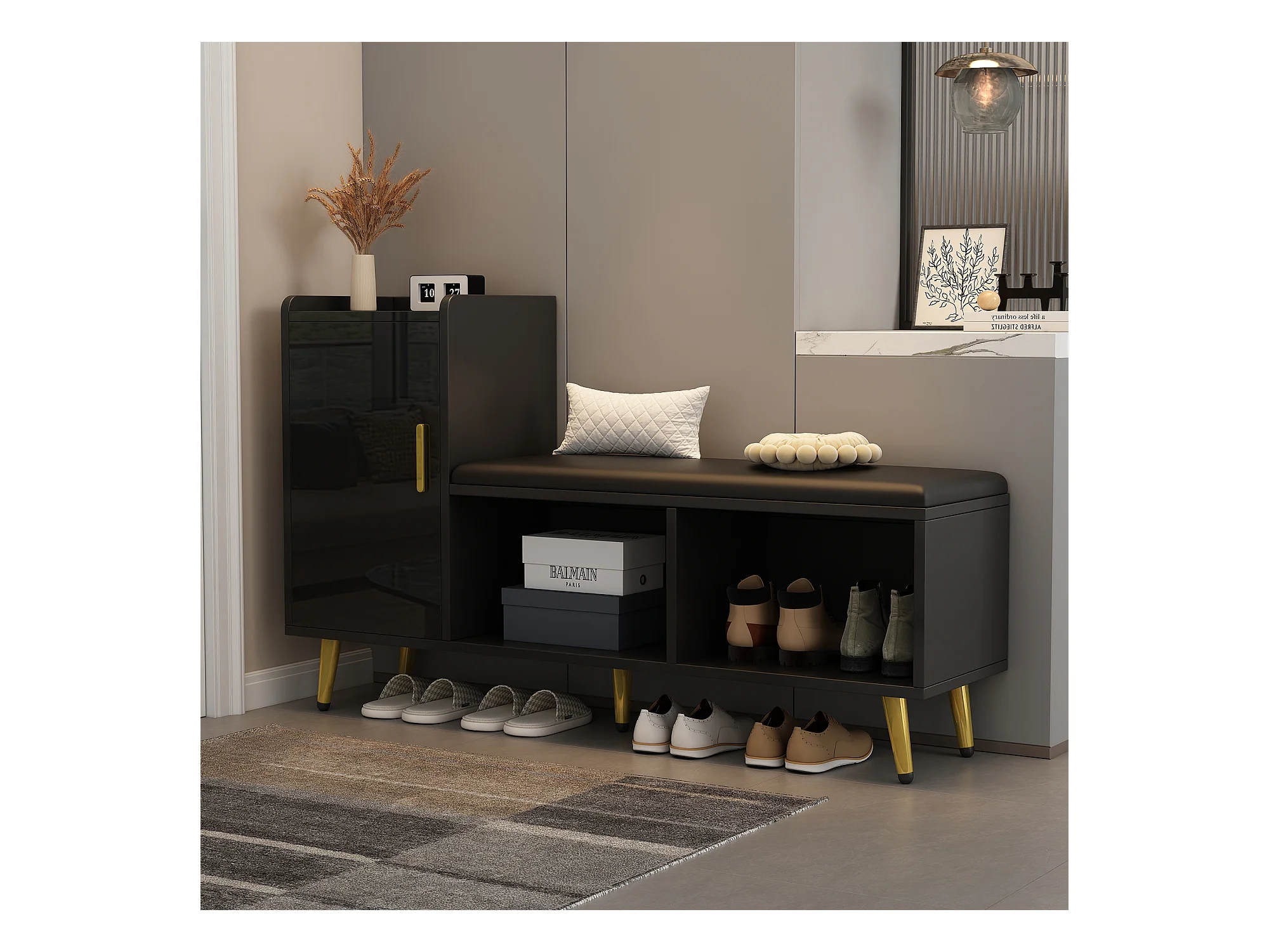 Meuble à chaussures - avec assise rembourrée - avec 1 porte - avec compartiments de rangement - Noir