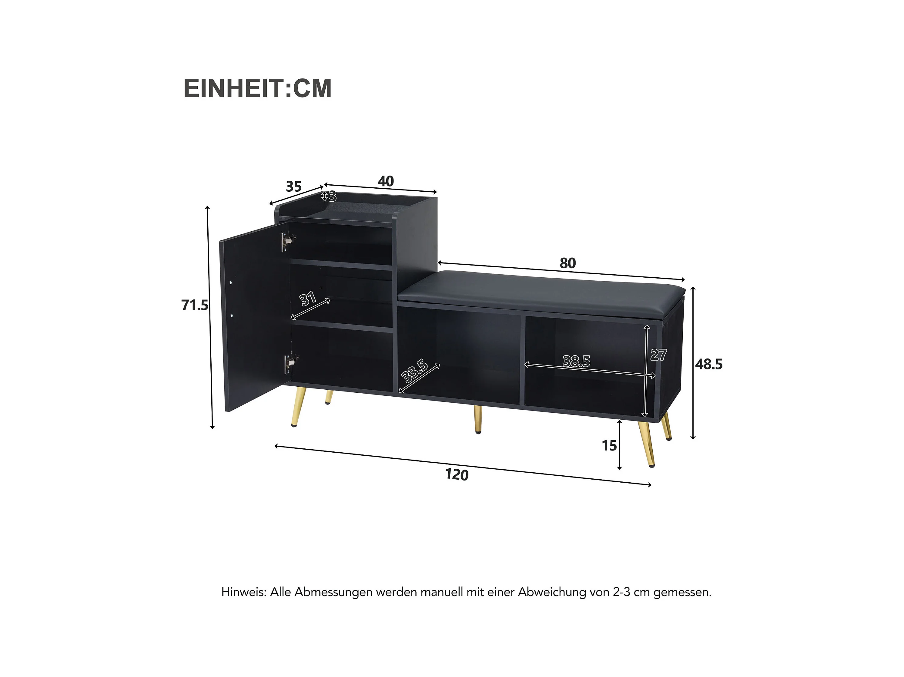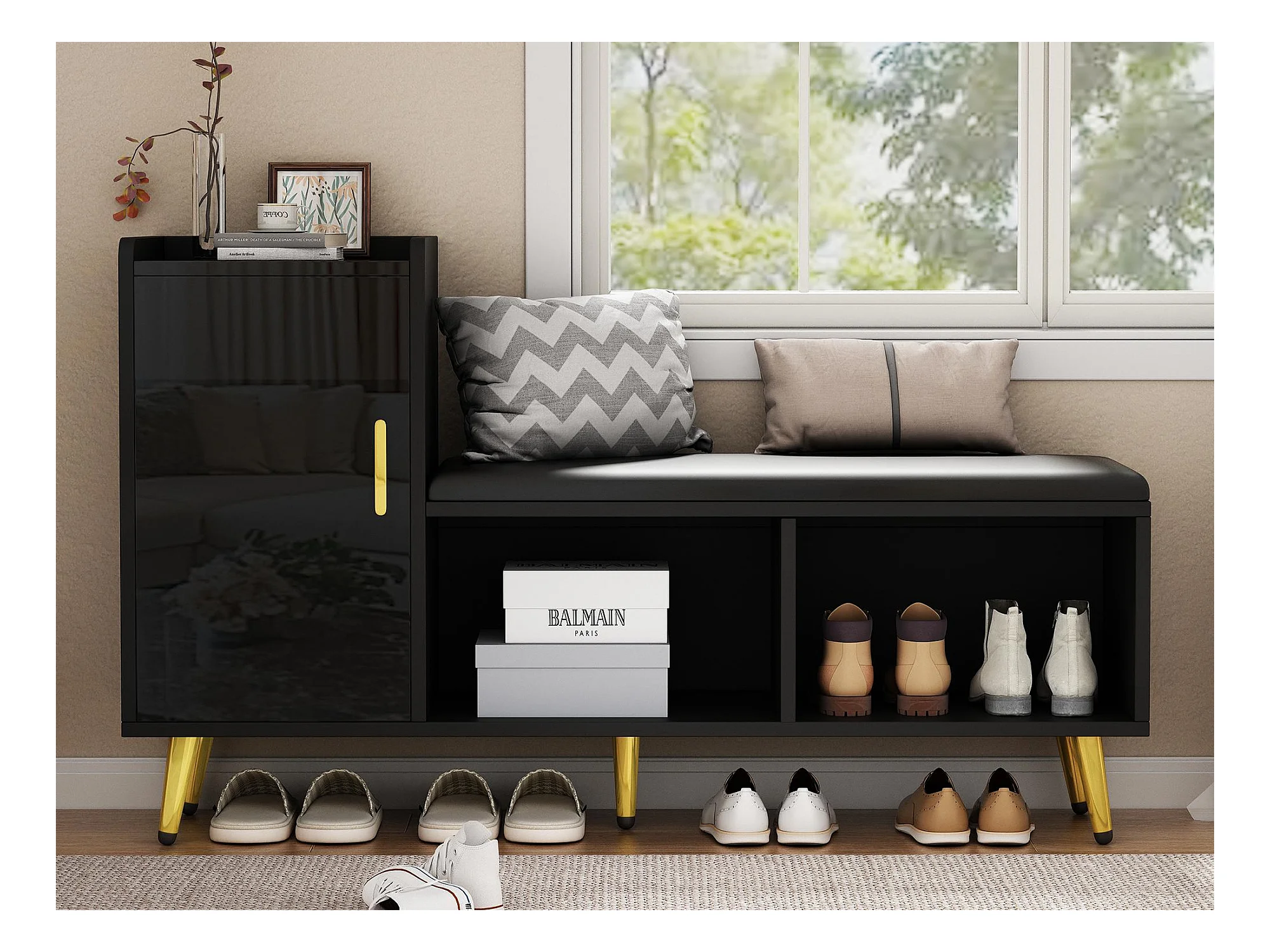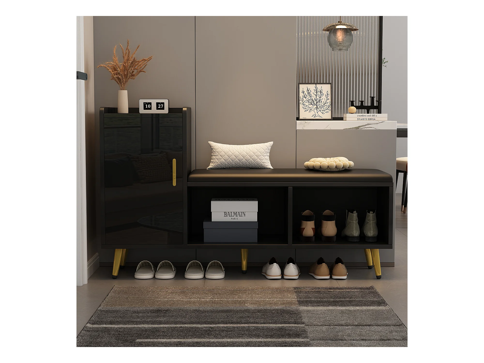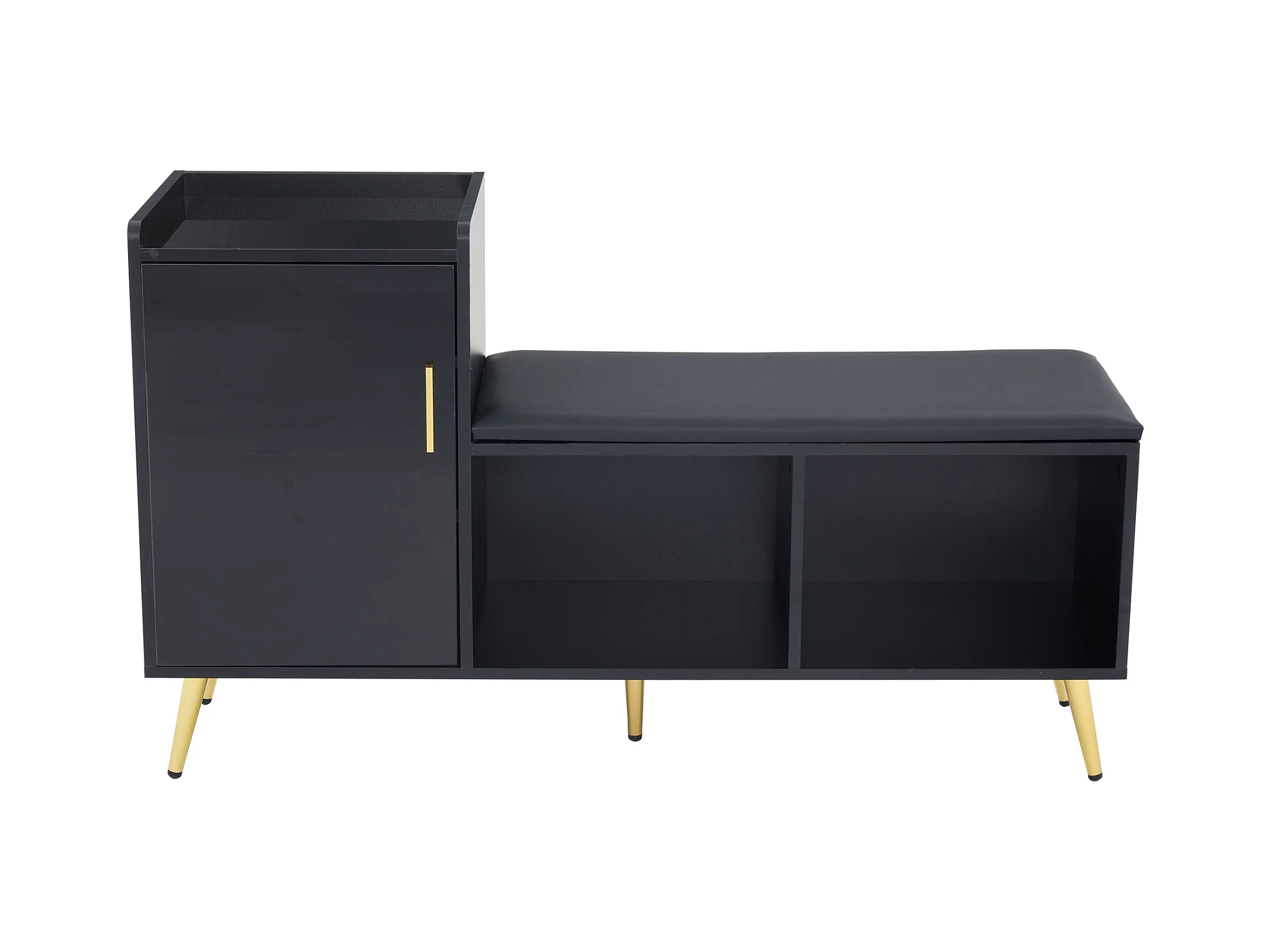 Meuble à chaussures - avec assise rembourrée - avec 1 porte - avec compartiments de rangement - Noir