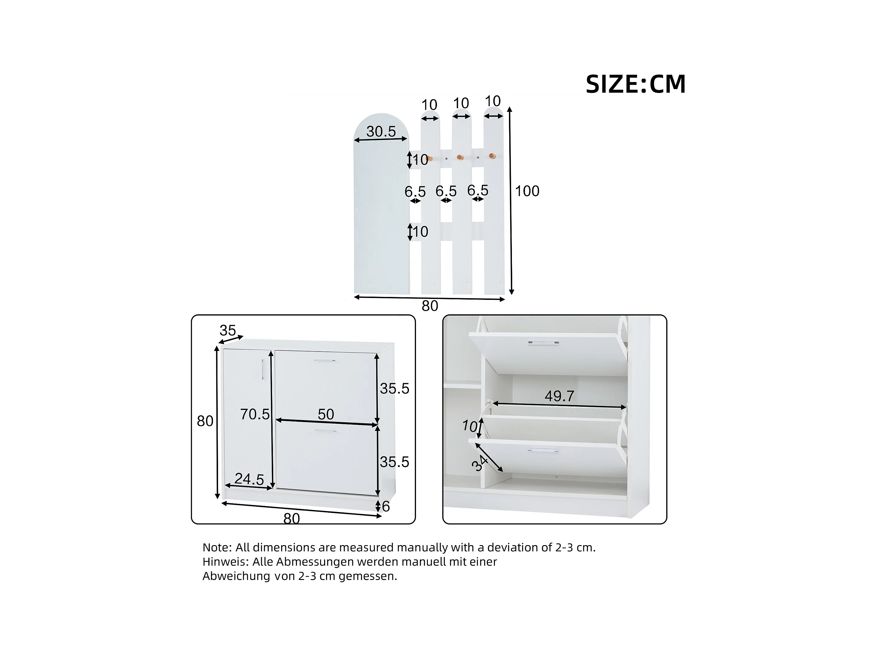 Meuble à chaussures avec porte rabattable, miroir et crochets, MDF, blanc, (80x35x80 cm)