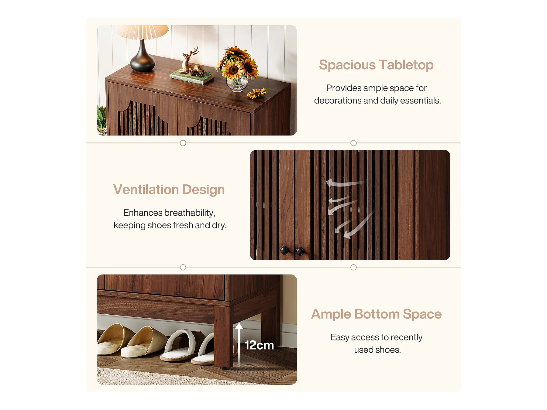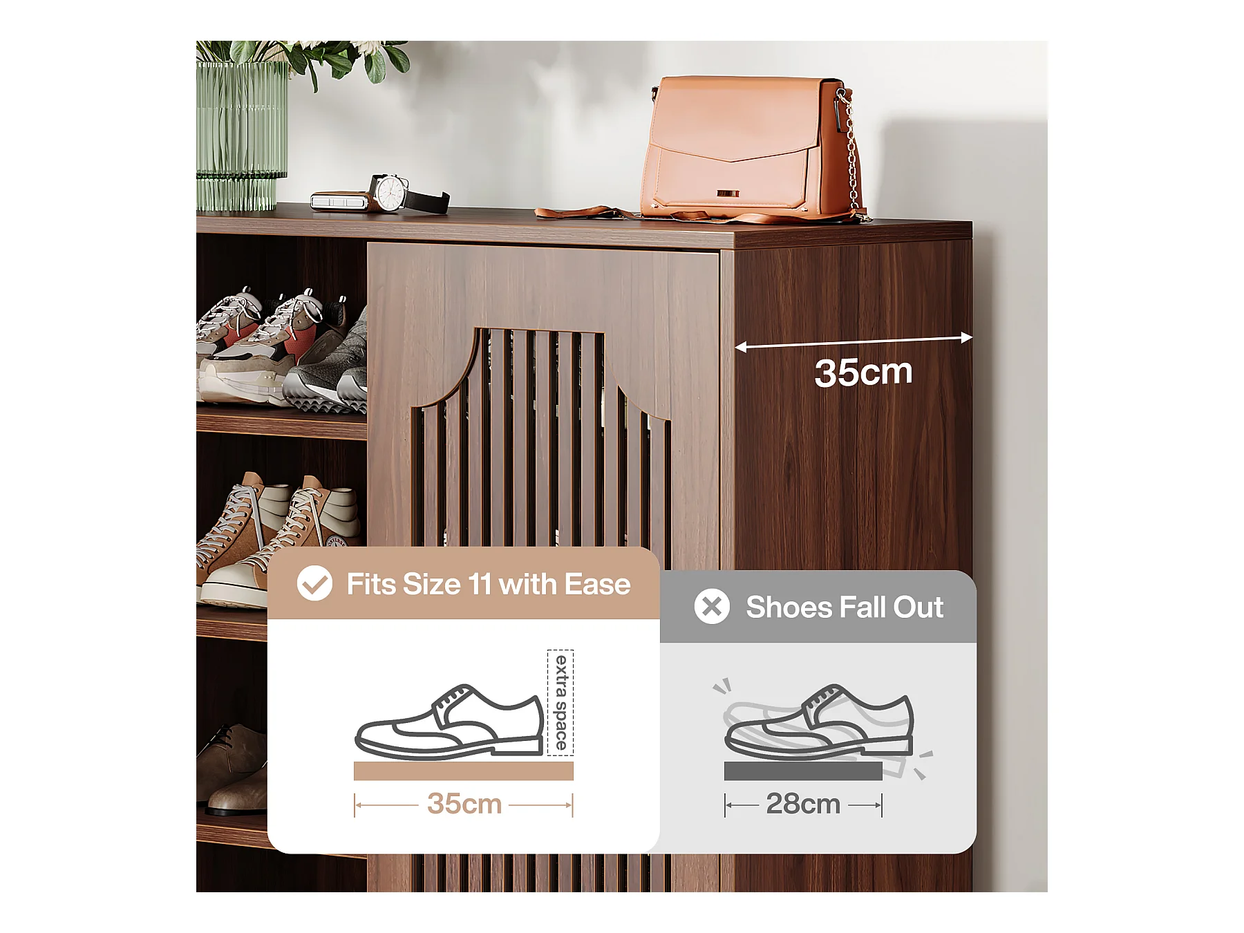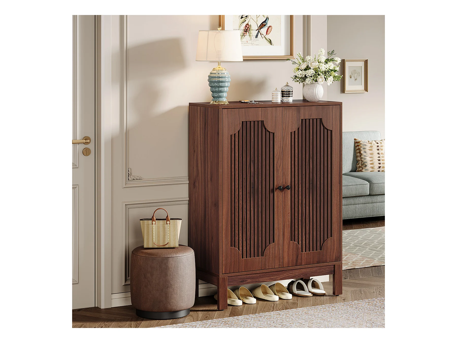 Meuble à chaussures d'entrée avec 2 tiroirs rabattables, meuble à chaussures étroit en bois avec panneau cannelé