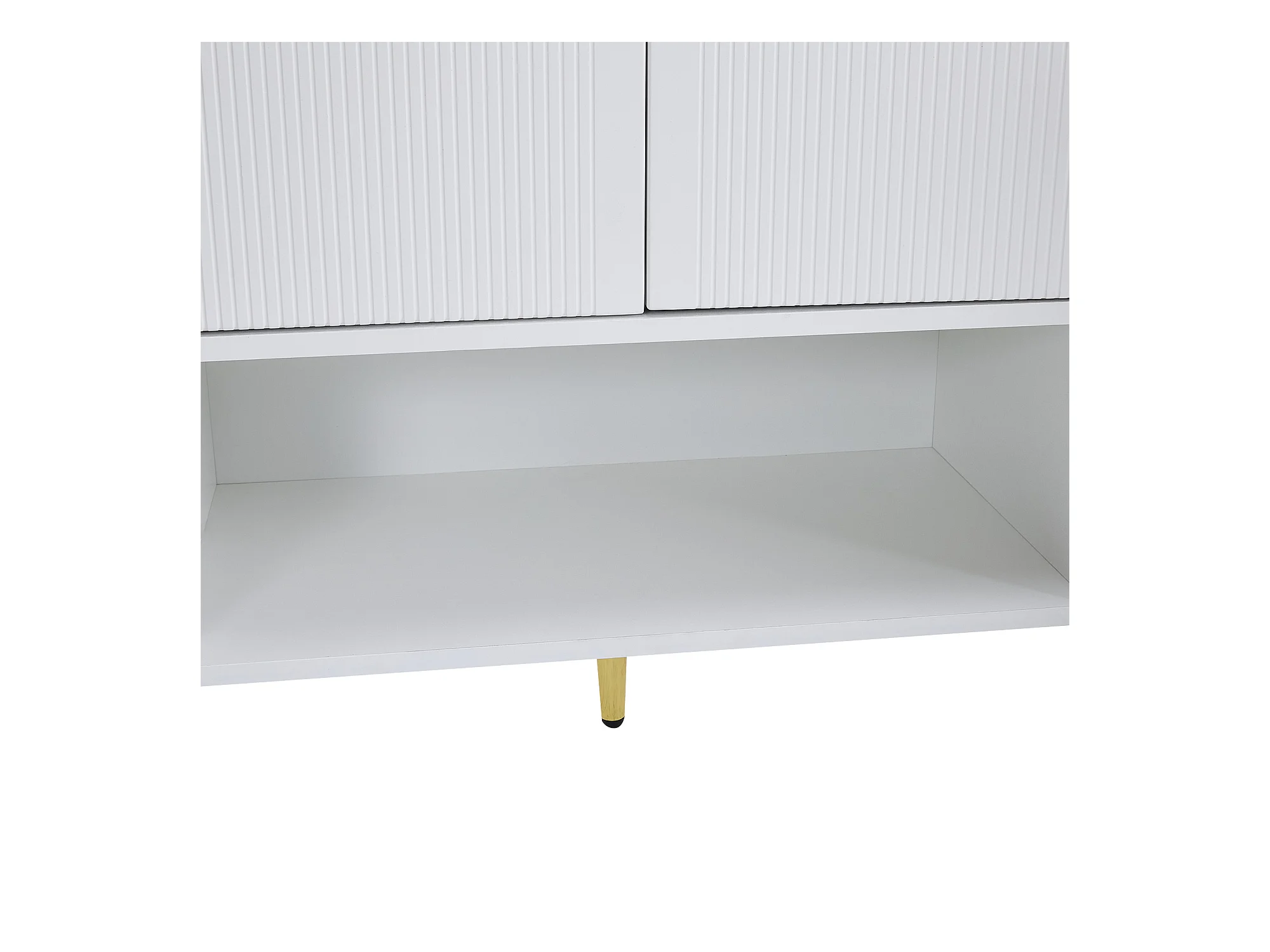 Meuble à chaussures blanc avec 2 portes et étagères ouvertes, poignées et pieds dorés