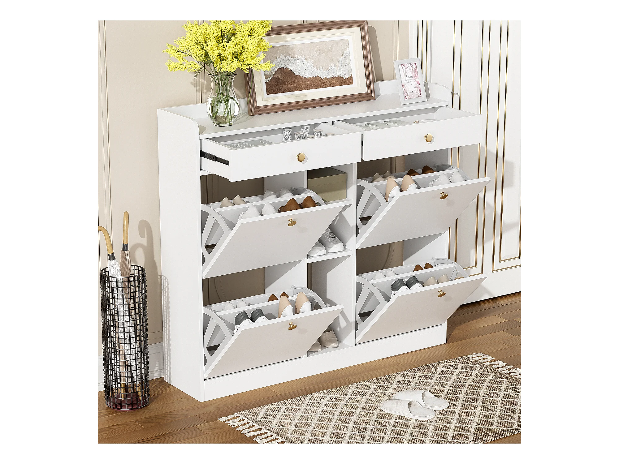 Meuble à chaussures blanc avec 4 portes basculantes et 2 tiroirs – pour entrée et couloir