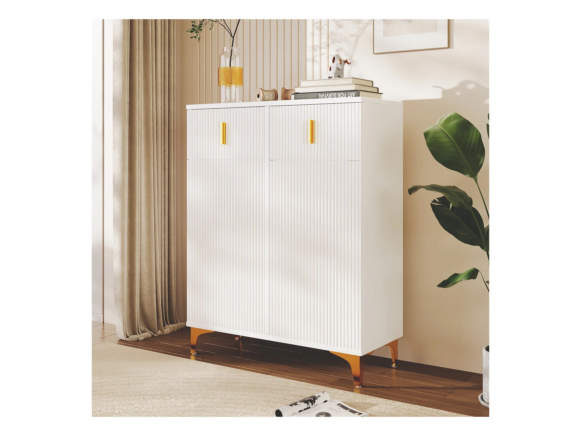 Meuble à chaussures blanc avec 2 portes et étagères réglables, poignées dorées - pour salon et entrée