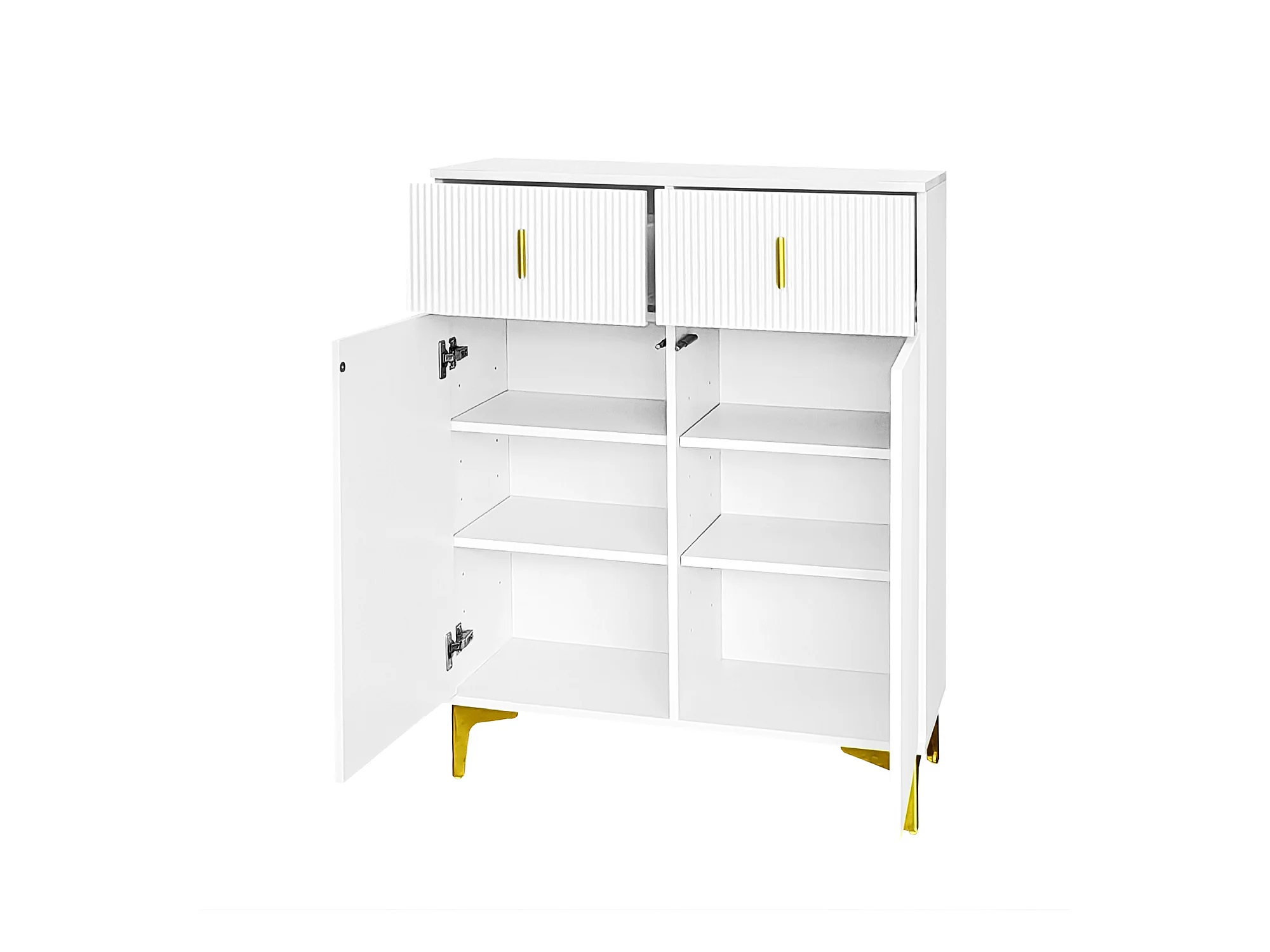 Meuble à chaussures blanc avec tiroirs, portes texturées, étagères réglables, poignées et pieds dorés - design élégant