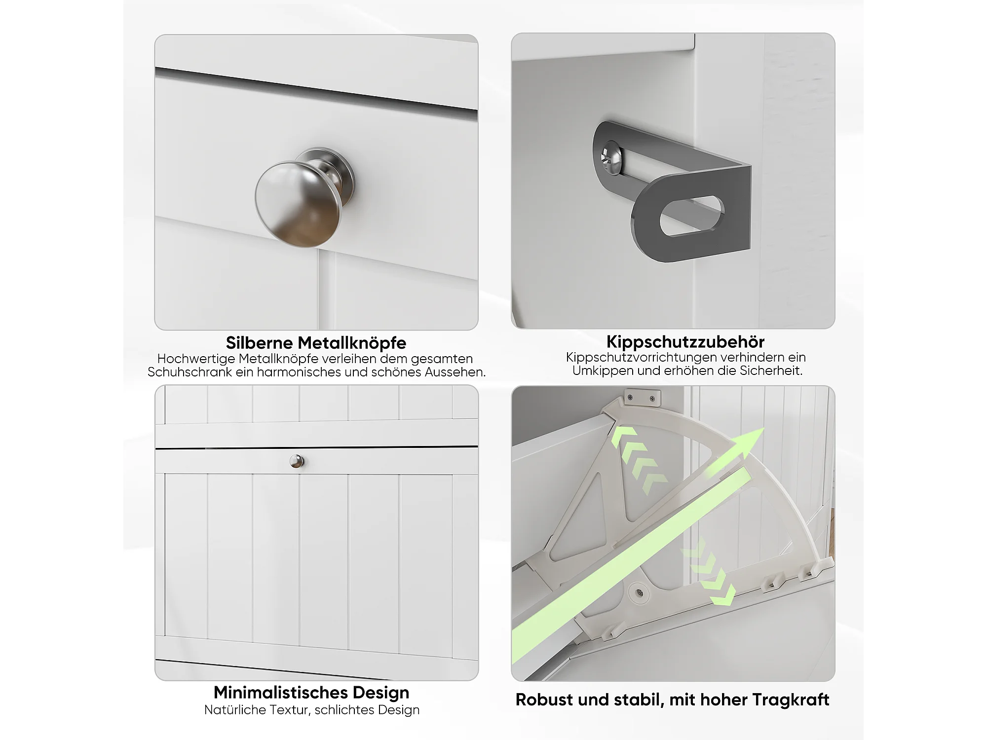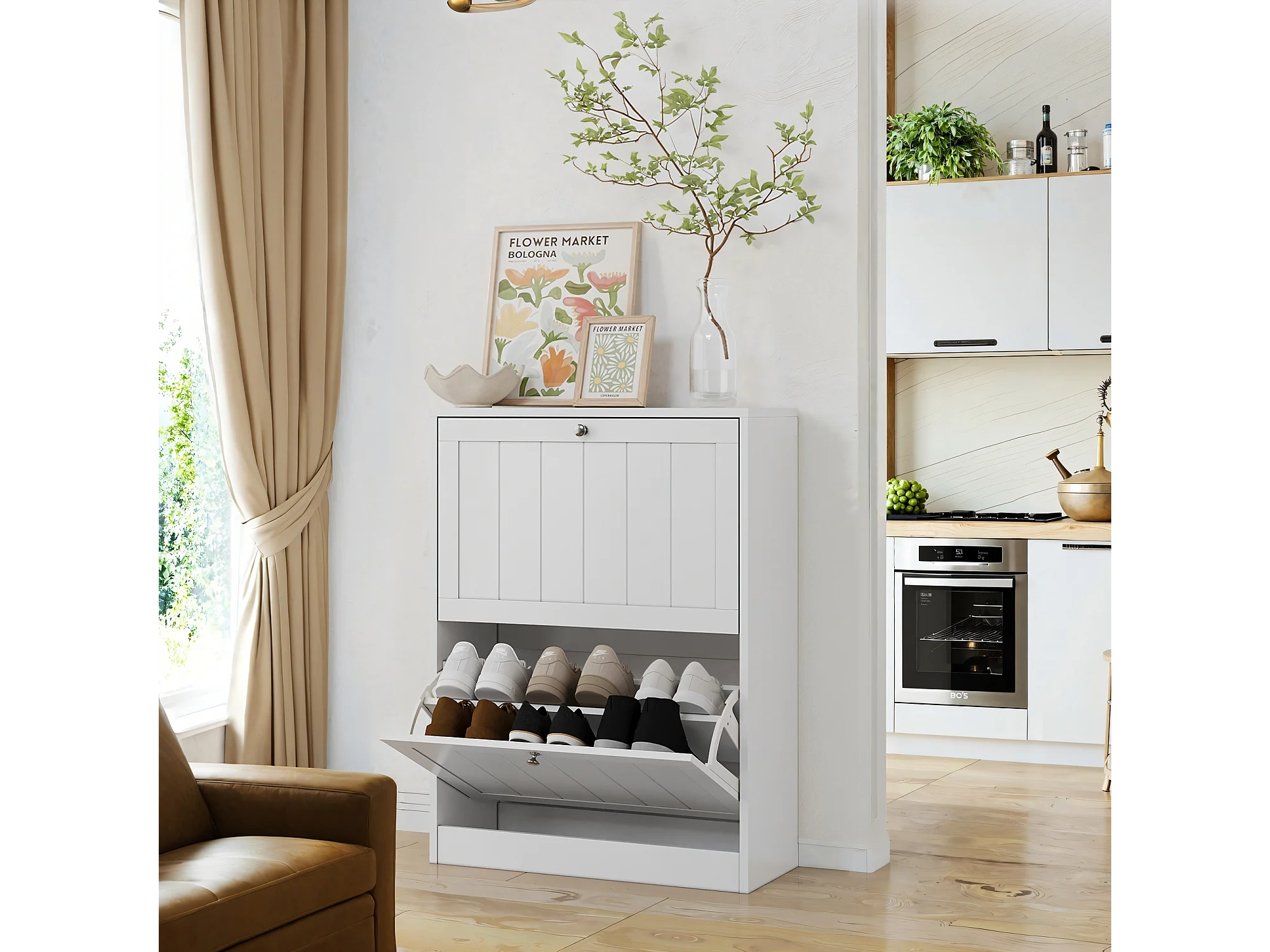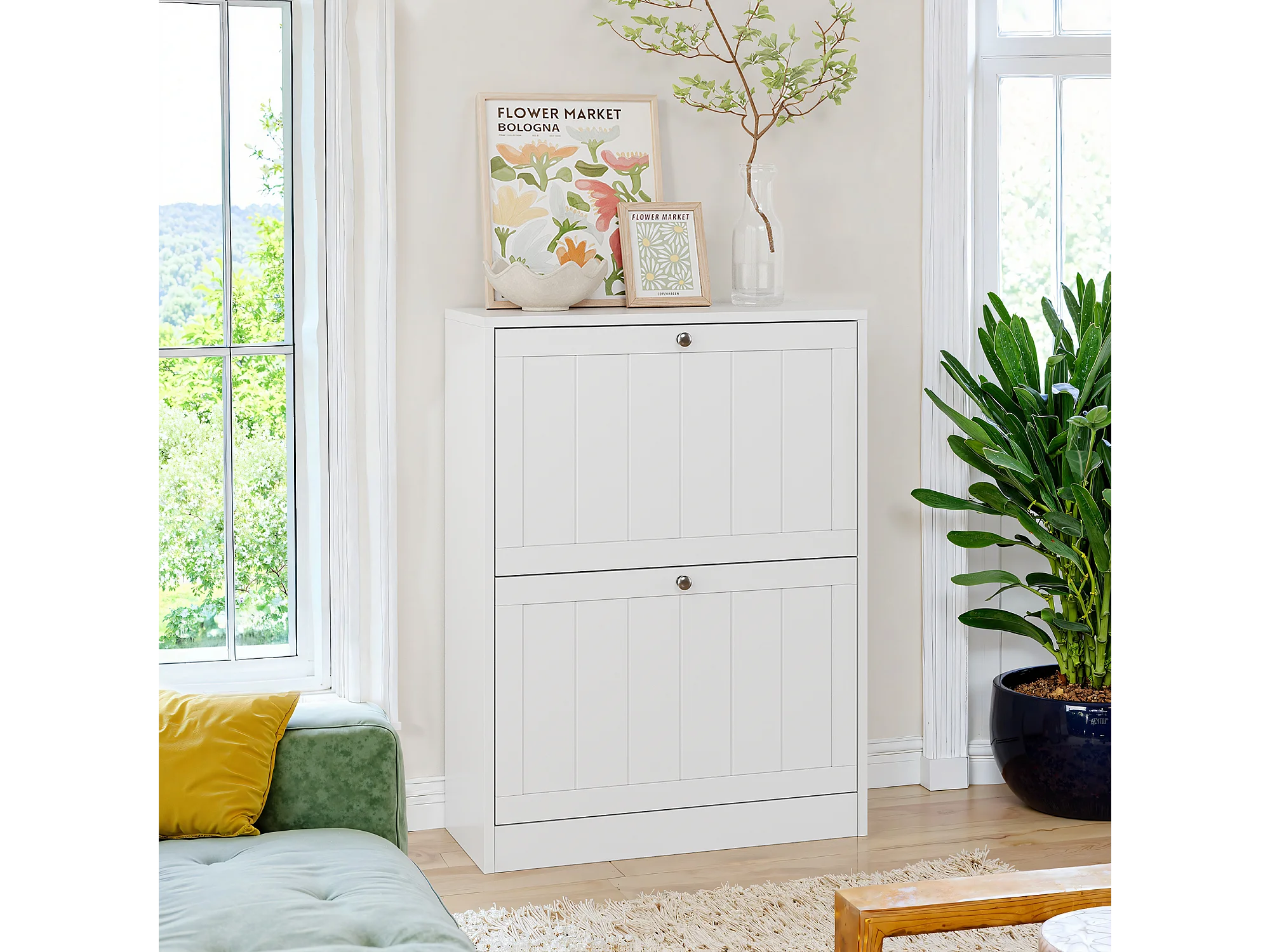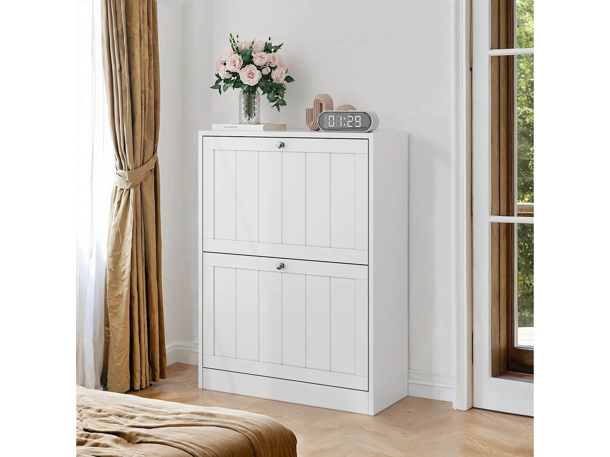 Meuble à chaussures blanc, design moderne Mid-Century, avec 2 tiroirs rabattables, idéal pour entrée et couloir (60x24x80 cm)