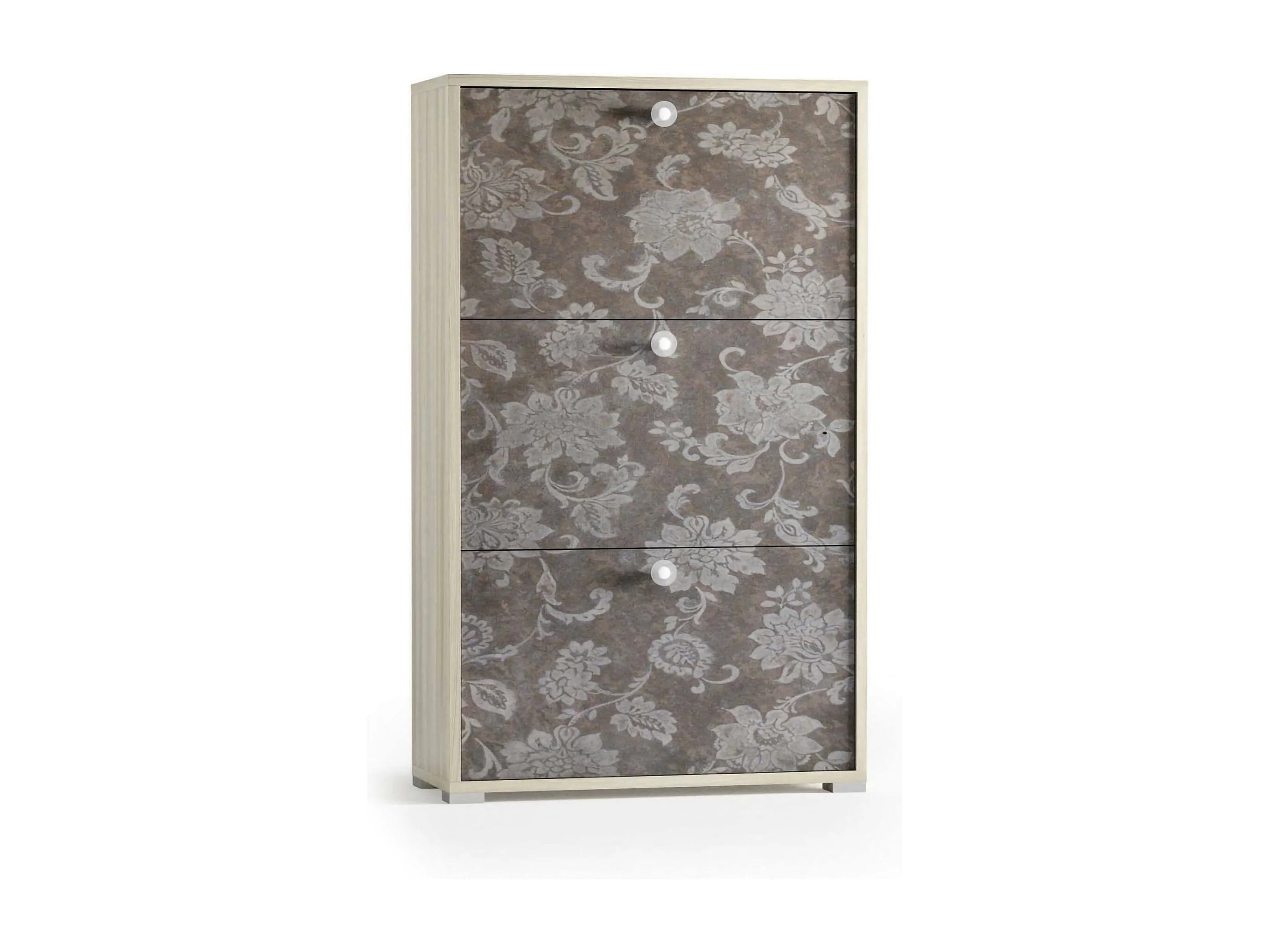 Étagère à chaussures Dlos, Meuble d'entrée polyvalent avec 3 portes pliantes, Meuble à chaussures double profondeur, 100% Made in Italy, 67x28h112 cm, Orme et motif