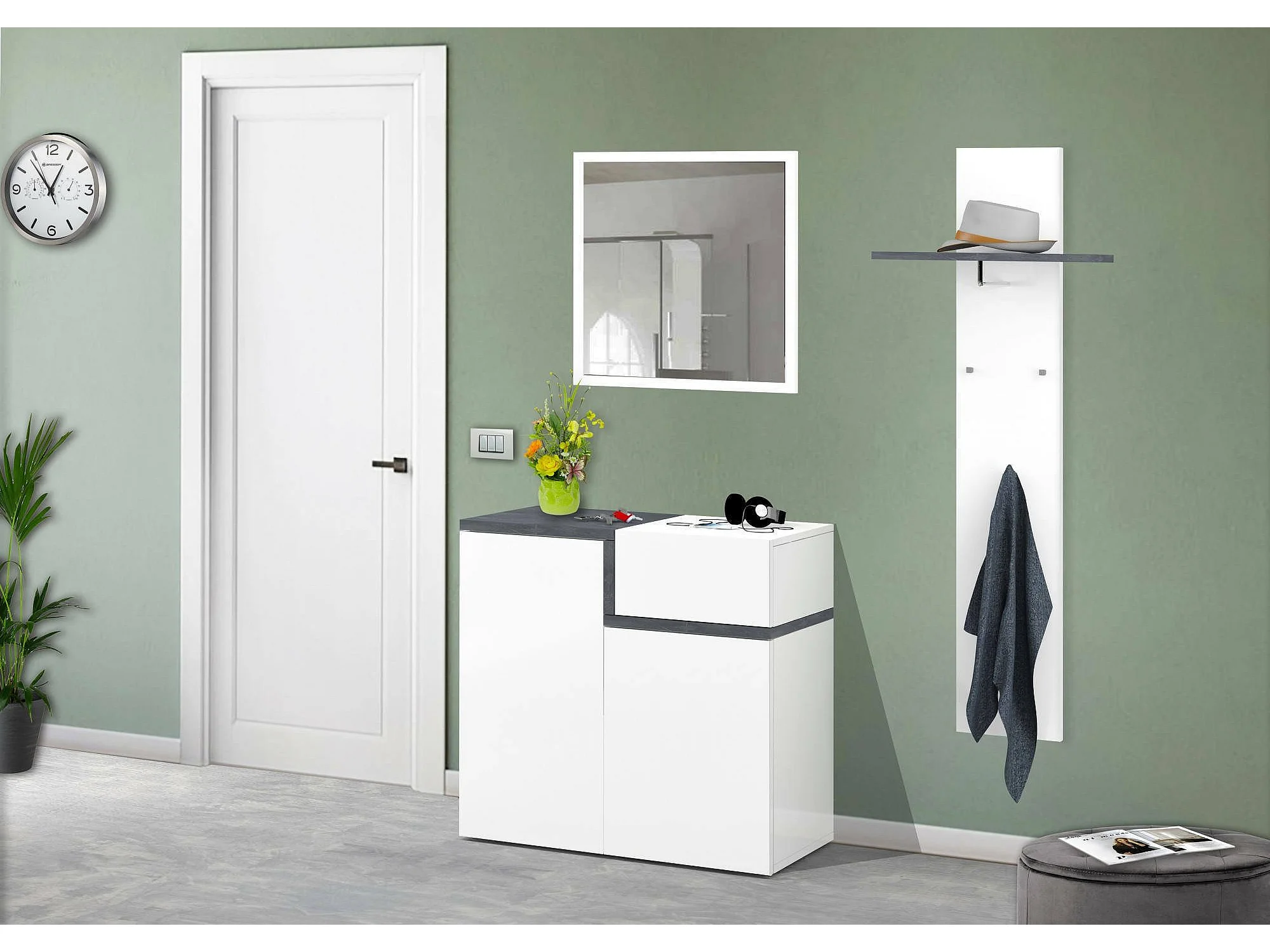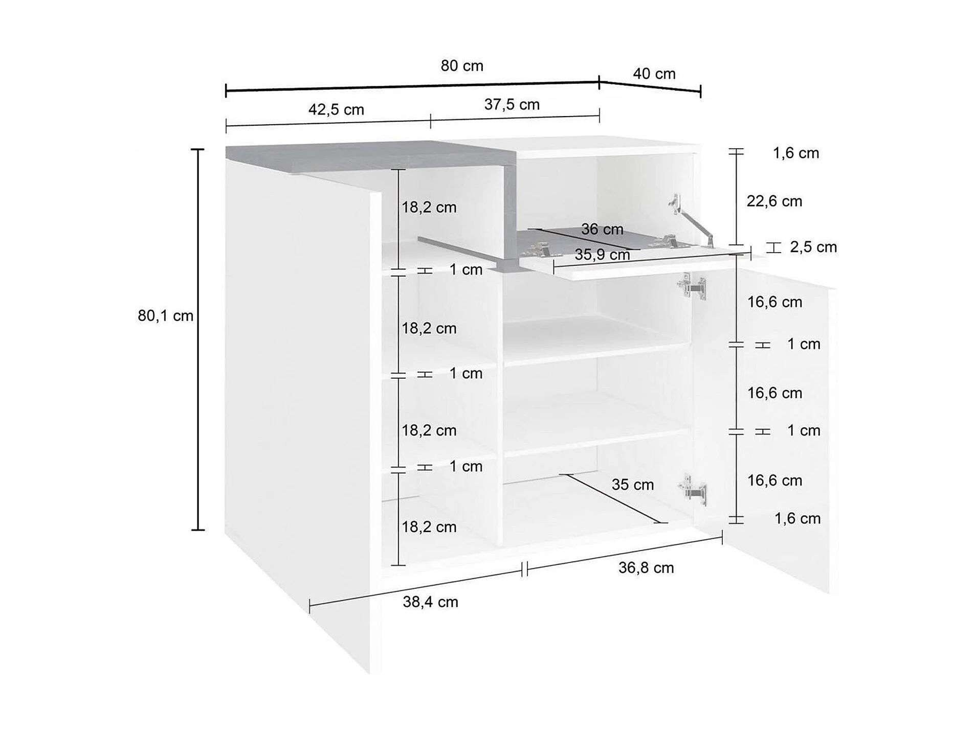 Dmaric schoenenrek, multifunctionele kast met 2 deuren en 1 klepdeur, schoenenrek voor entree, 100% Made in Italy, 80x40h80 cm, glanzend wit en leisteen