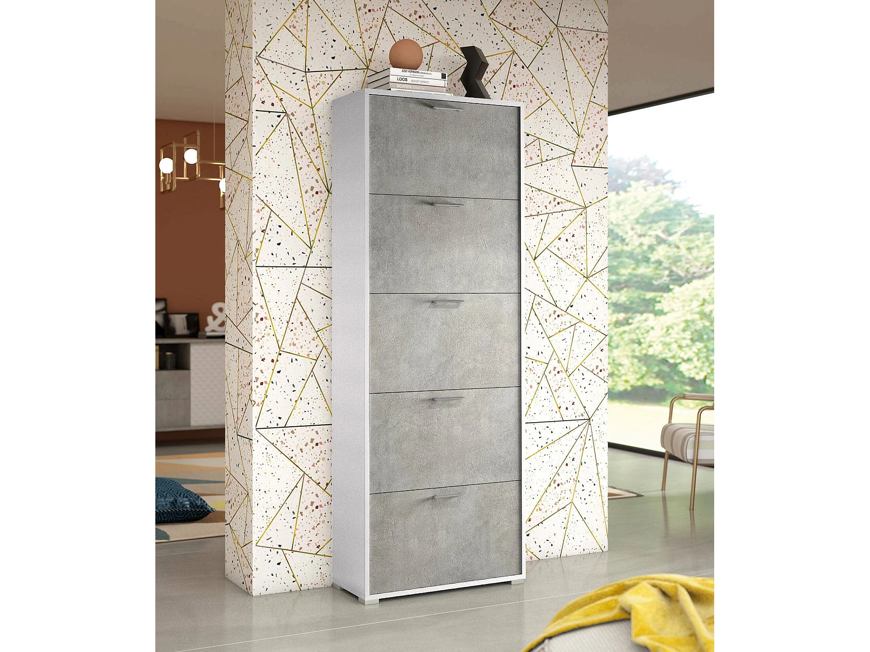Sapateira Dmiano, móvel de entrada multiuso com 5 portas sanfonadas, sapateira de dupla profundidade, 100% Fabricado na Itália, 67x28h183 cm, Branco e Cimento