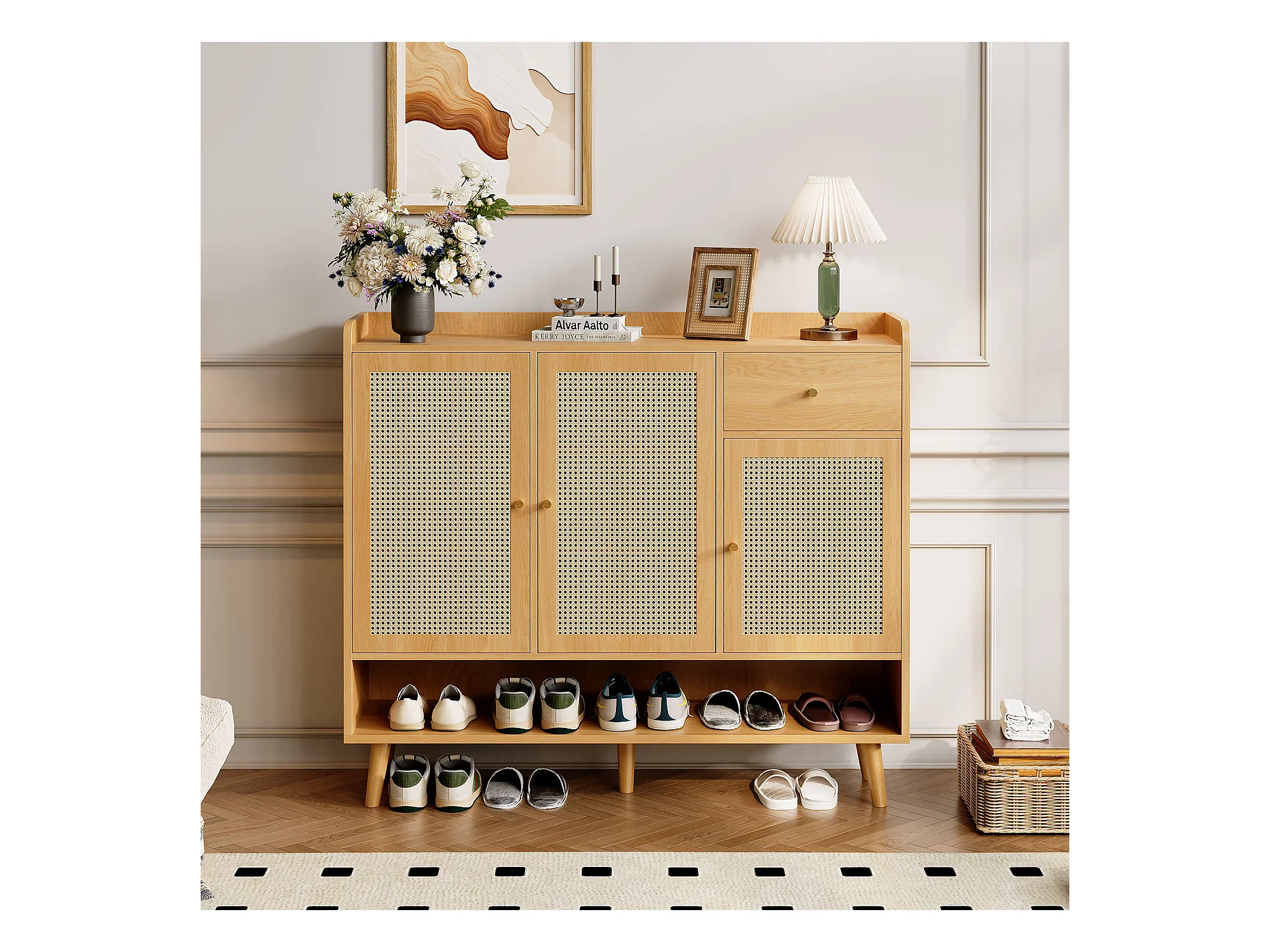 Meuble à chaussures en rotin avec 4 portes et 1 tiroir, pieds et poignées en bois