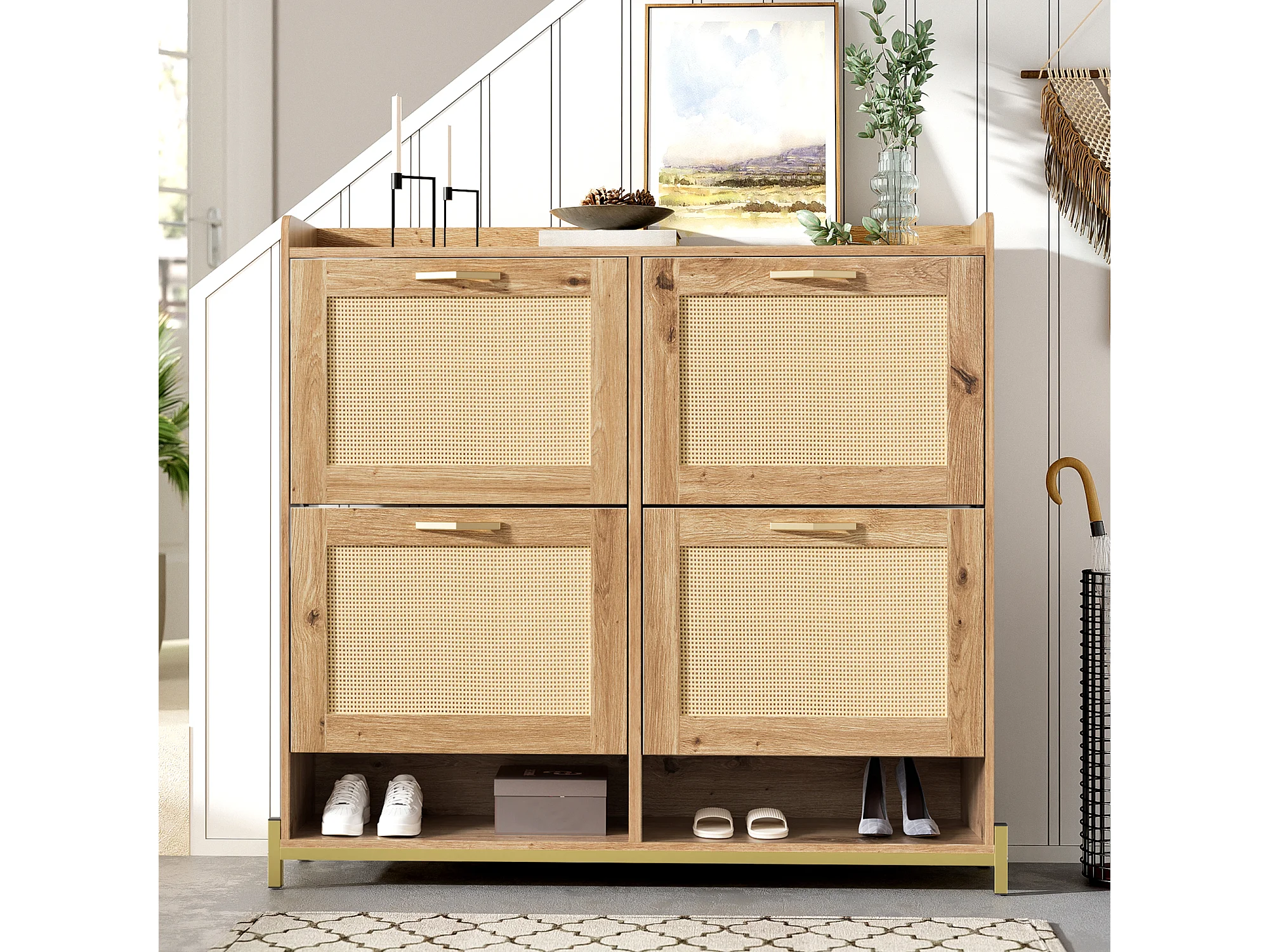 Meuble à chaussures en bois avec portes en rattan, métal, 4 portes, (108.5x24x100 cm)