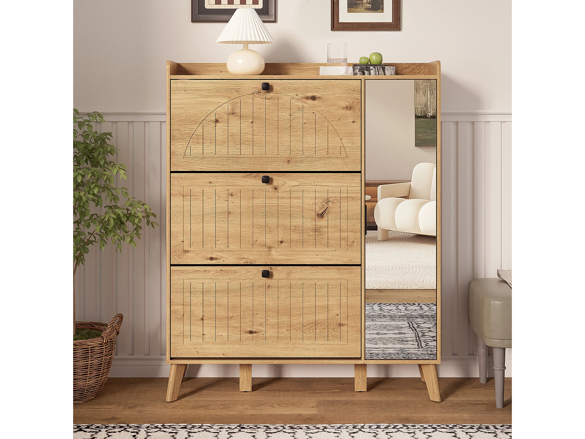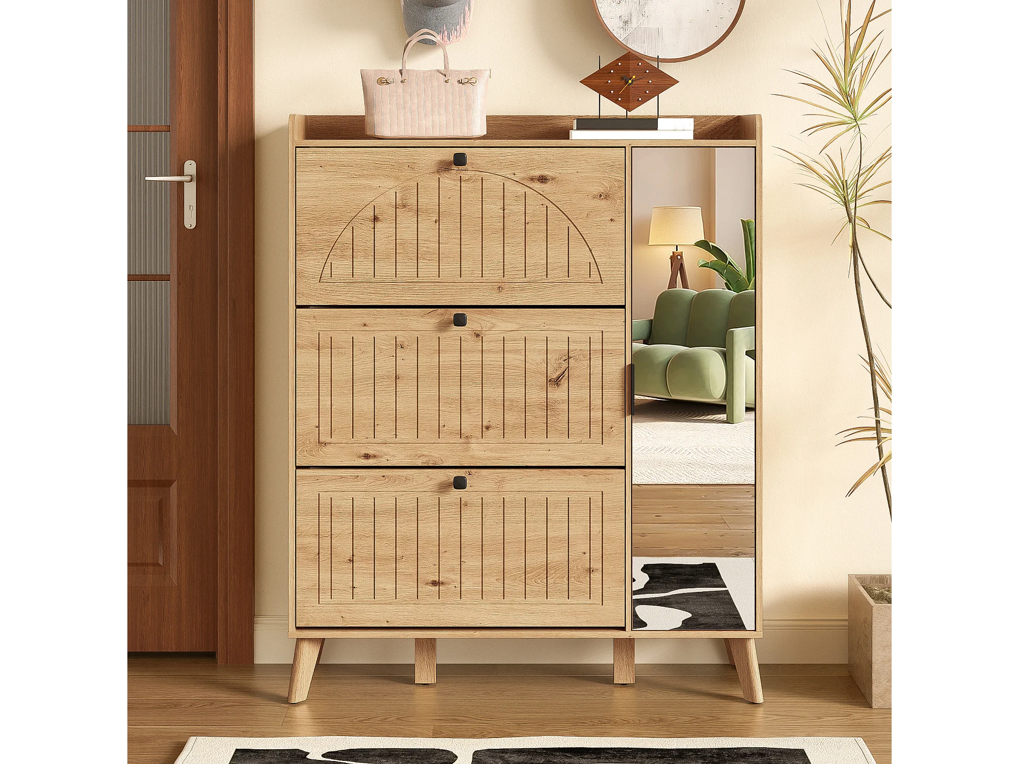 Meuble à chaussures moderne avec miroir et portes à charnières + étagère - 110 x 24 x 137.5 cm - MDF - naturel
