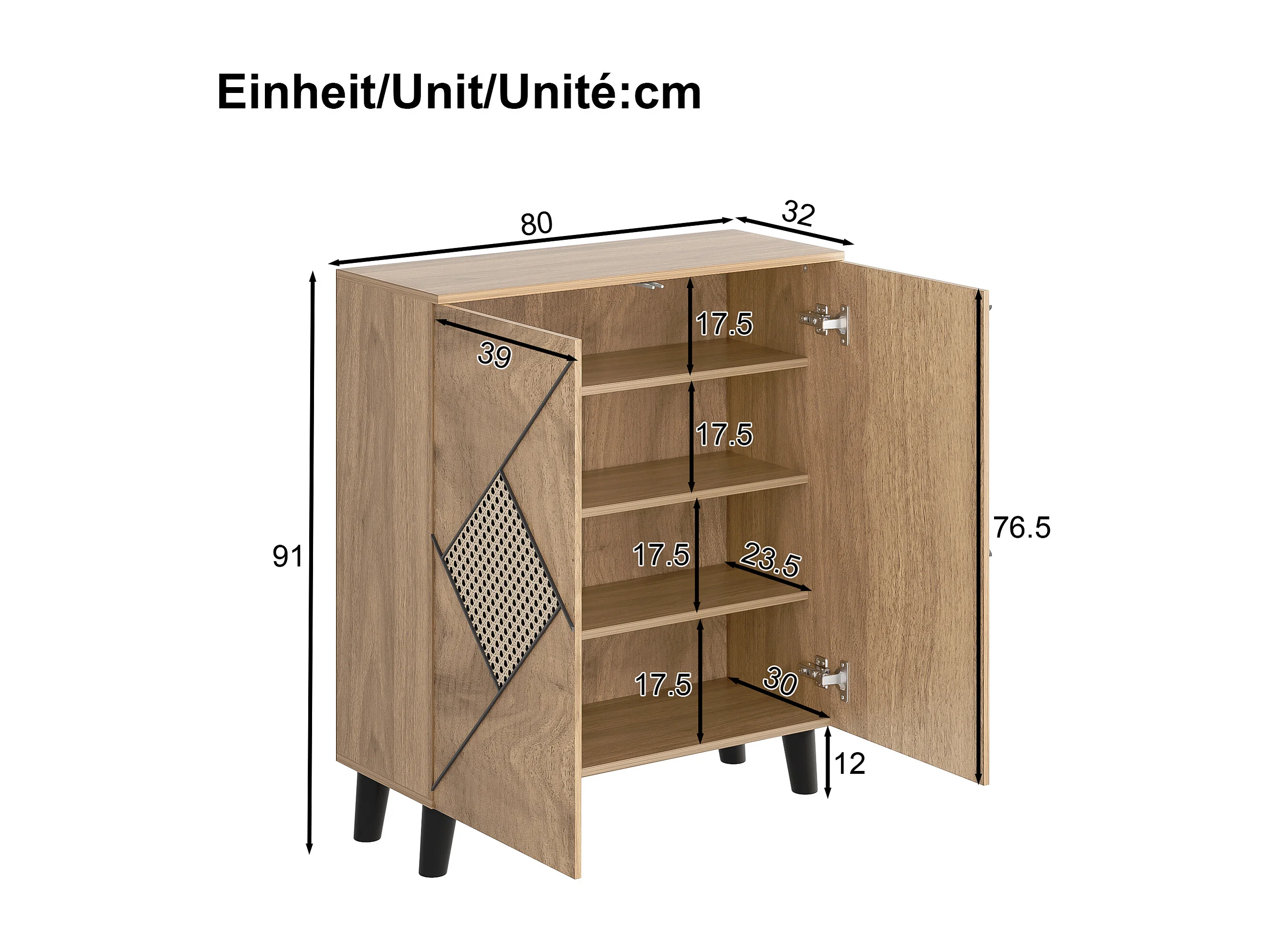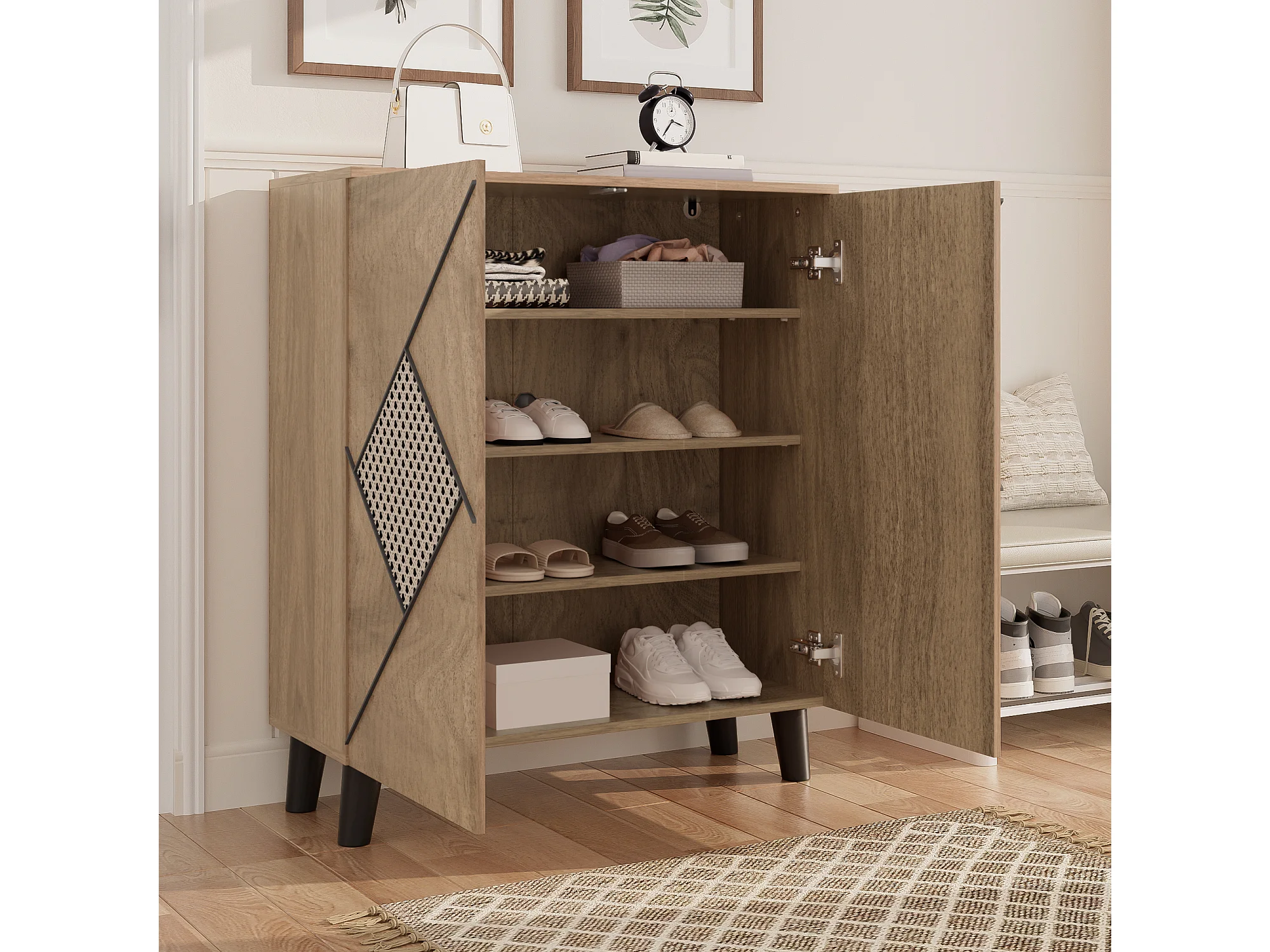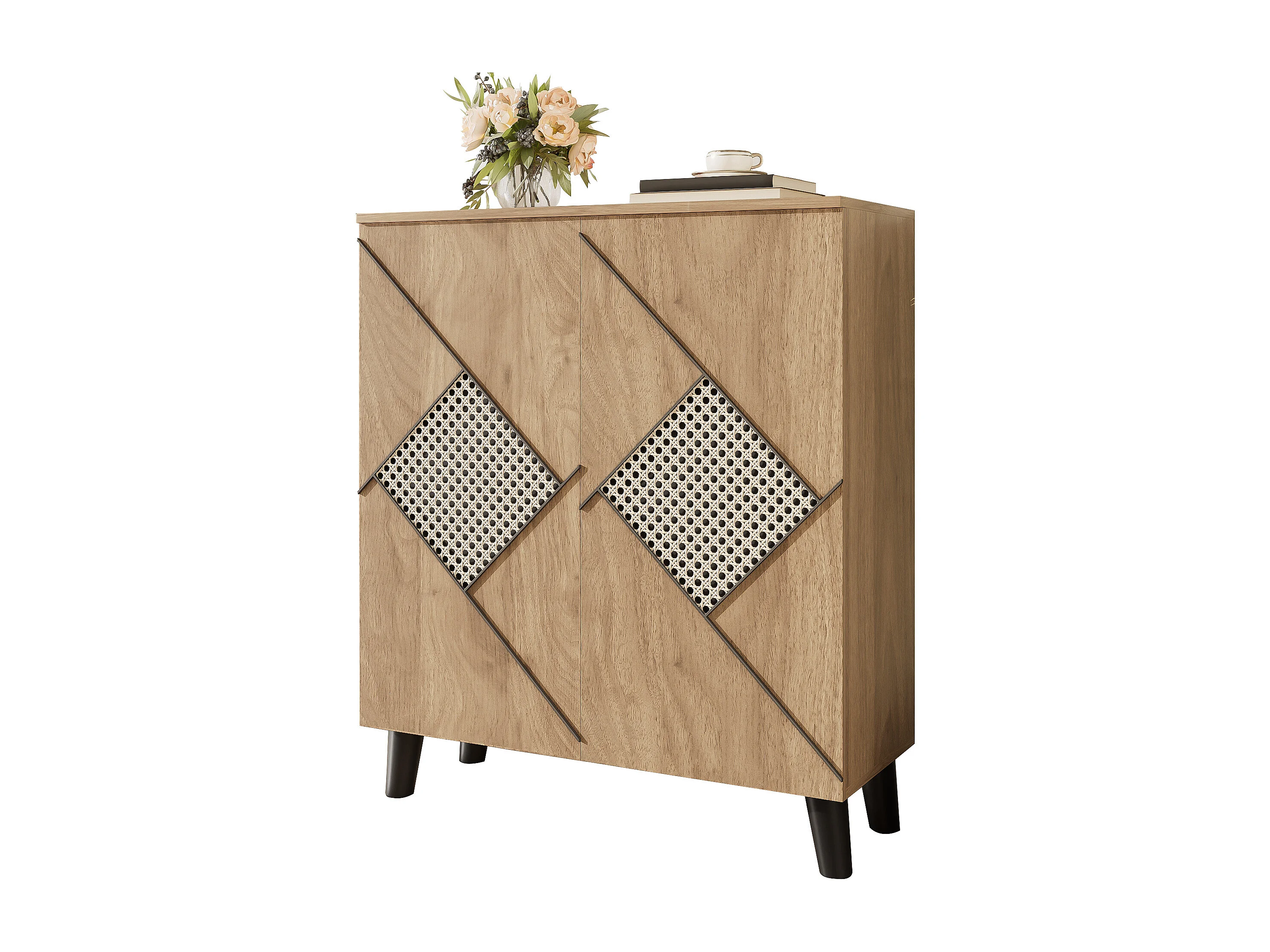 Meuble à chaussures moderne avec motif rotin décoratif - 80 x 32 x 91 cm - avec 2 portes - aggloméré - naturel