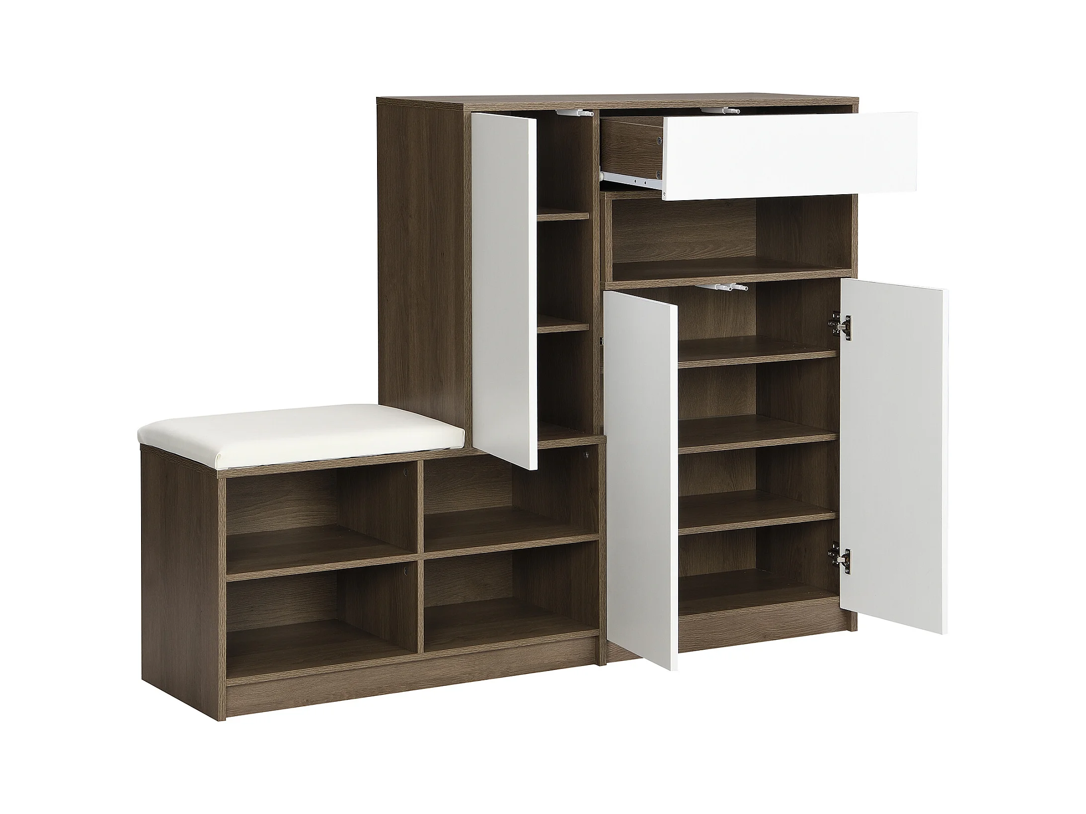 Meuble à chaussures avec banc, porte-manteau et miroir - 105 x 40 x 190.5 cm - MDF et panneau de particules - Blanc et bois