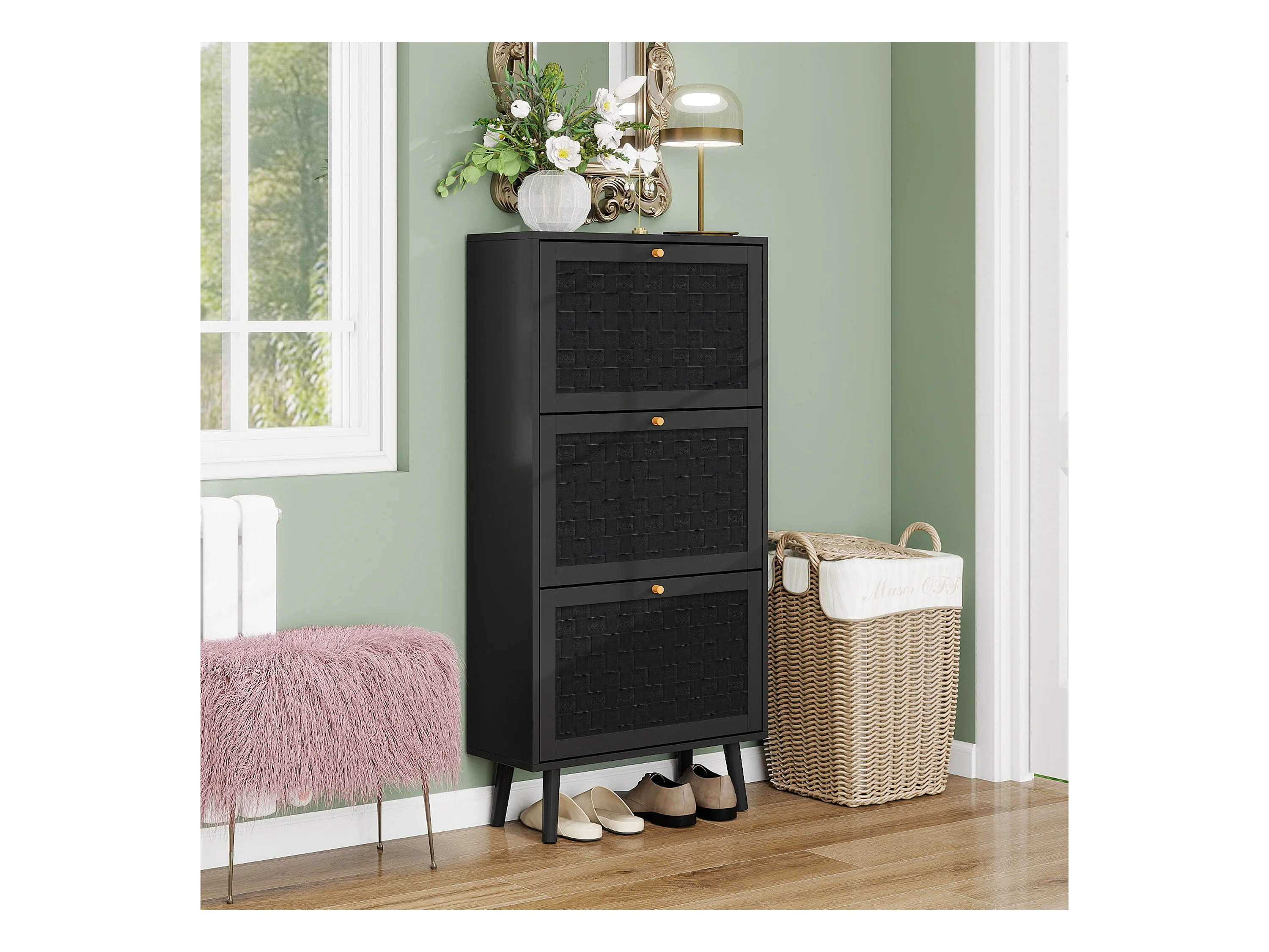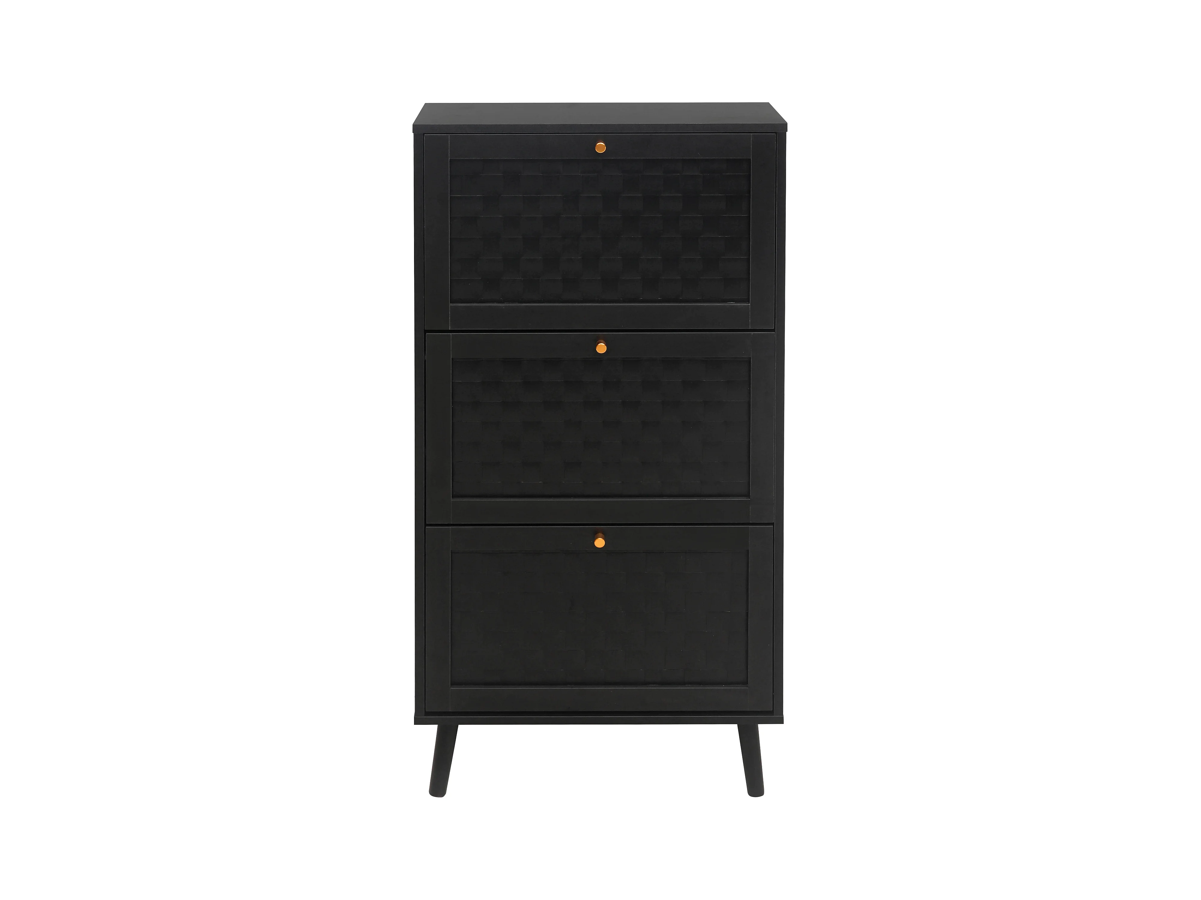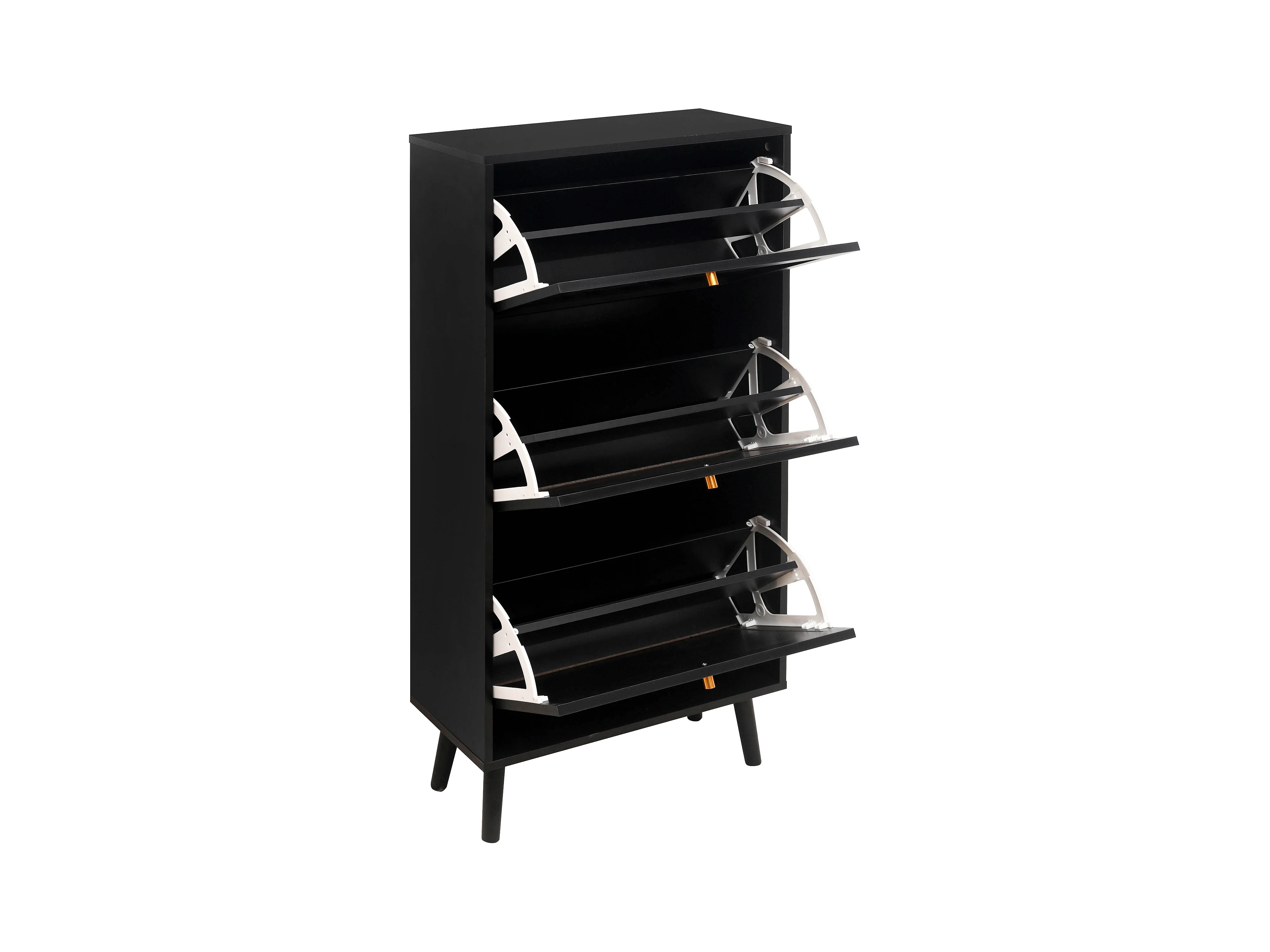 Meuble à chaussures noir avec 3 portes basculantes et poignées dorées - pour entrée et couloir