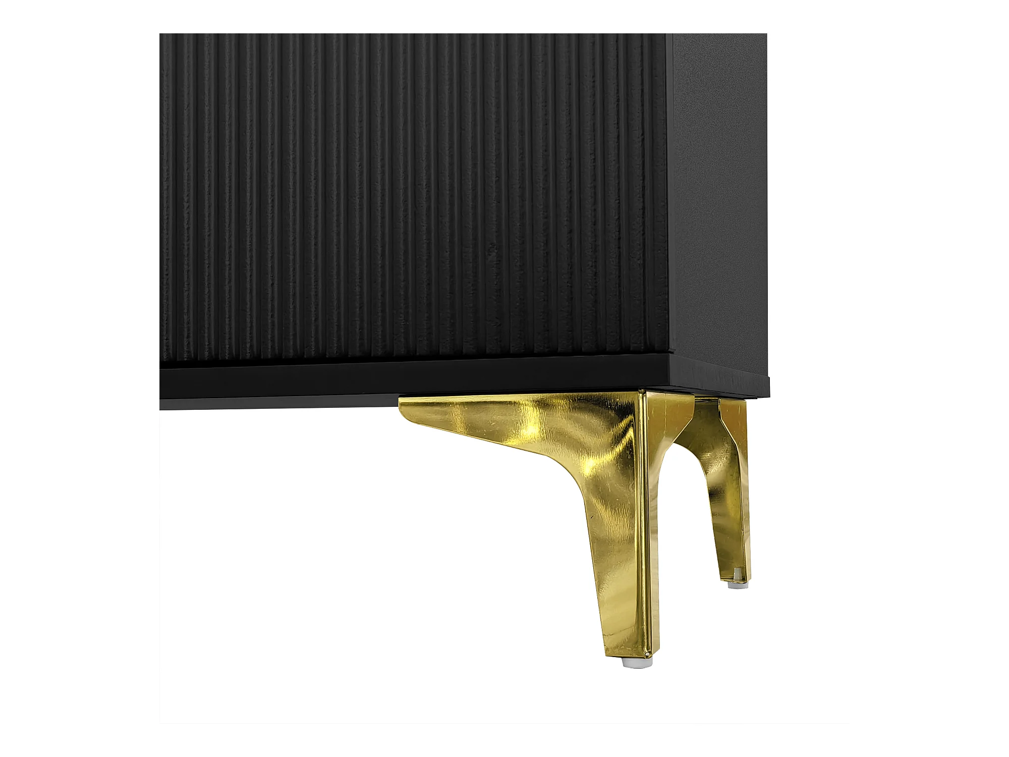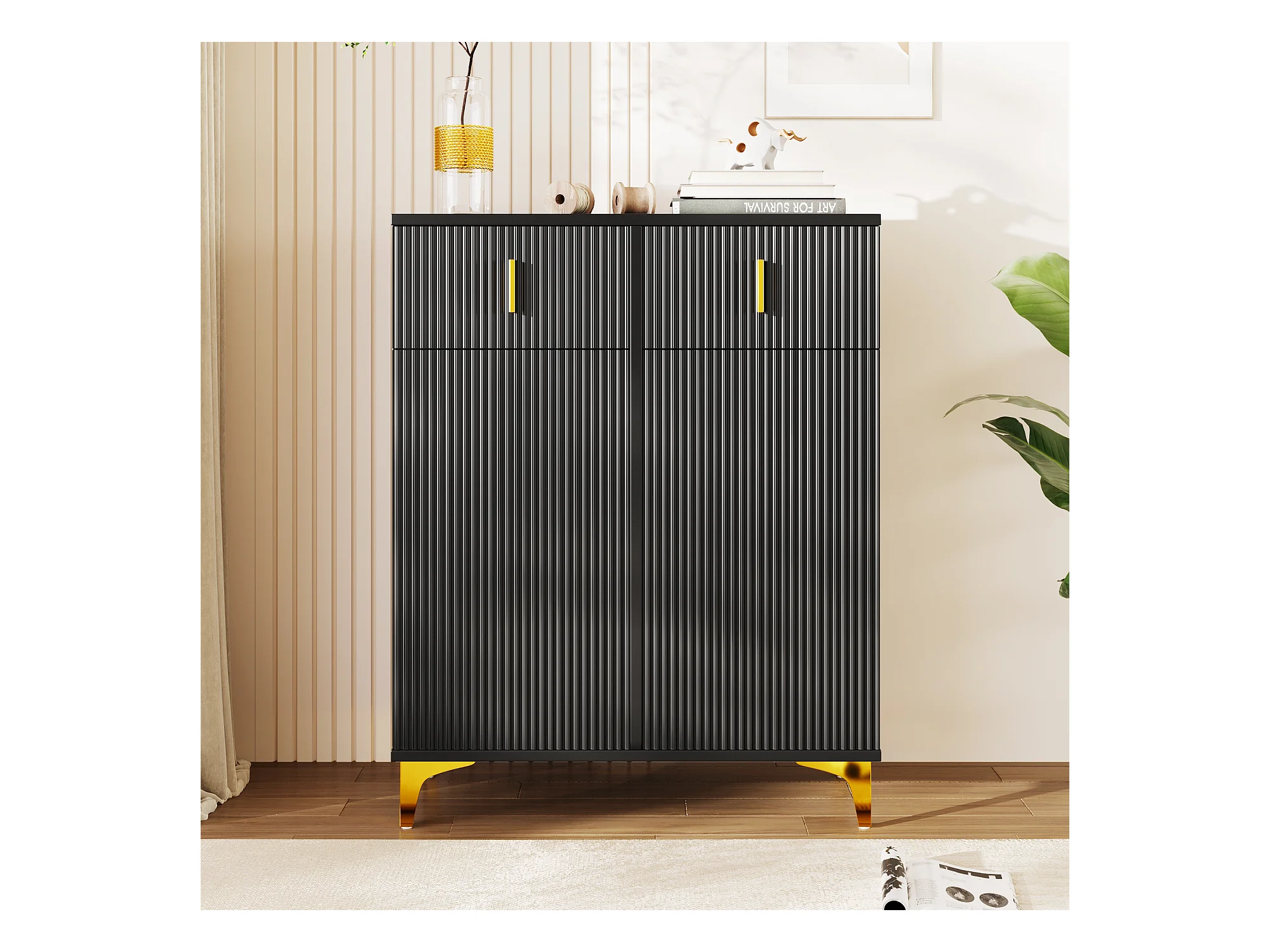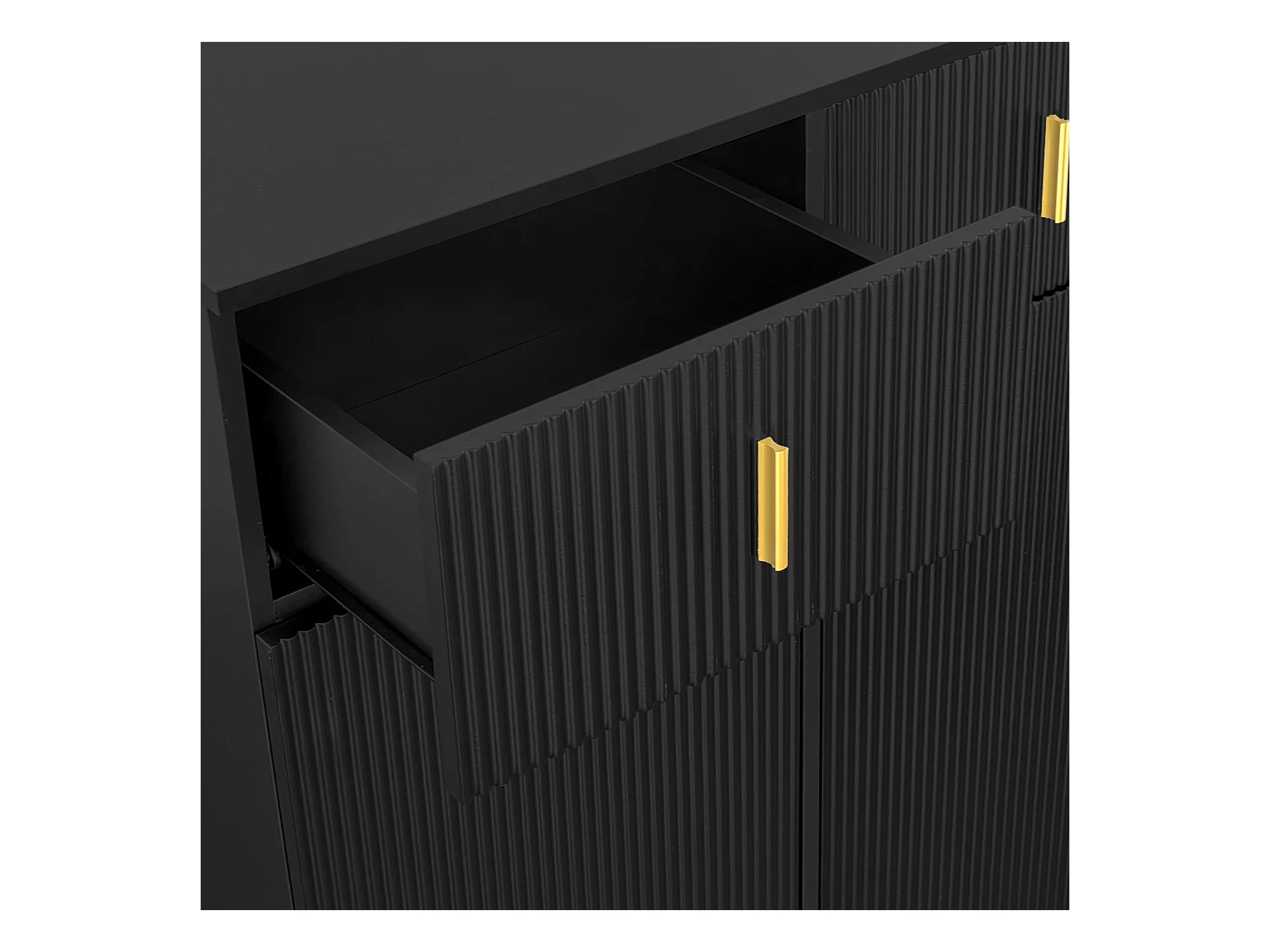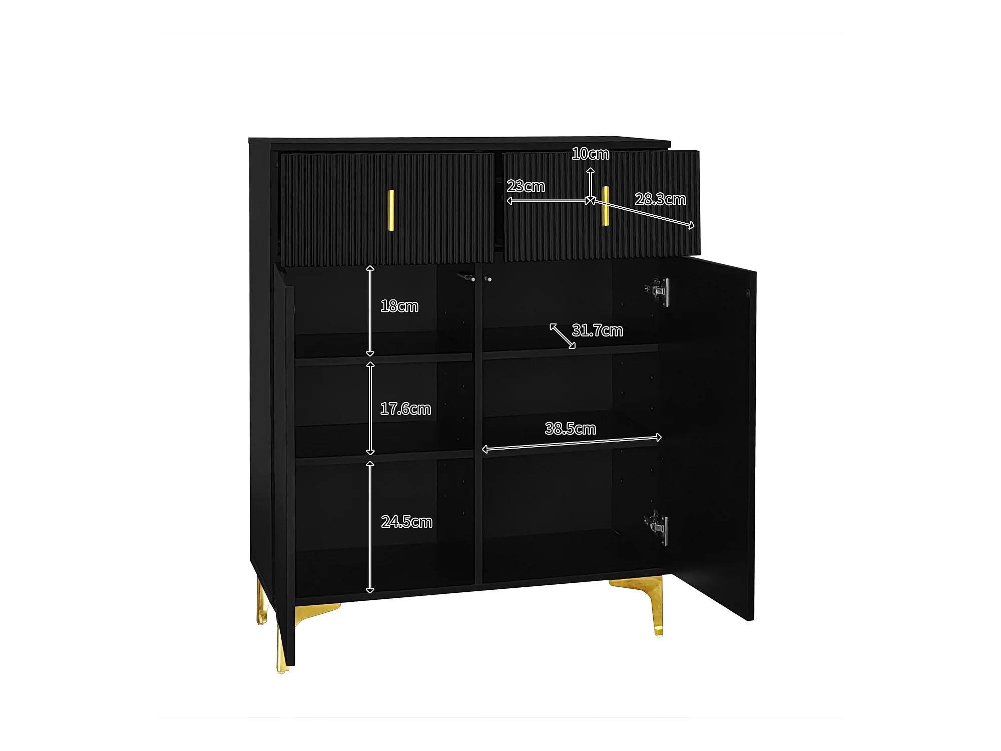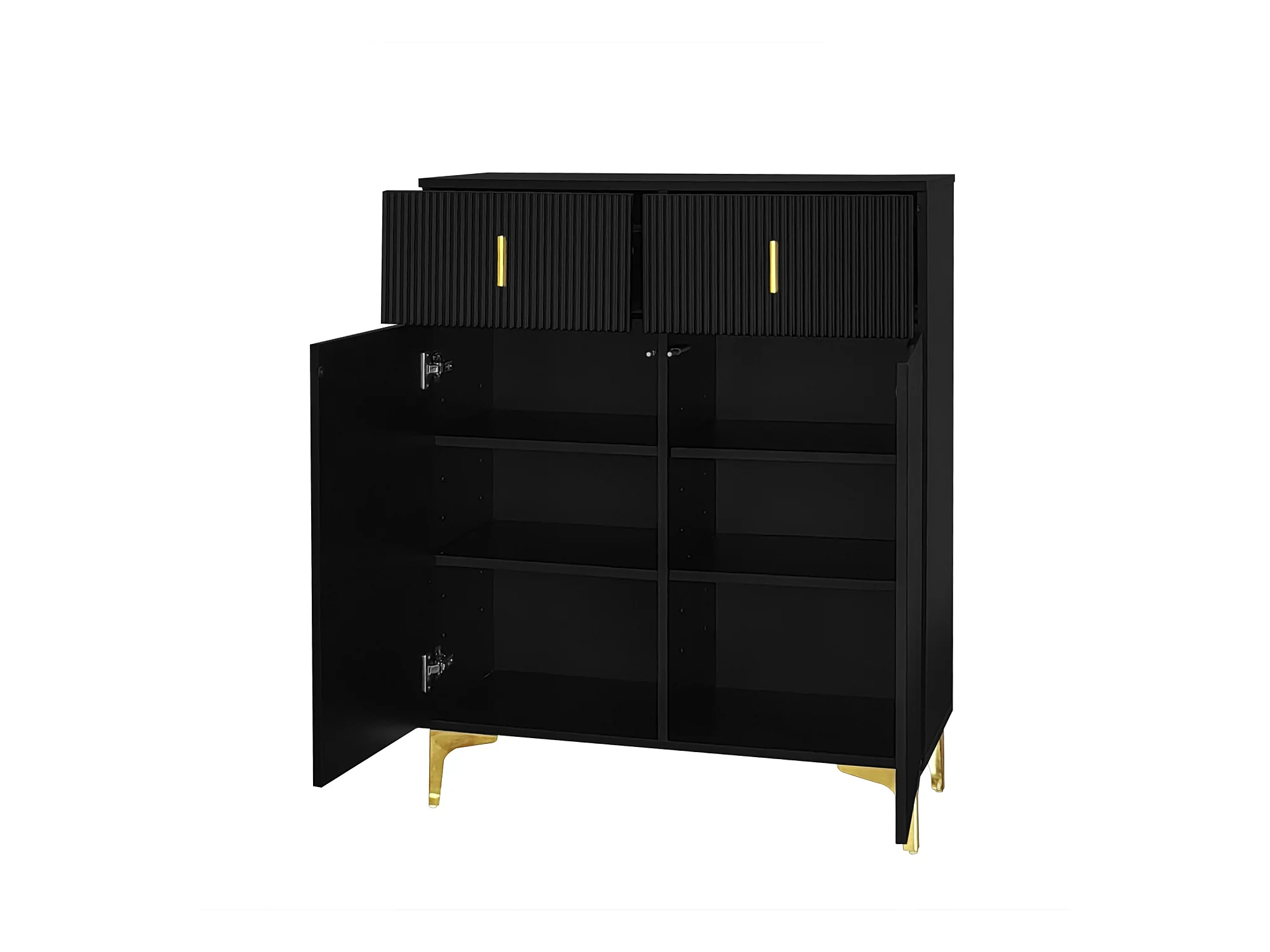 Meuble à chaussures noir avec tiroirs, portes texturées, étagères réglables, poignées et pieds dorés - design élégant
