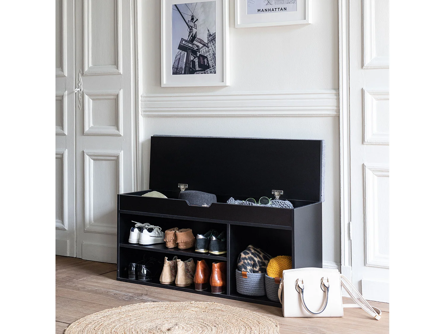 Meuble à chaussures trois casiers avec coffre noir ALAN - HAPPY GARDEN