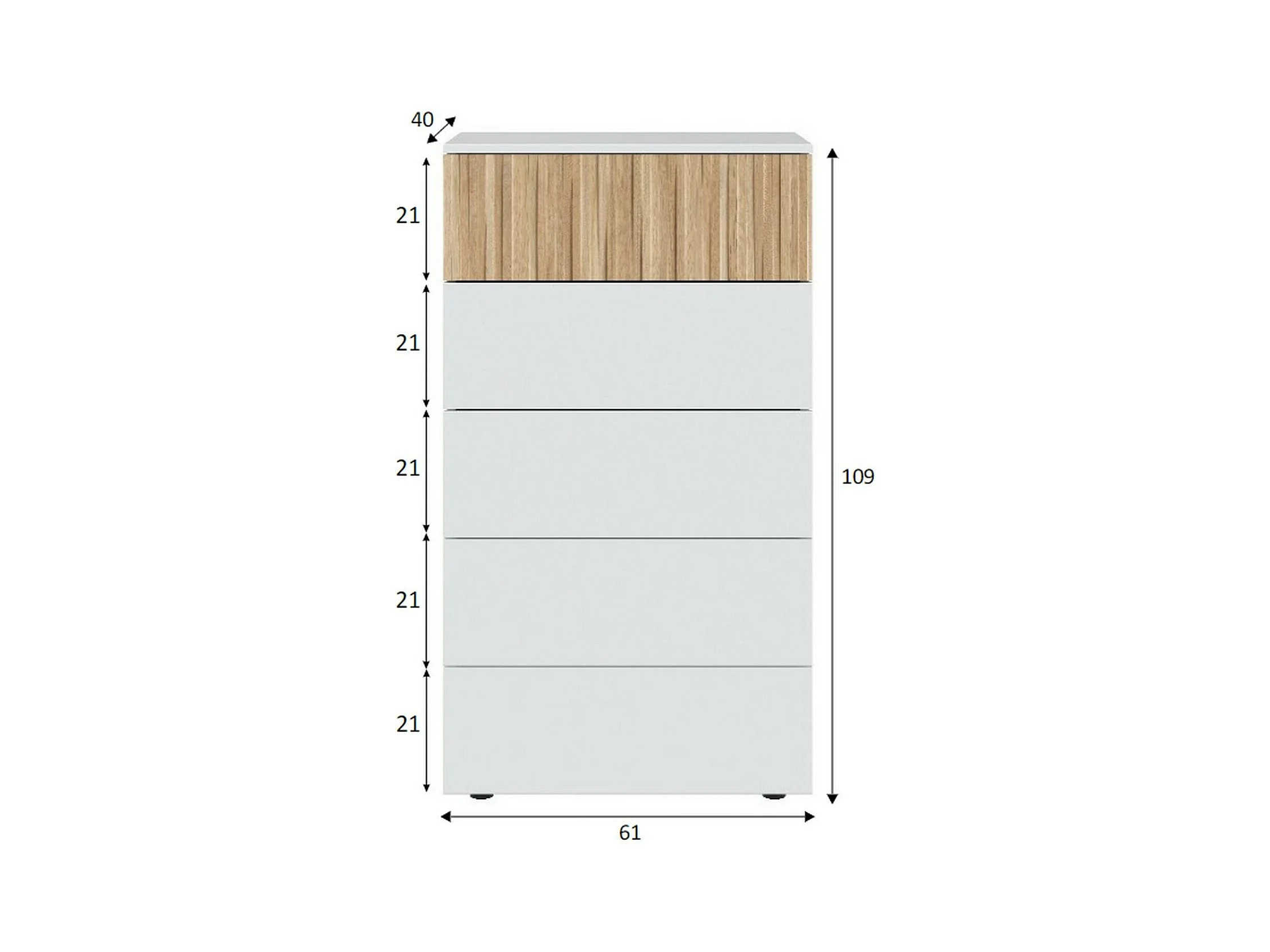 Commode Wynne, commode à 5 tiroirs, commode pour la chambre, commode moderne, 61x40h109 cm, blanc et chêne