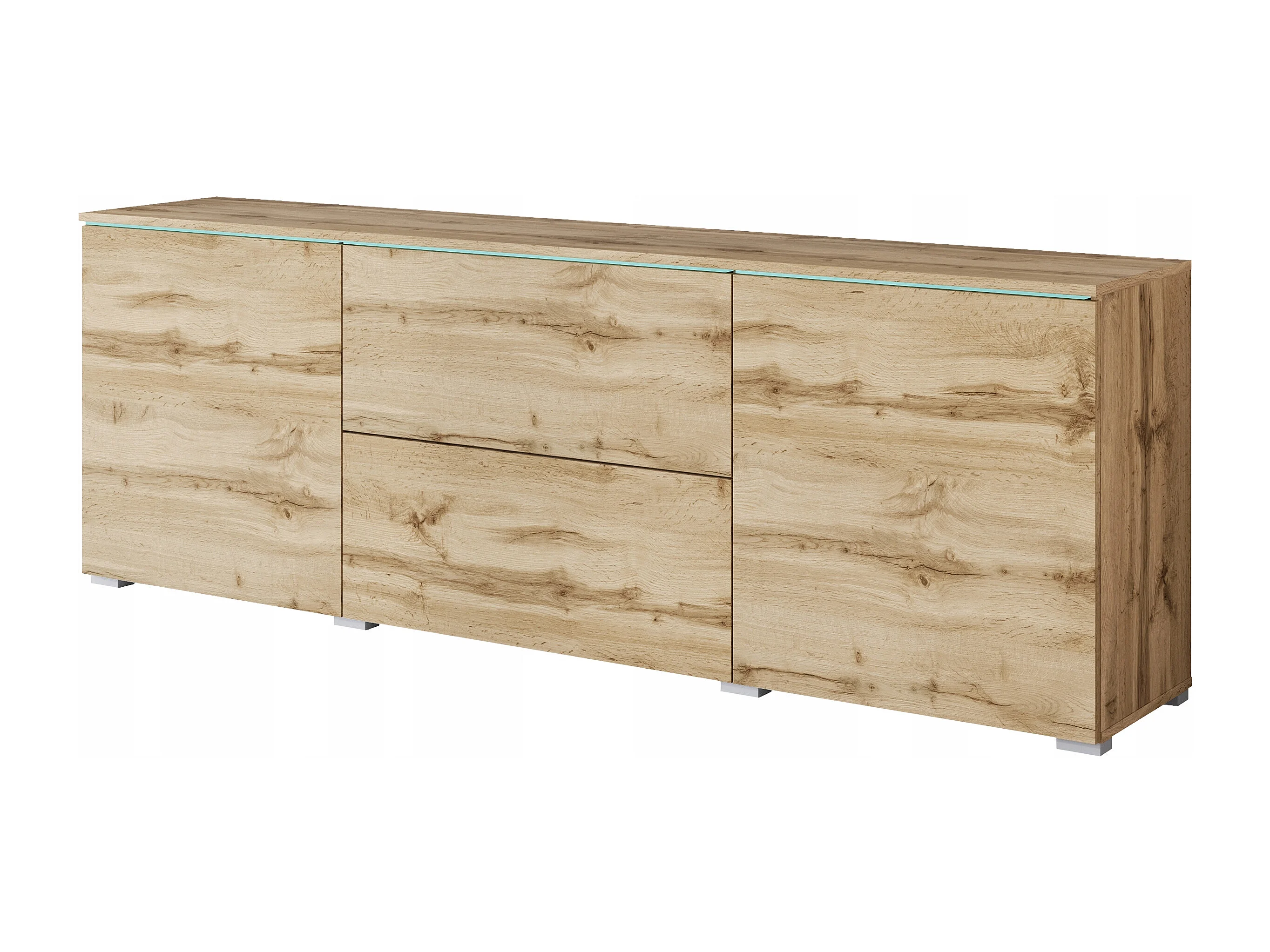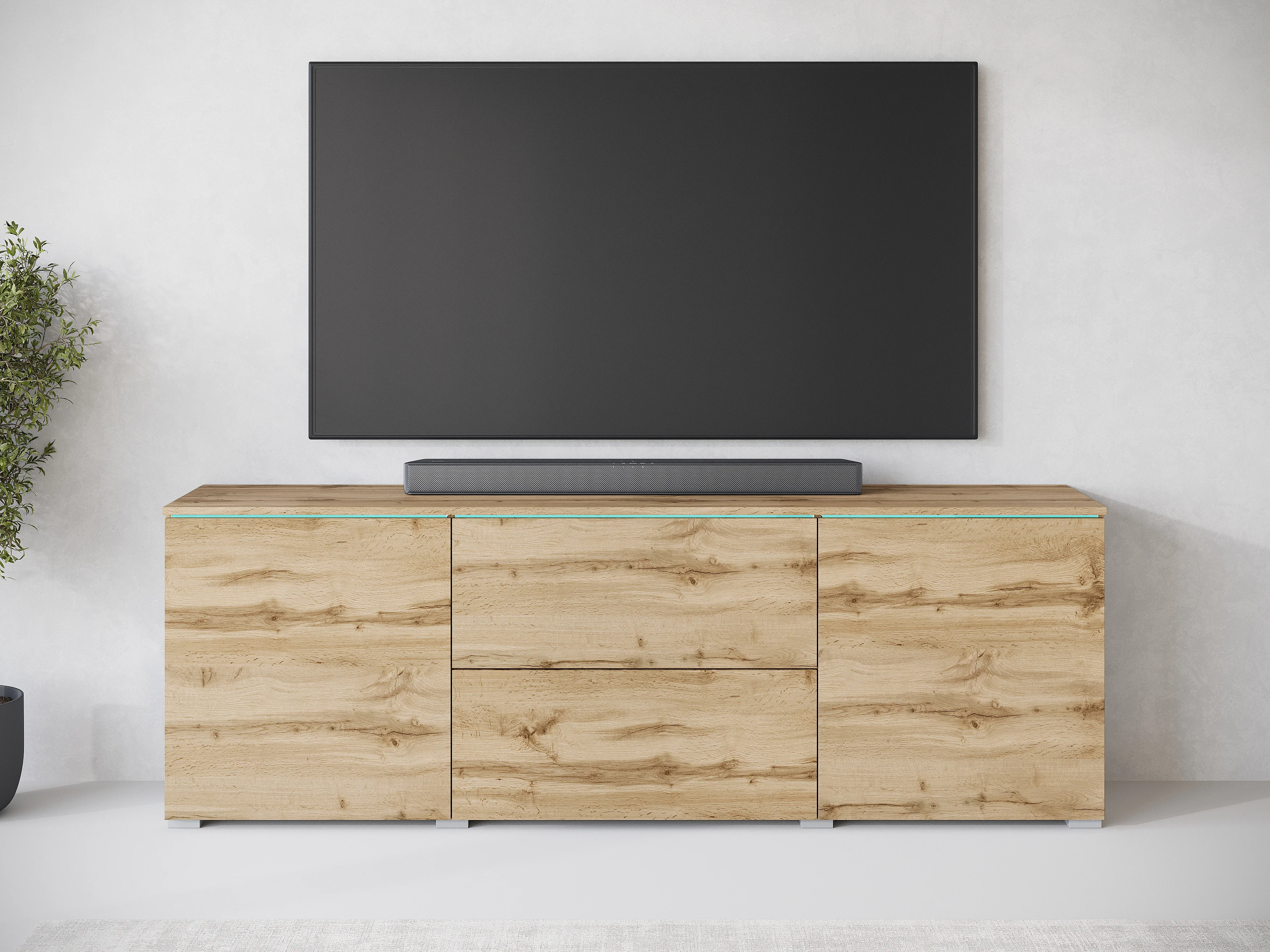 Meuble bas TV moderne 180 cm avec LED – meuble haut mat avec tiroirs et étagères, chêne wotan