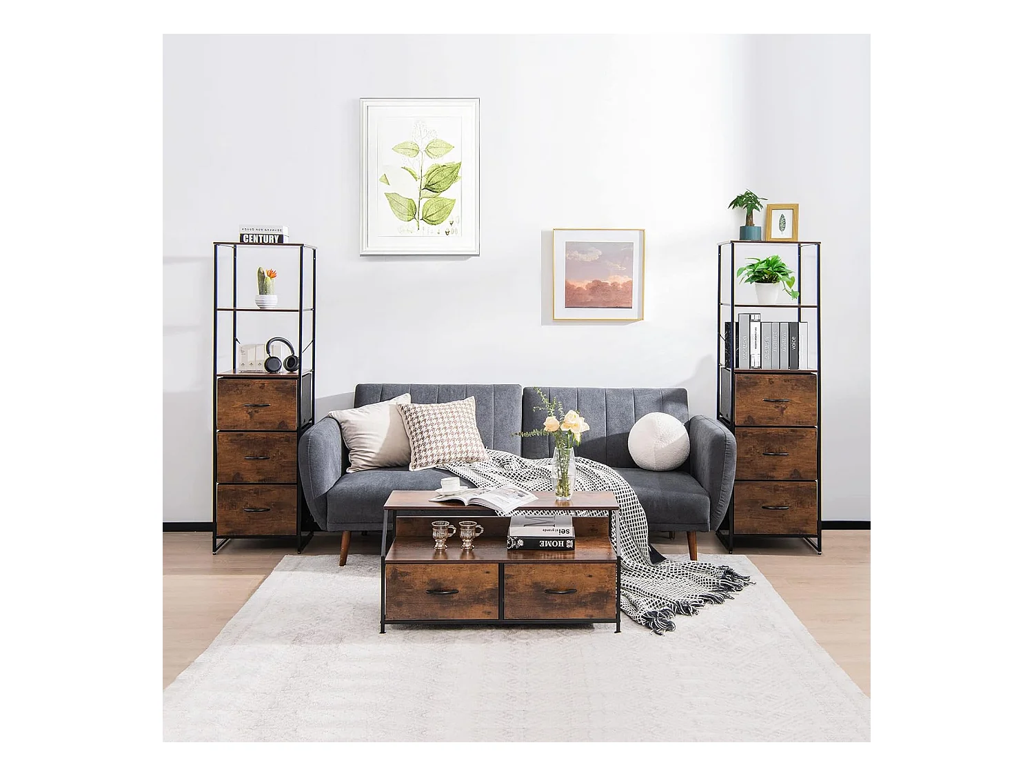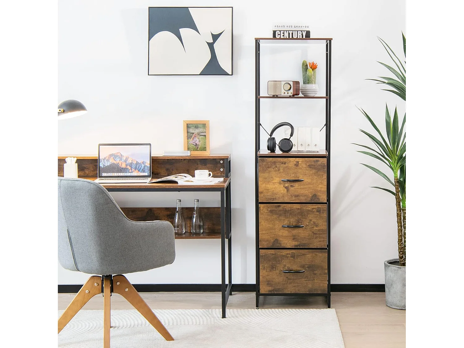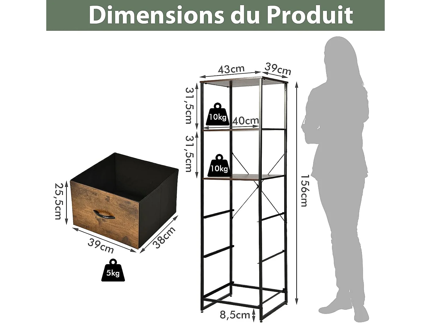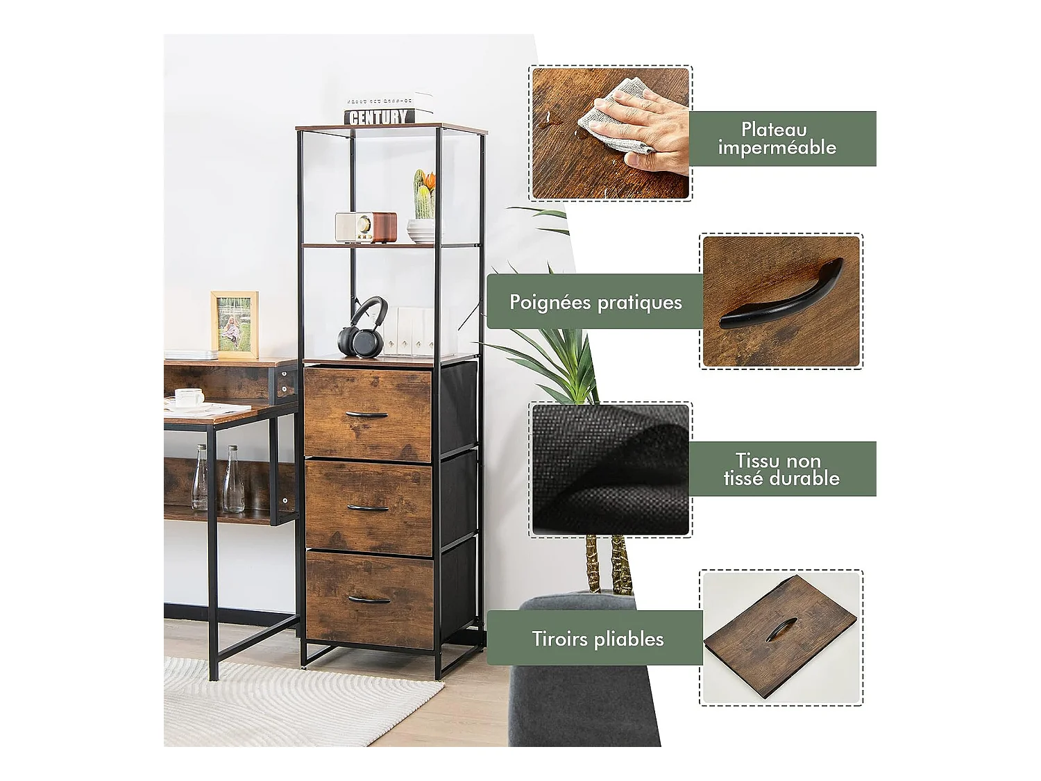 Meuble Colonne de Rangement, Etagères Bibliothèque 3 Tiroirs Pliables, Cadre en Métal, Style Industriel, Marron Rustique, 43 x 39 x 156 cm