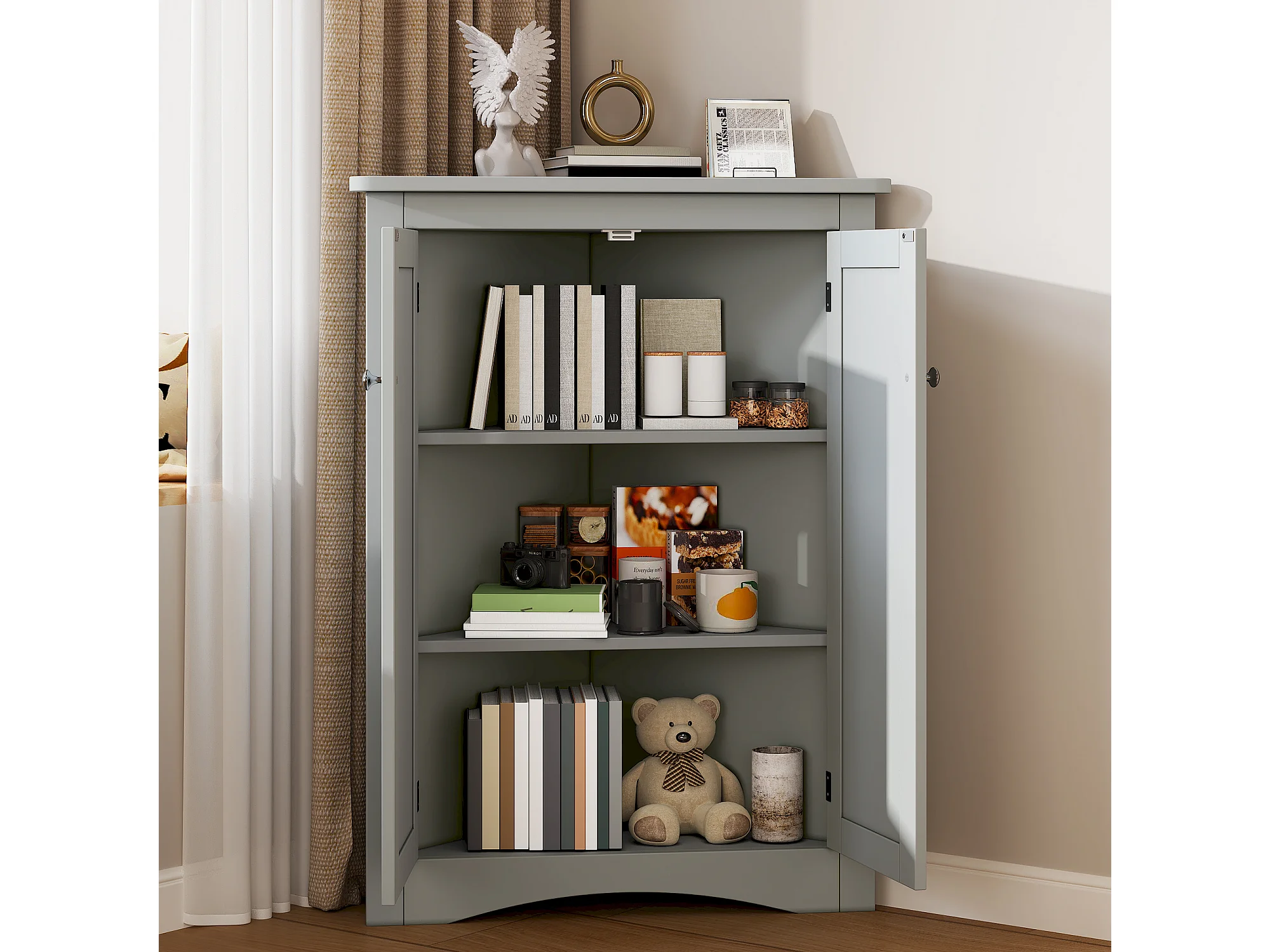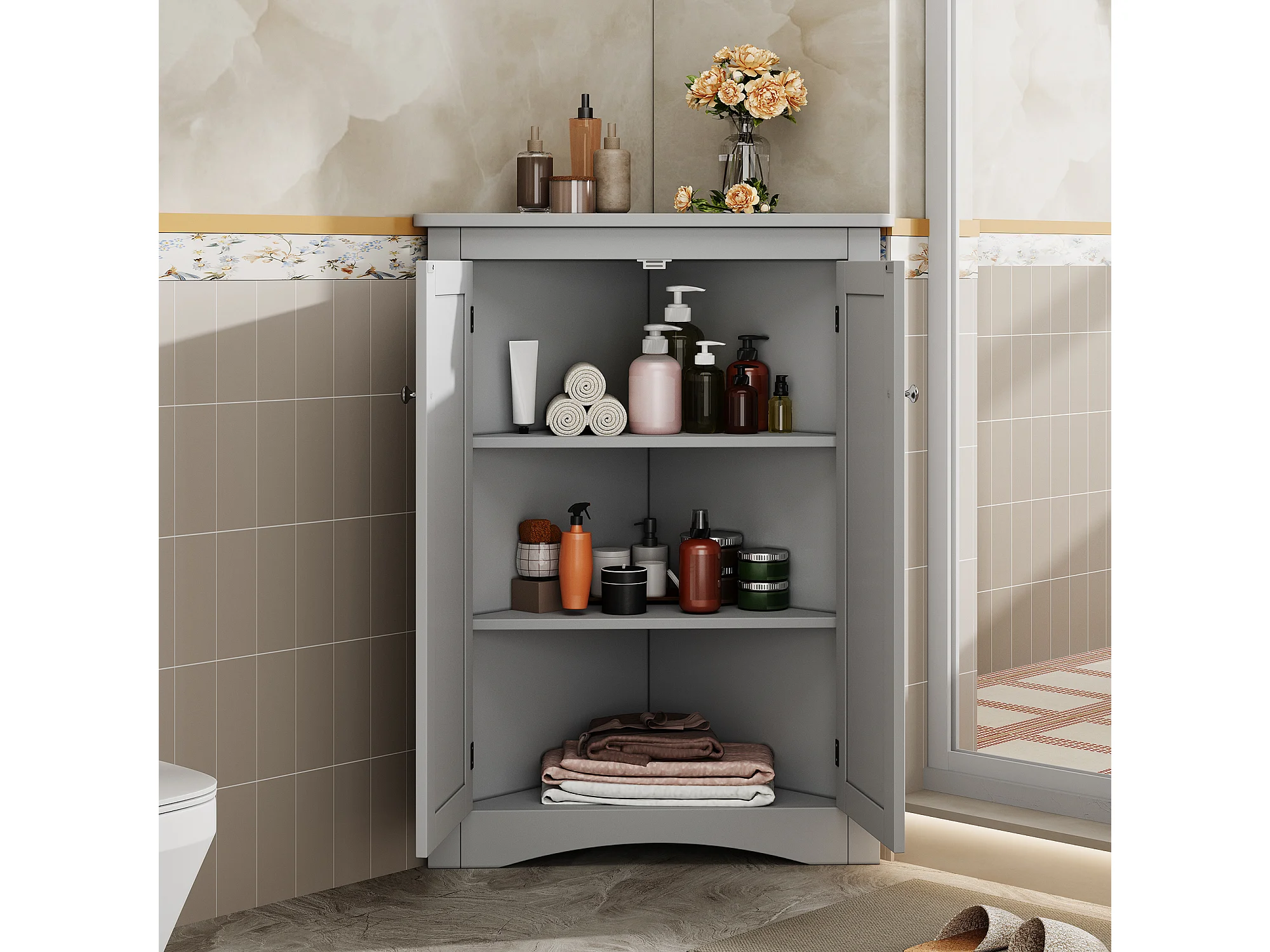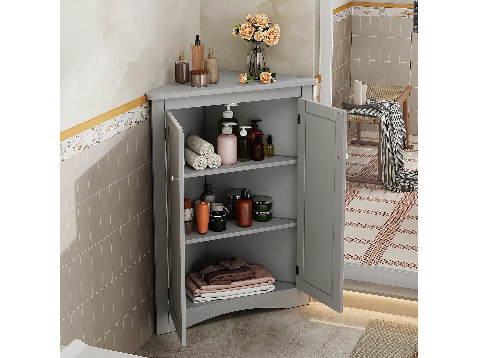 Meuble d'angle laquée pour salle de bain - 61.5 x 34.5 x 90 cm - avec 2 portes + 3 étagères - MDF - gris