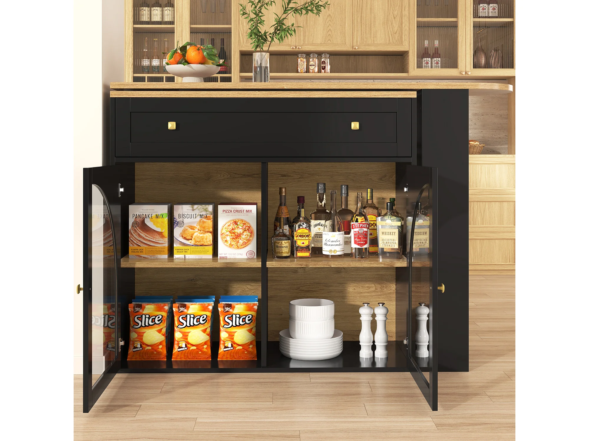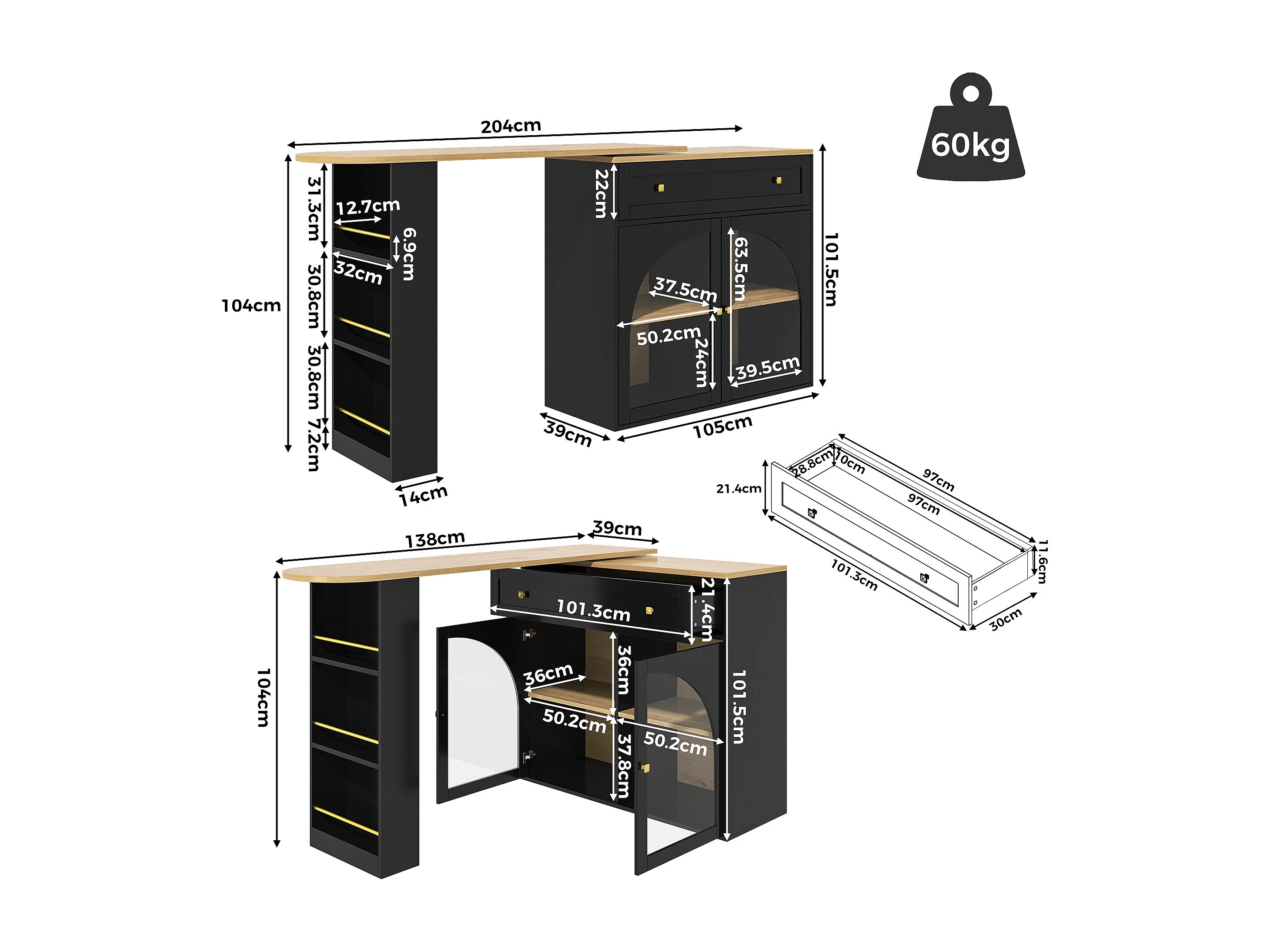 Meuble de bar extensible - 138-204 x 39 x 104 cm - table à manger rotative à 360 °- avec 2 portes + 2 tiroirs - MDF - noir