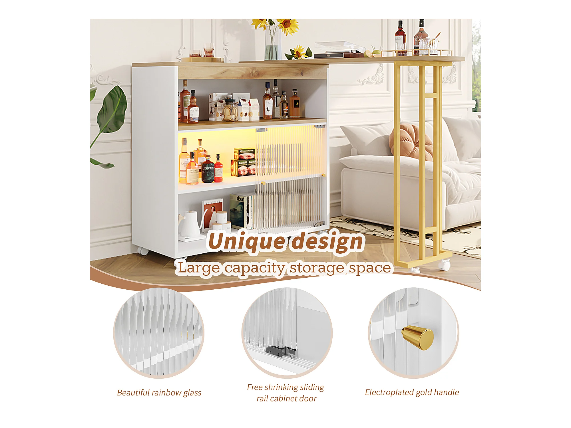 Meuble de bar extensible - 2 portes en verre coulissantes et 3 étagères - MDF plateau effet bois - LEDs - Naturel et blanc