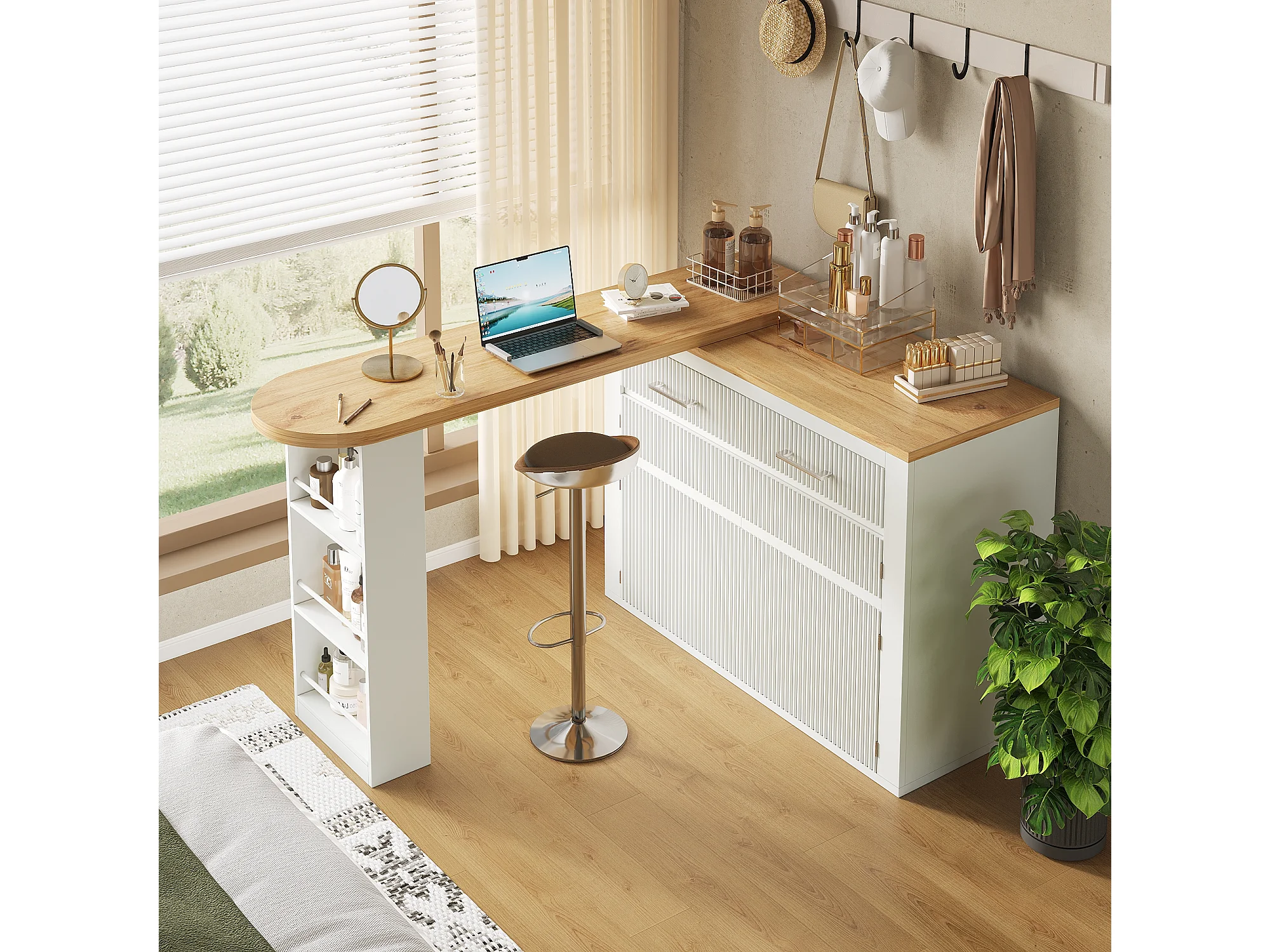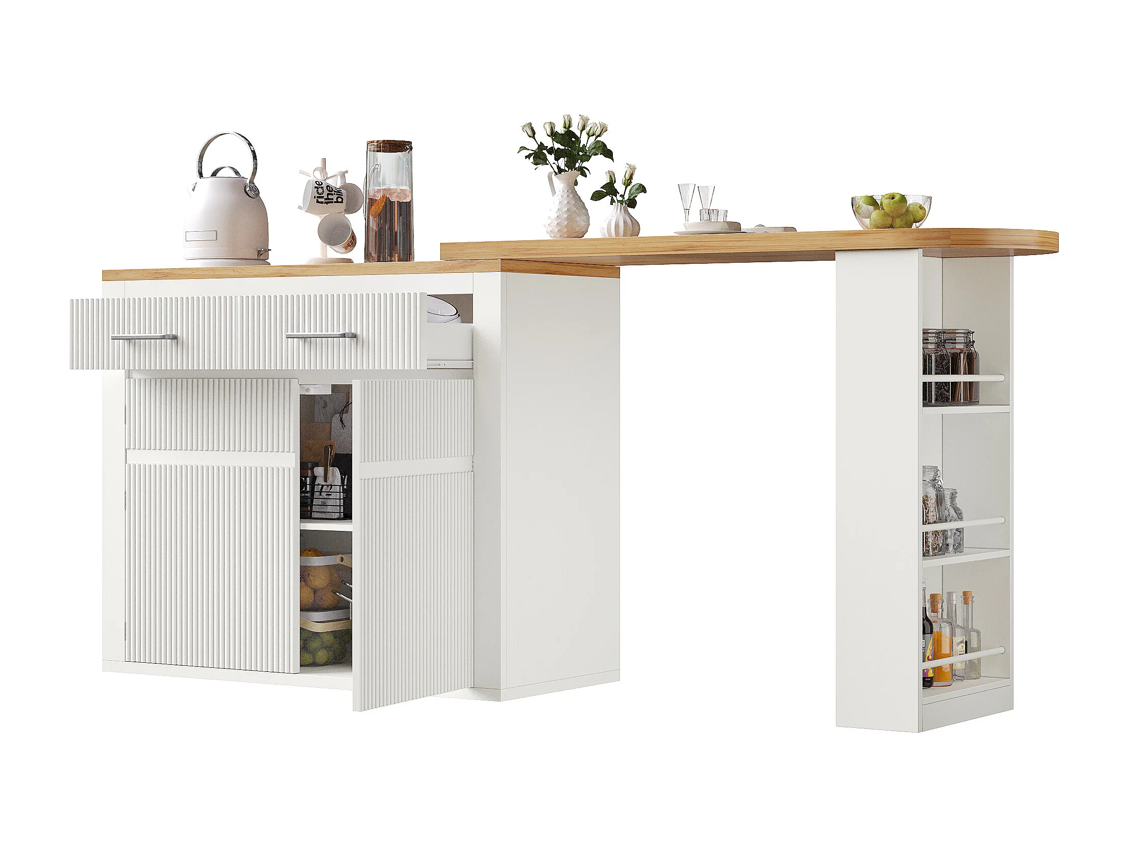 Meuble de bar extensible avec 2 tiroirs et 2 portes - Plateau extensible avec roulettes - Blanc et bois